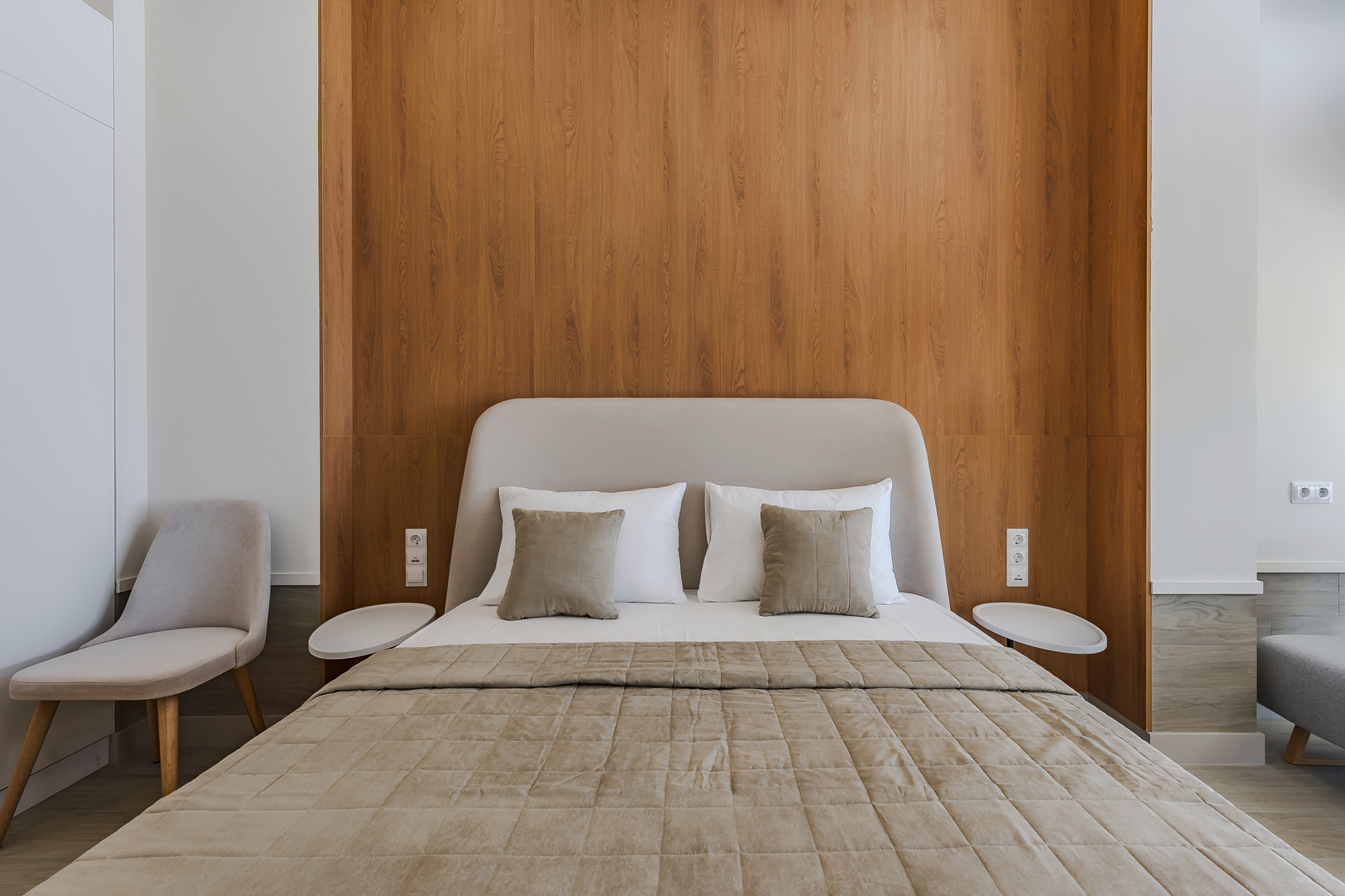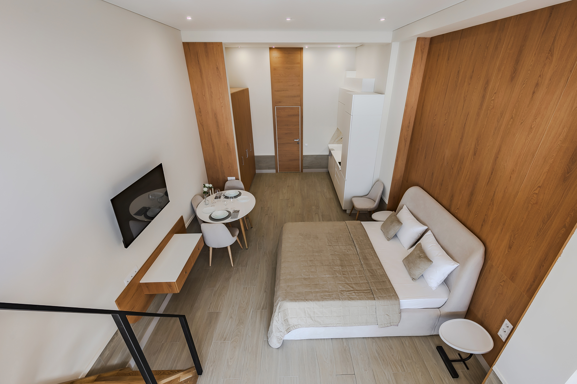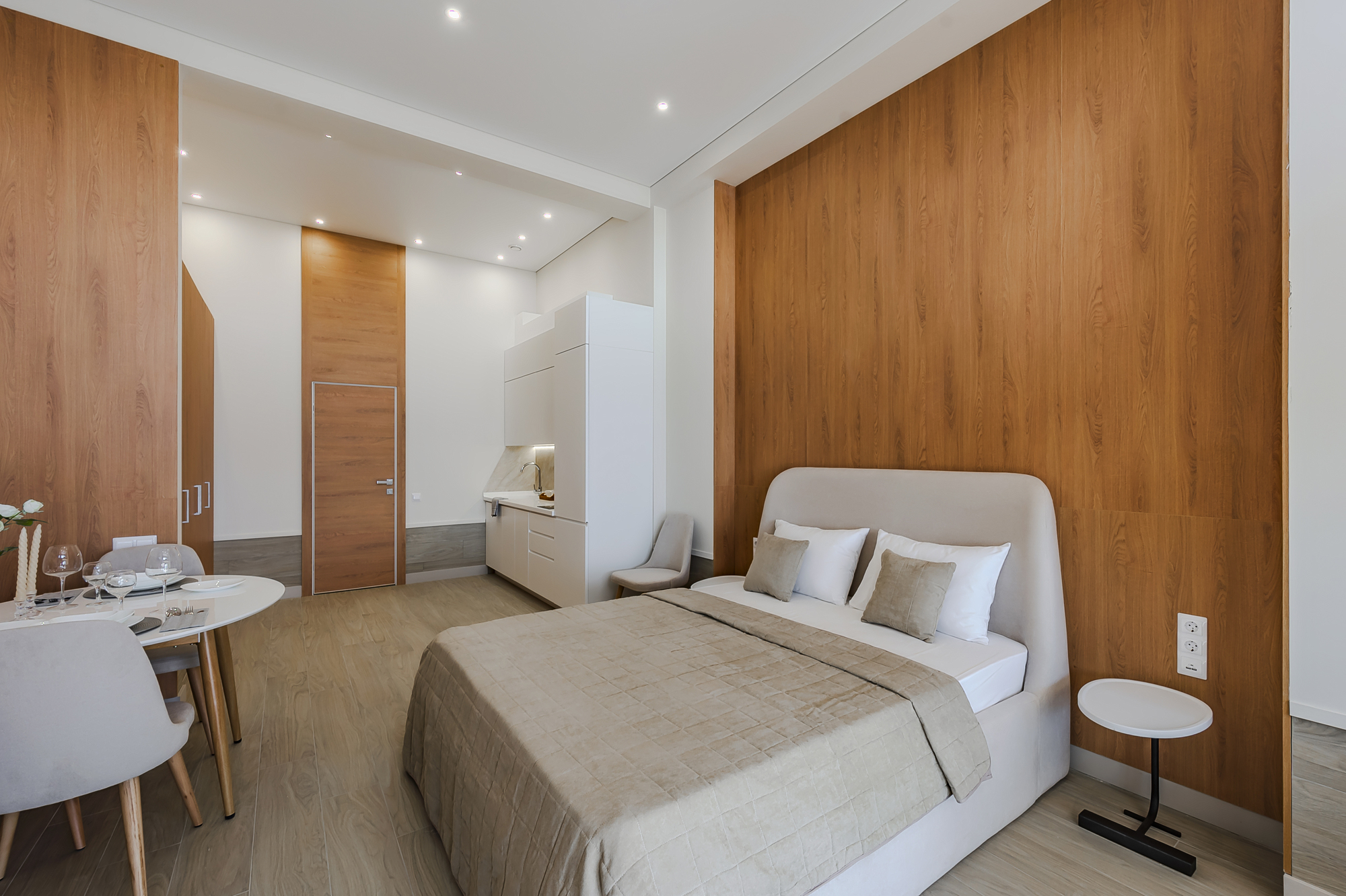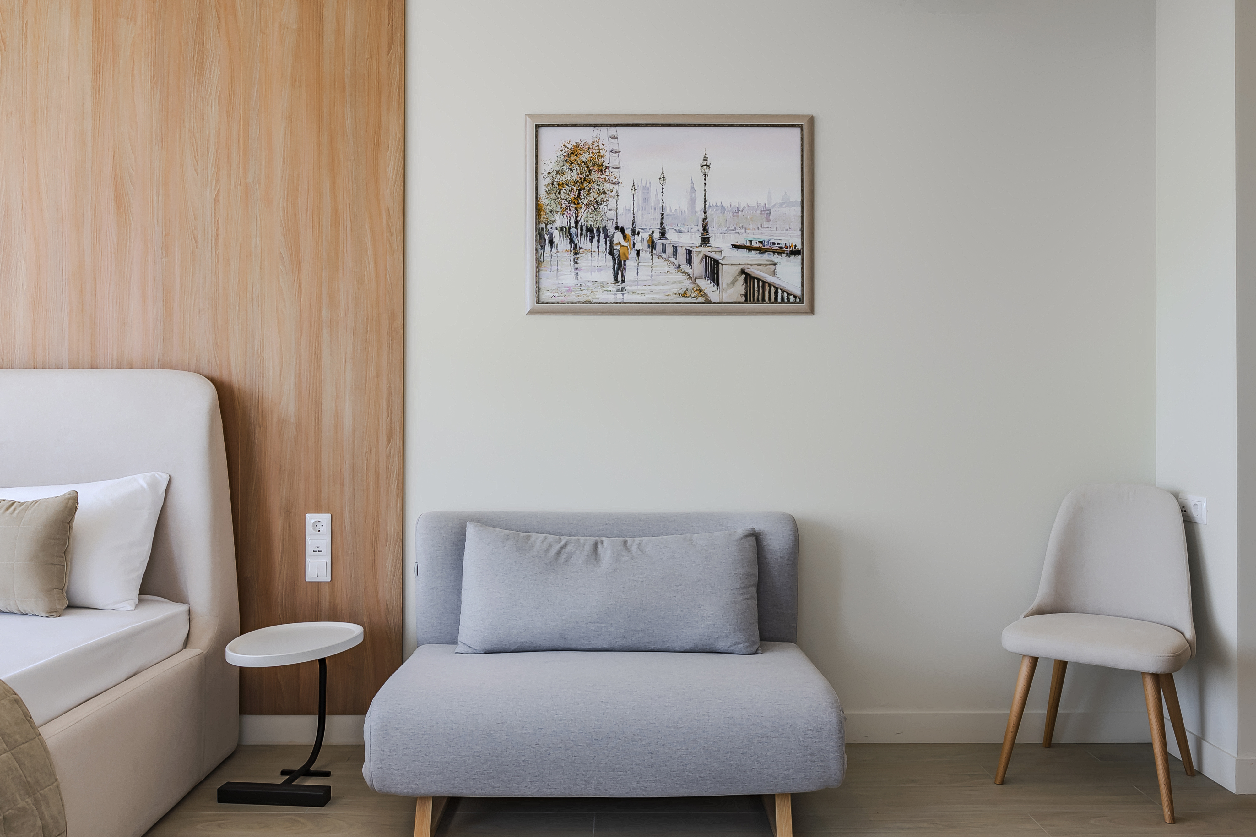В номере: диван раскладной, зеркало, кровать двуспальная, прикроватные столики, стол, стулья, шкаф, гладильная доска, кондиционер, набор посуды, плита электрическая, стиральная машина, телевизор ЖК, утюг, холодильник, чайная станция