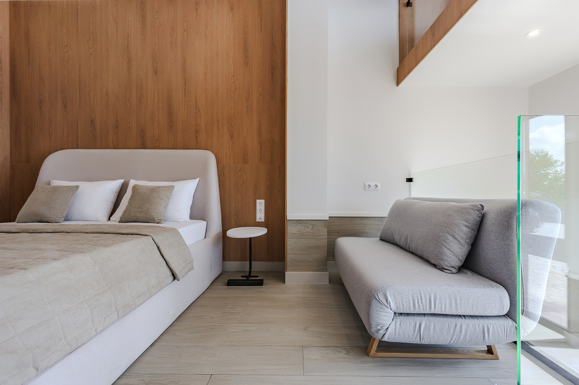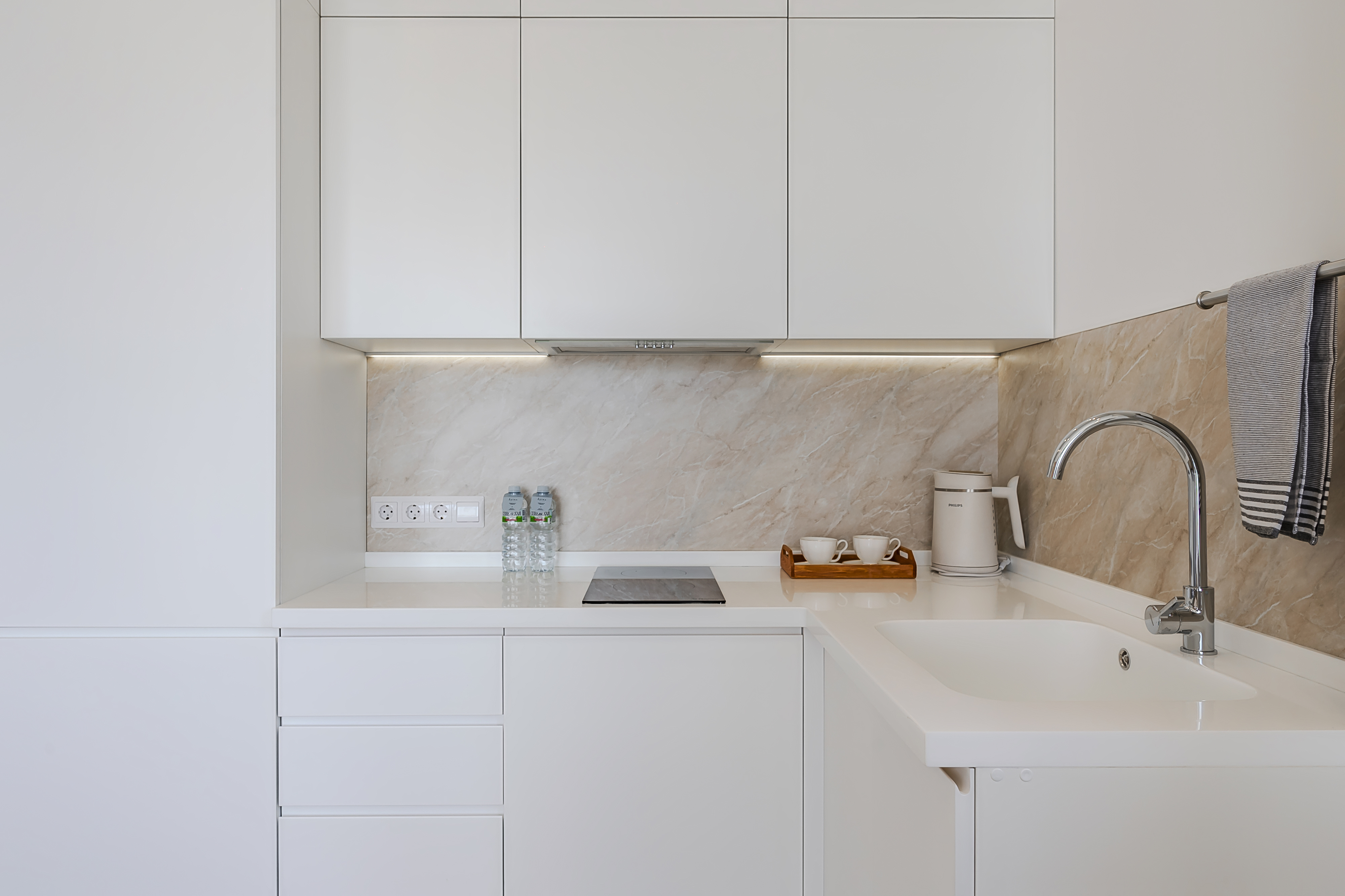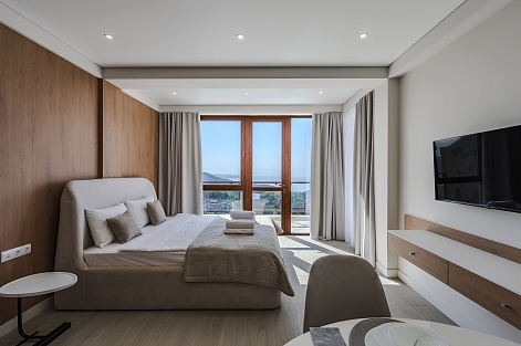 В номере: диван раскладной, зеркало, кровать двуспальная, прикроватные столики, стол, стулья, шкаф, гладильная доска, кондиционер, набор посуды, плита электрическая, пляжные полотенца, стиральная машина, телевизор ЖК, утюг, холодильник, чайная станция