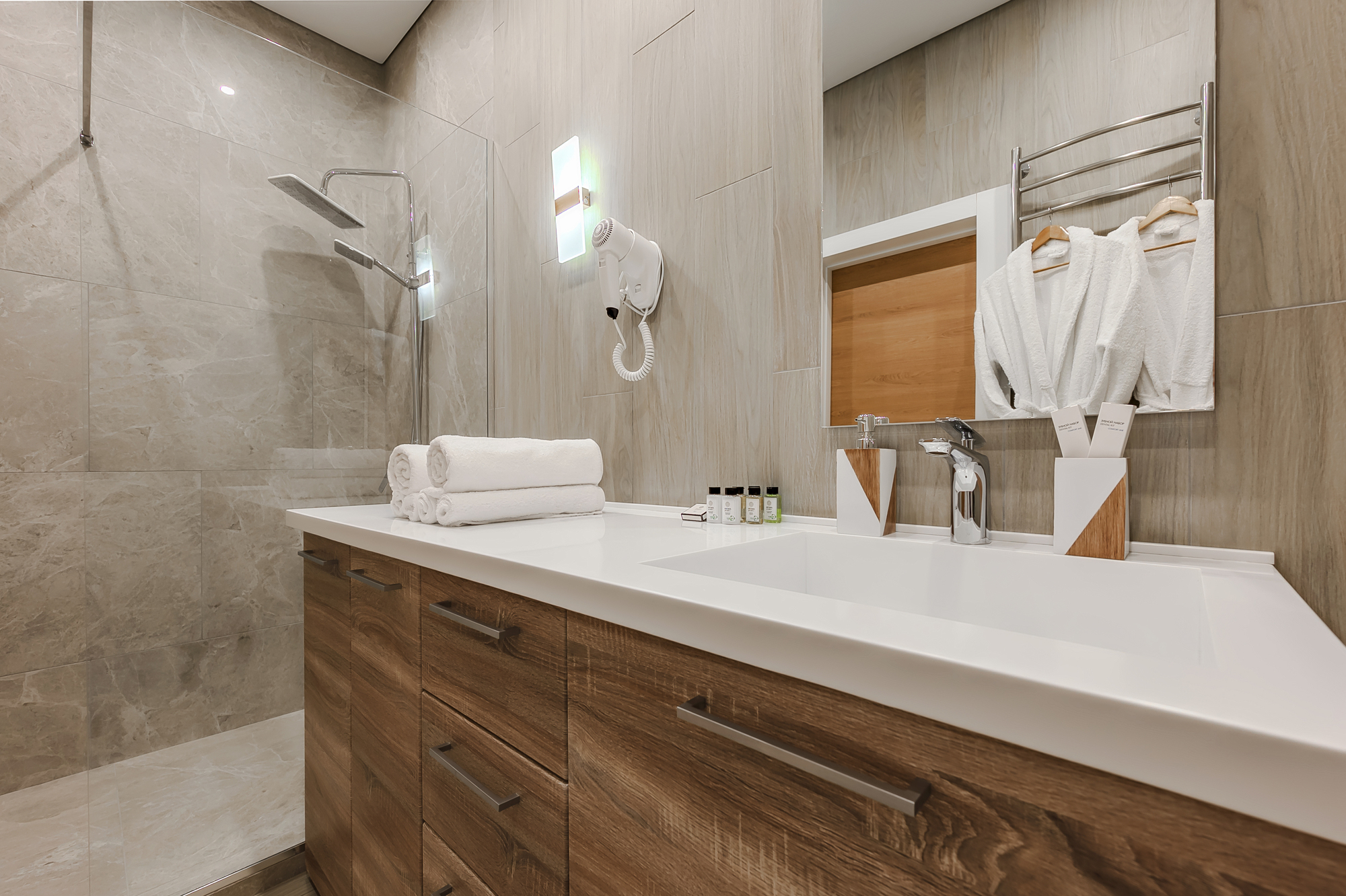 Санузел: с душевой кабиной, тапочки, туалетные принадлежности, фен, халат