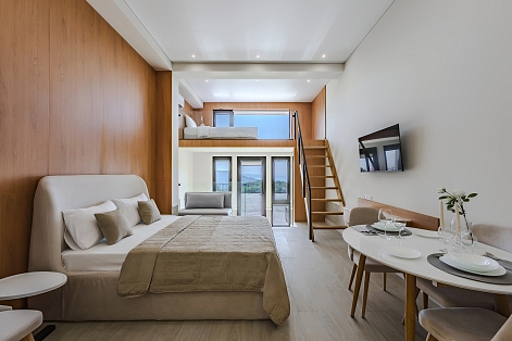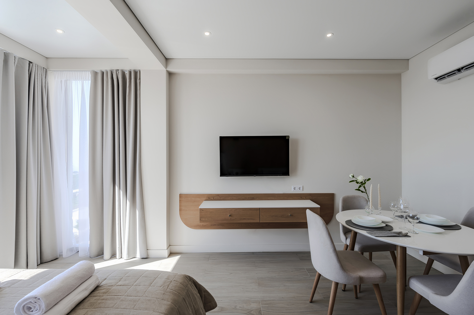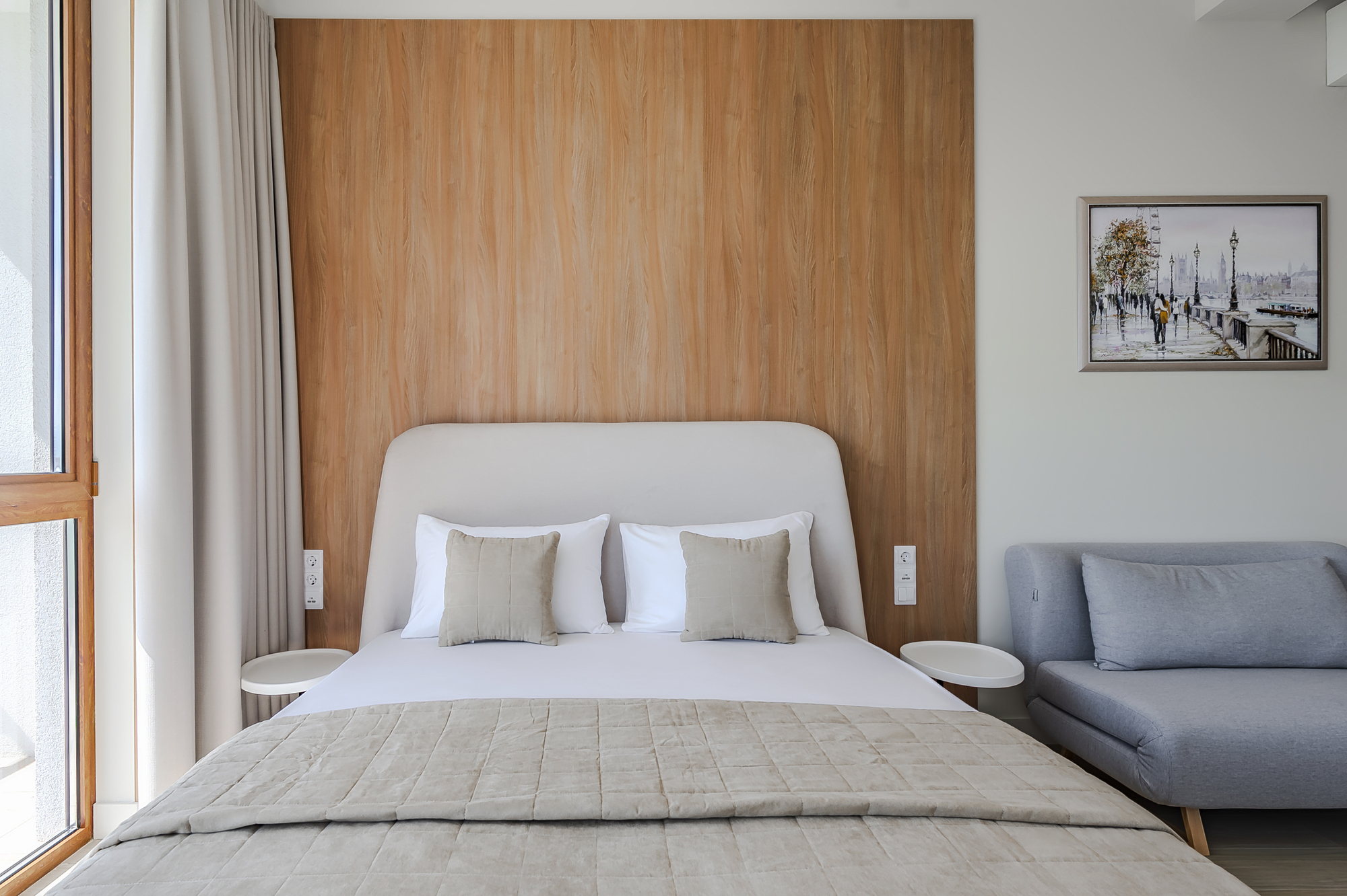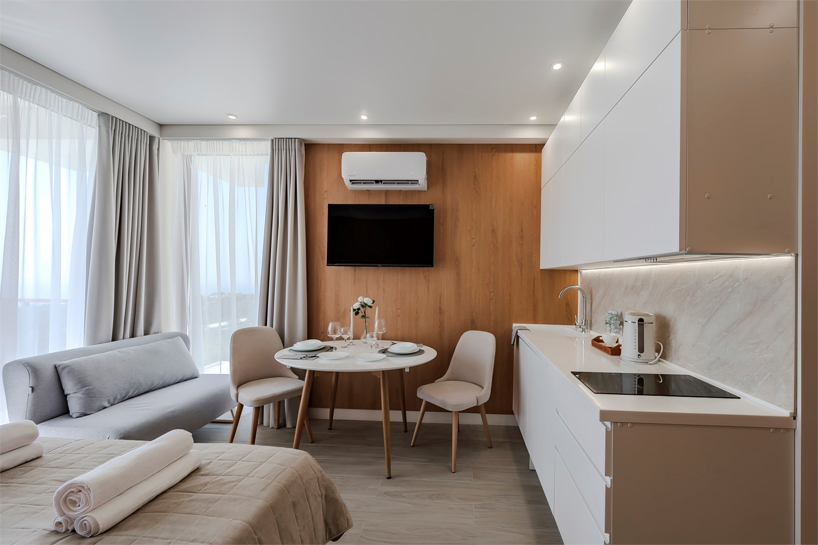 В номере: диван раскладной, зеркало, кровать двуспальная, прикроватные столики, стол, стулья, шкаф, гладильная доска, кондиционер, набор посуды, плита электрическая, пляжные полотенца, стиральная машина, телевизор ЖК, утюг, чайная станция