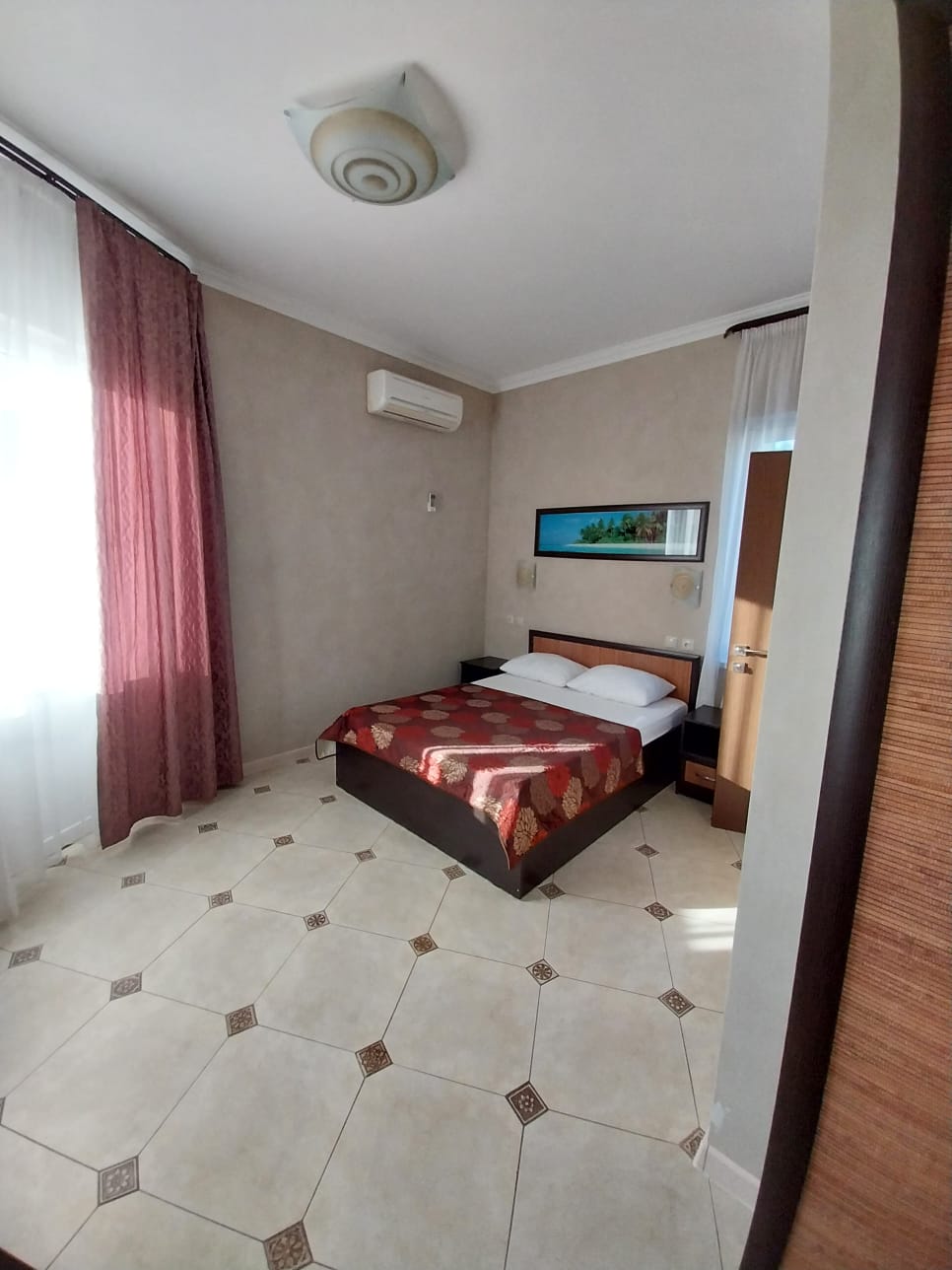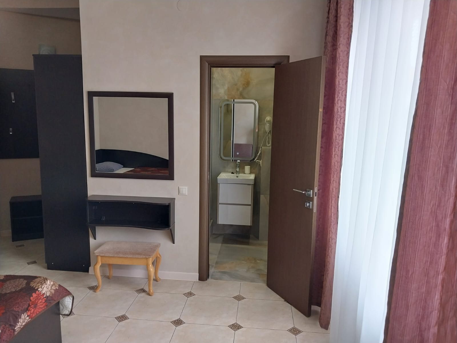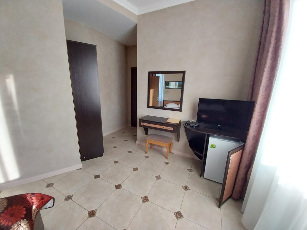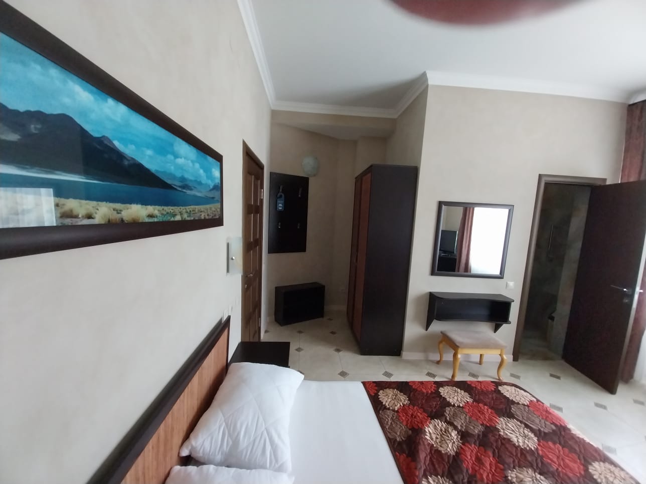 В номере: вешалка, зеркало, кровать двуспальная, прикроватные тумбочки, столик туалетный, шкаф, кондиционер, телевизор, холодильник, электрочайник
