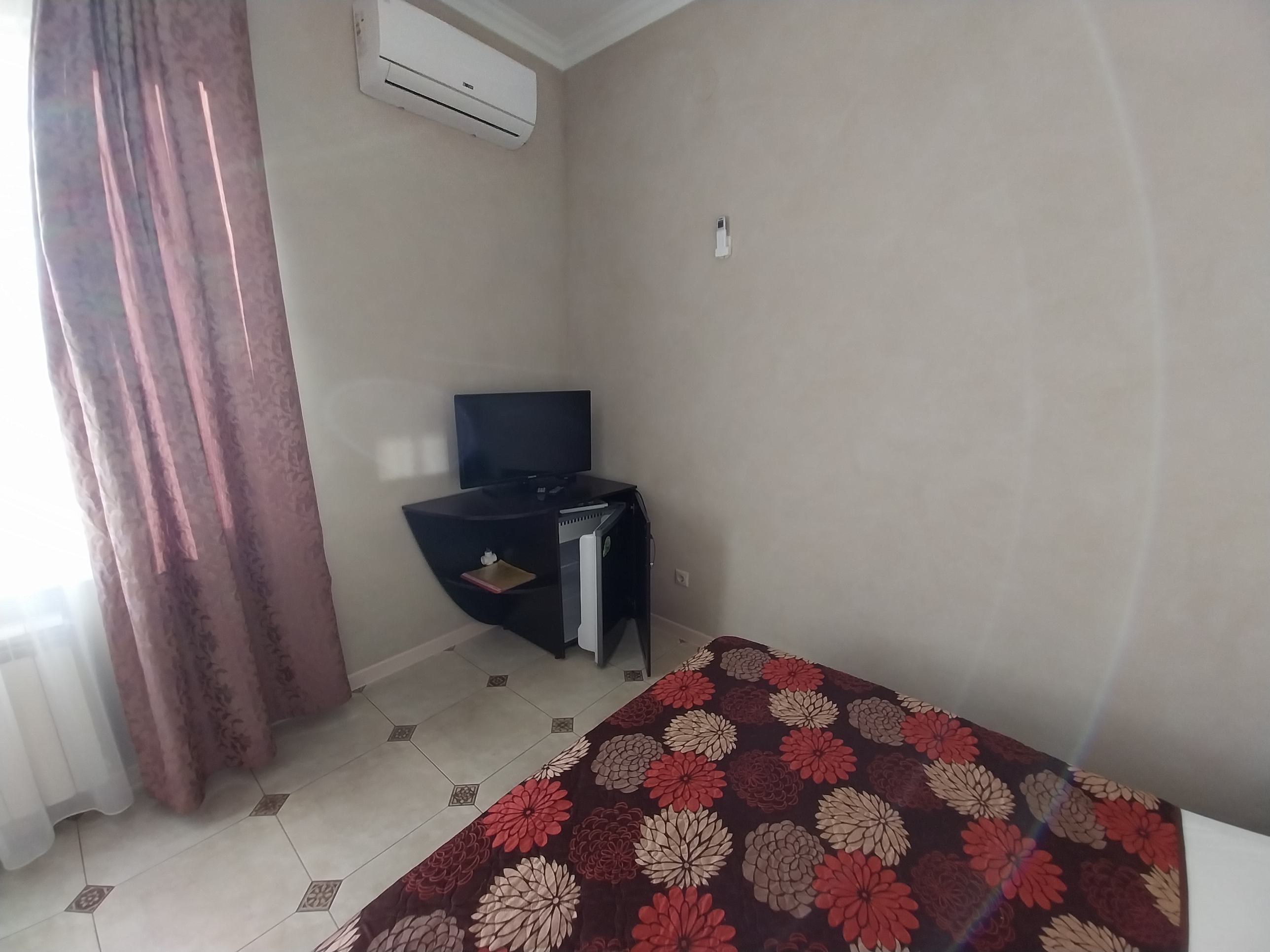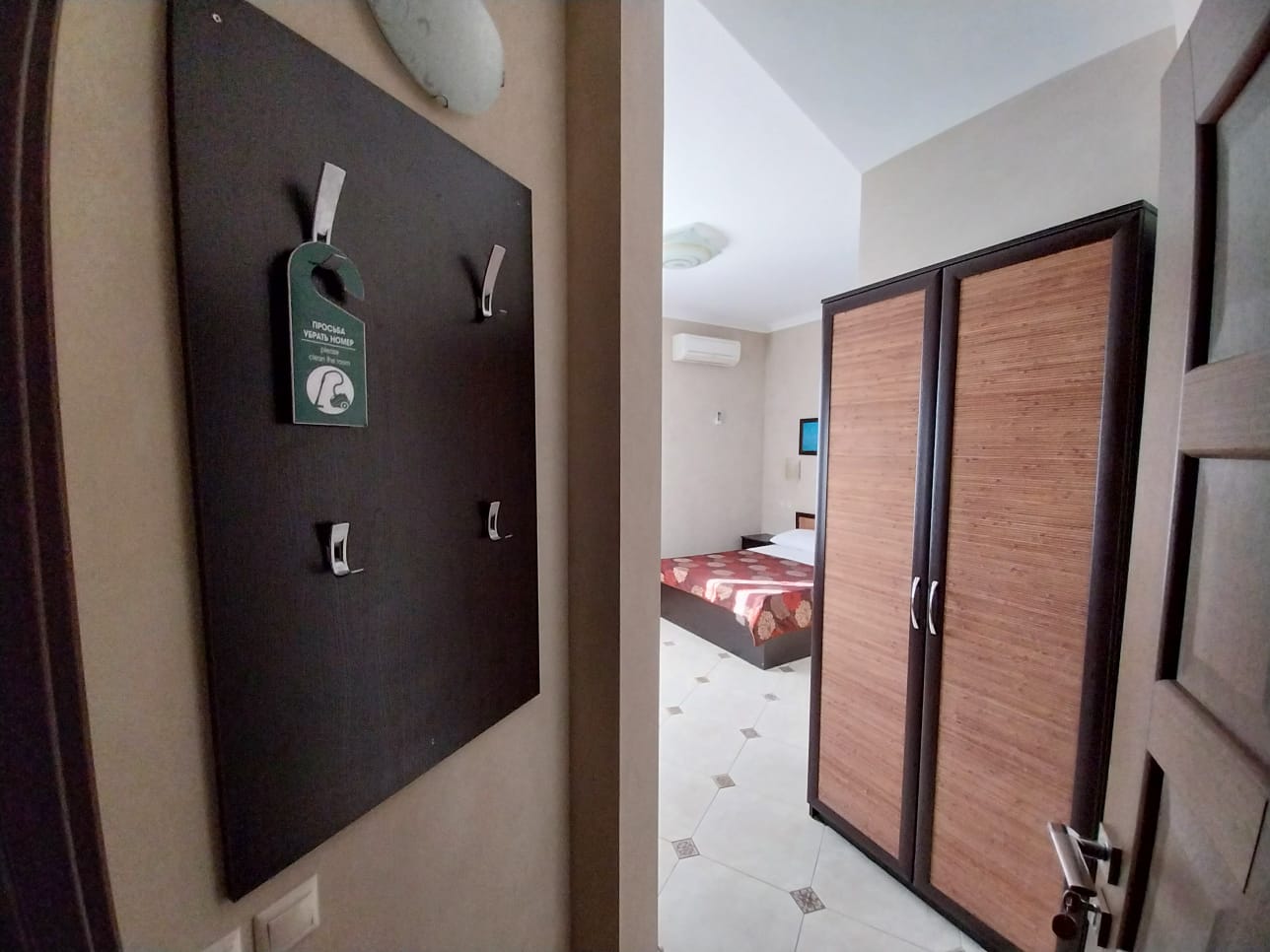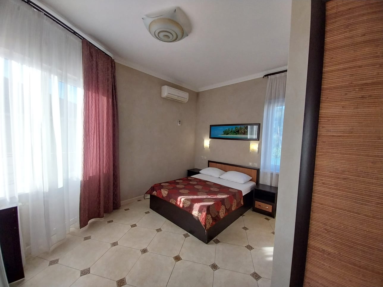 В номере: вешалка, зеркало, кровать двуспальная, прикроватные тумбочки, столик туалетный, шкаф, кондиционер, телевизор, холодильник, электрочайник