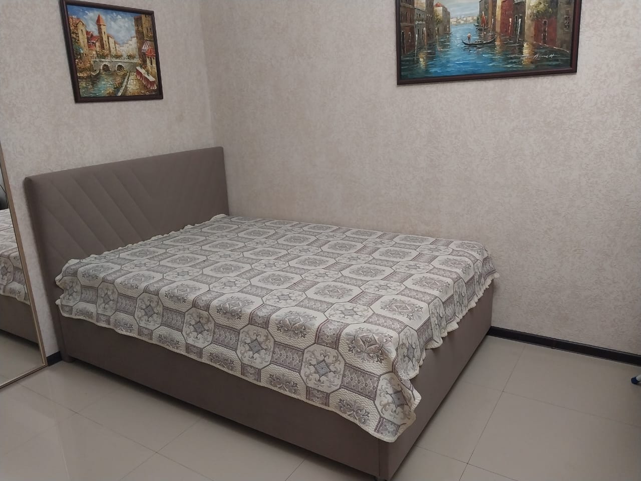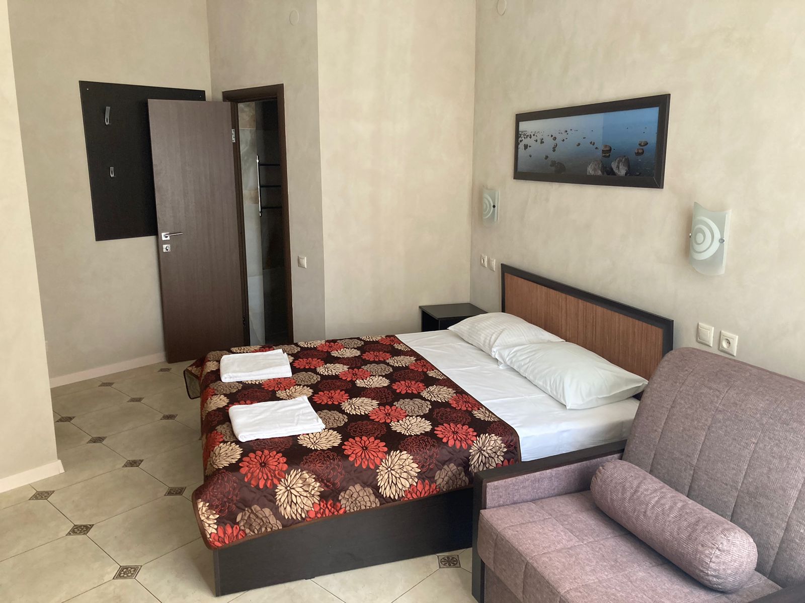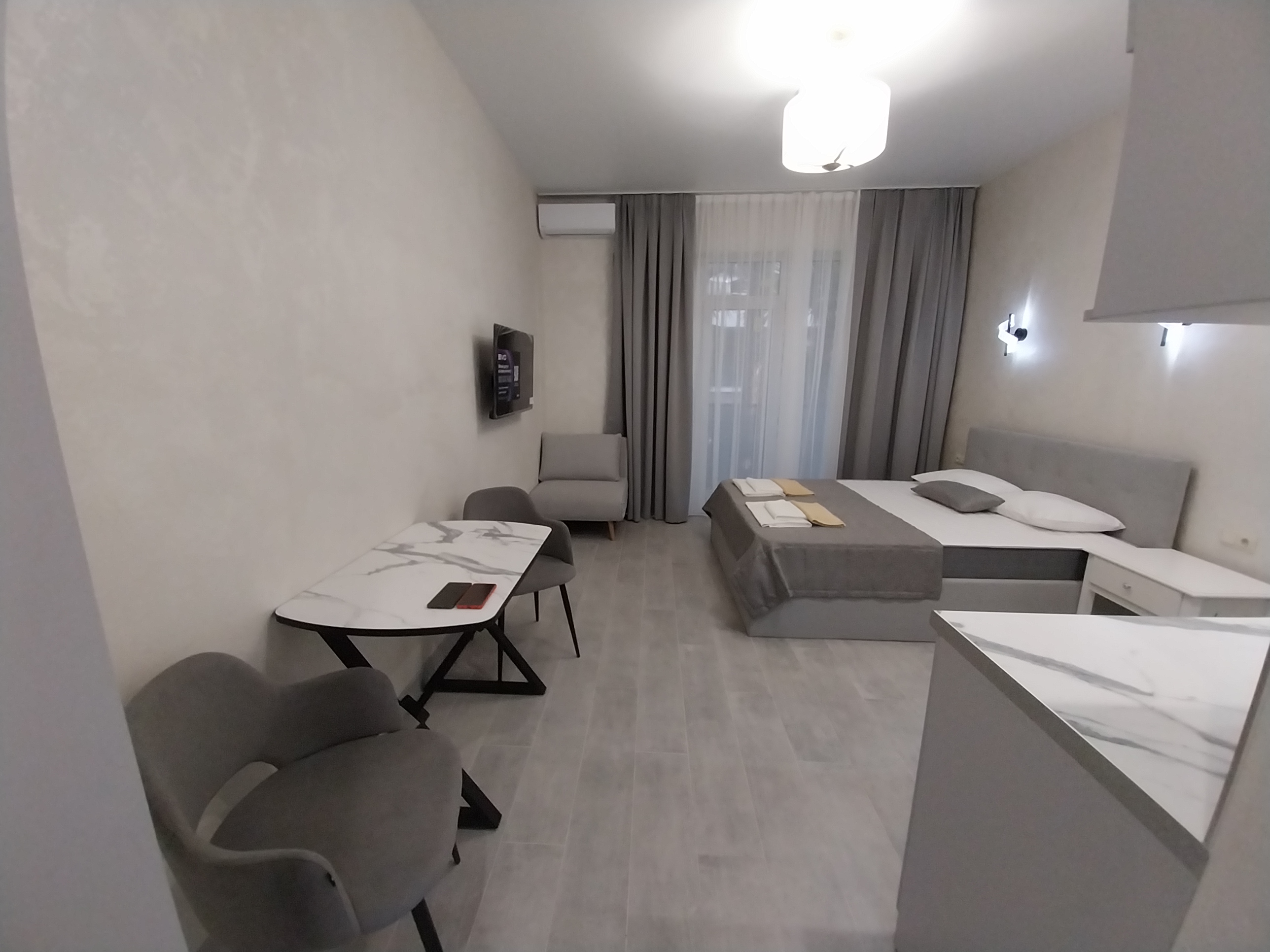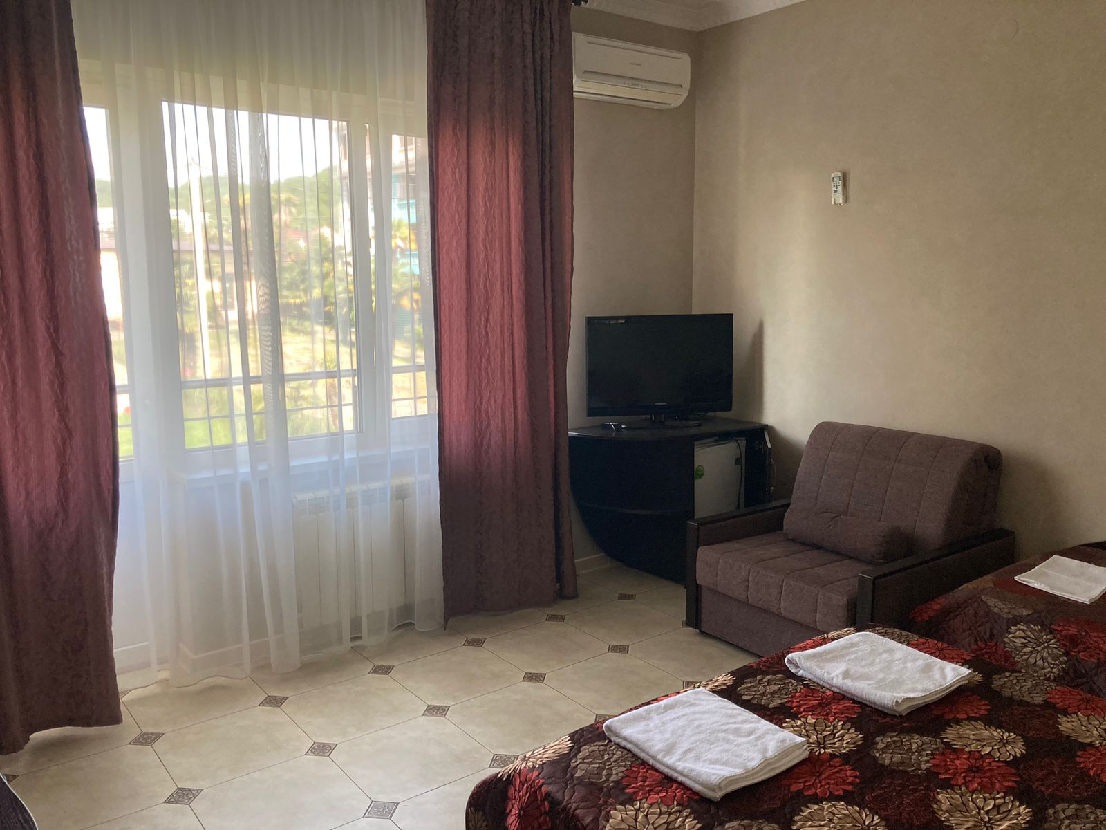 В номере: вешалка, зеркало, кровать двуспальная, прикроватные тумбочки, столик туалетный, шкаф, кондиционер, телевизор, холодильник, электрочайник