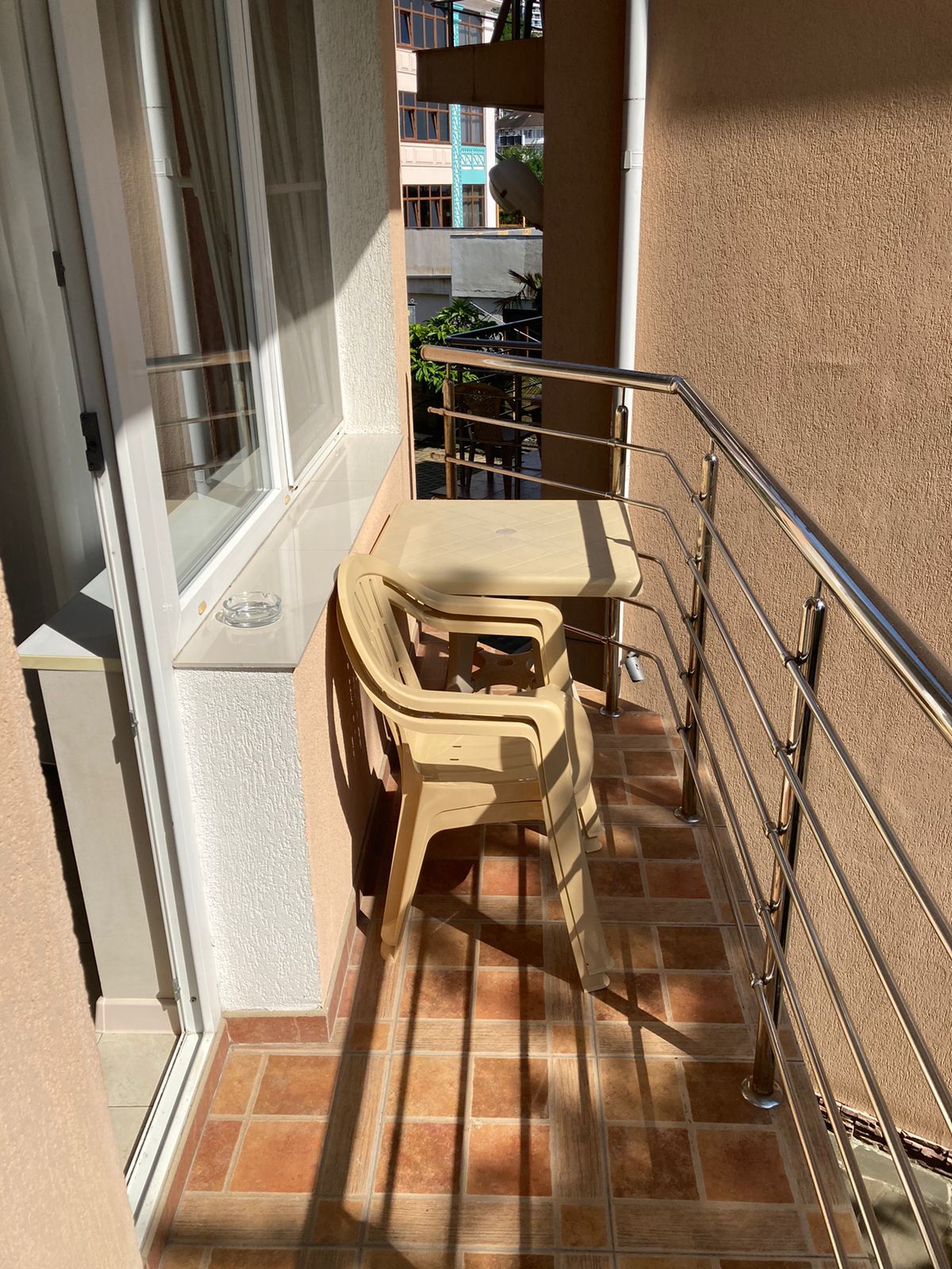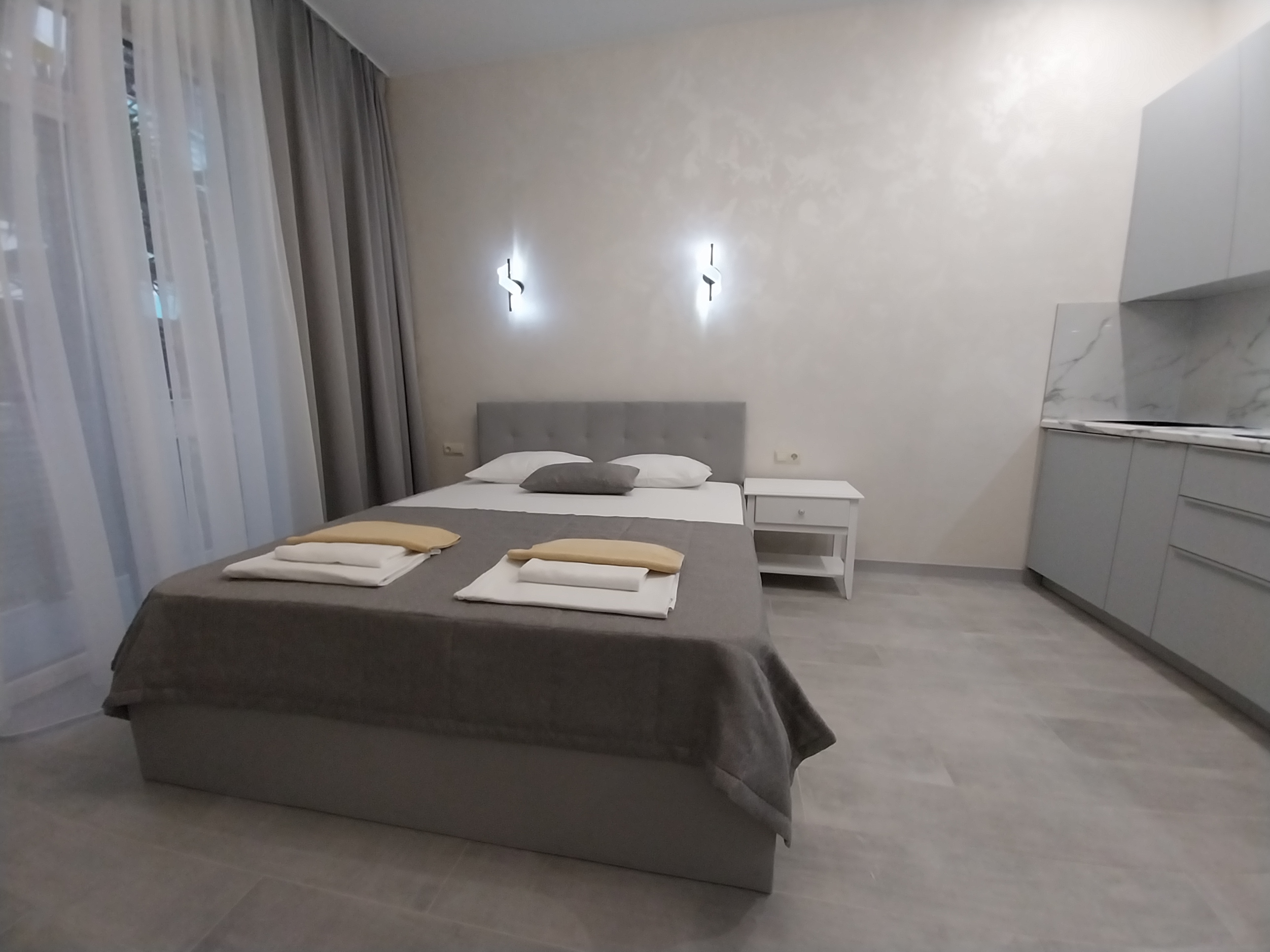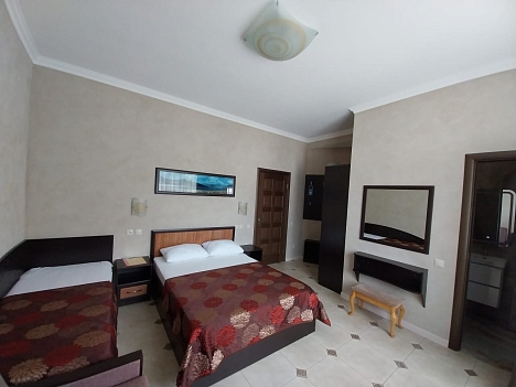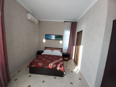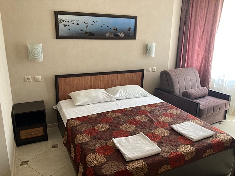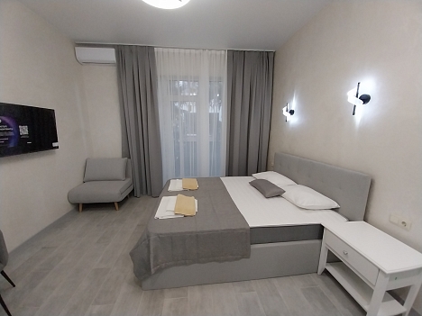 Четырехэтажный корпус отеля находится на озелененной благоустроенной территории. Гостей ожидают двух- и трехместные номера Эконом и Стандарт, а также Студио с кухней, категории Люкс и Апартаменты. В комнатах светлый современный интерьер, установлена сплит-система, есть индивидуальный санузел, холодильник, телевизор.