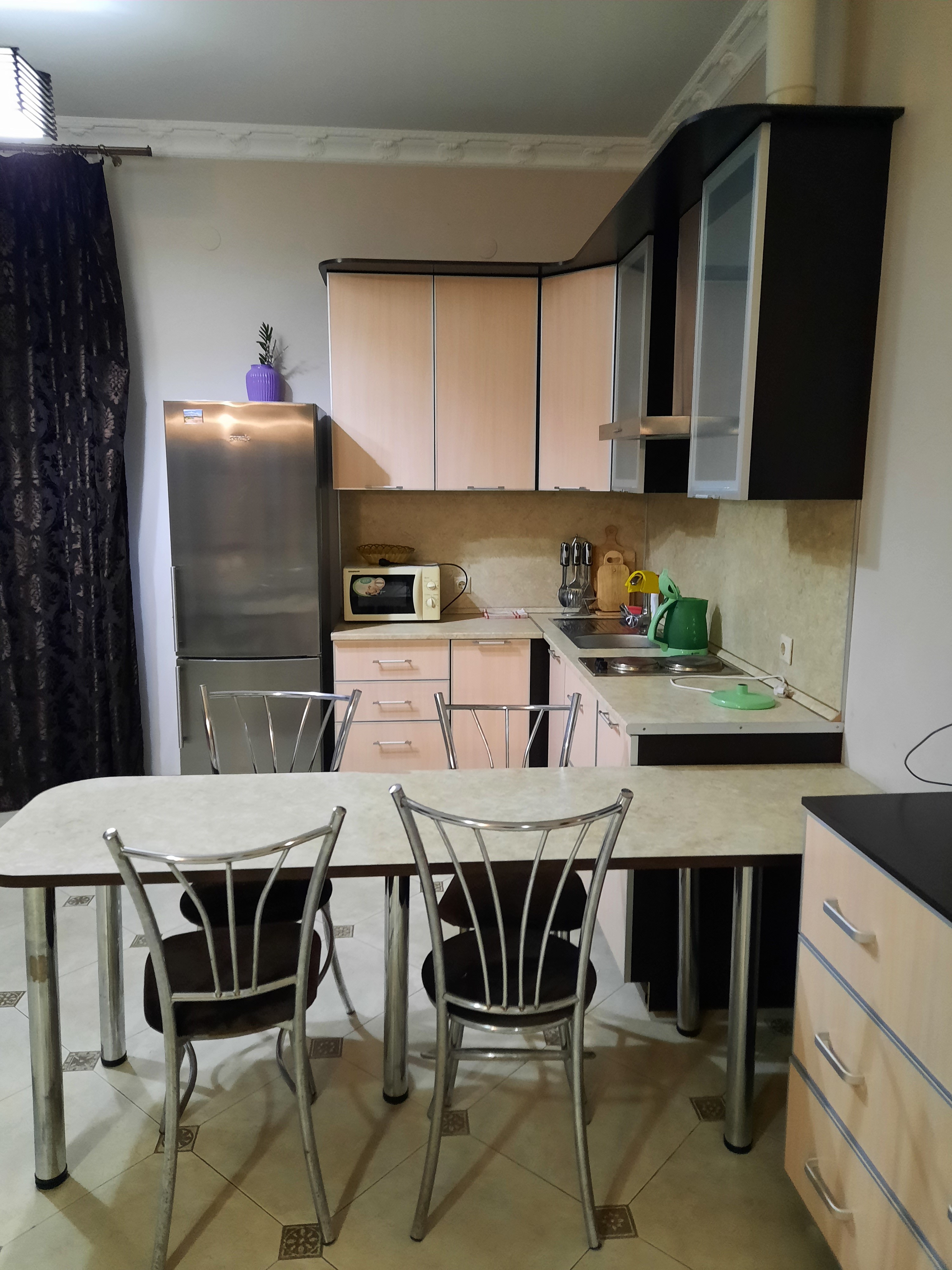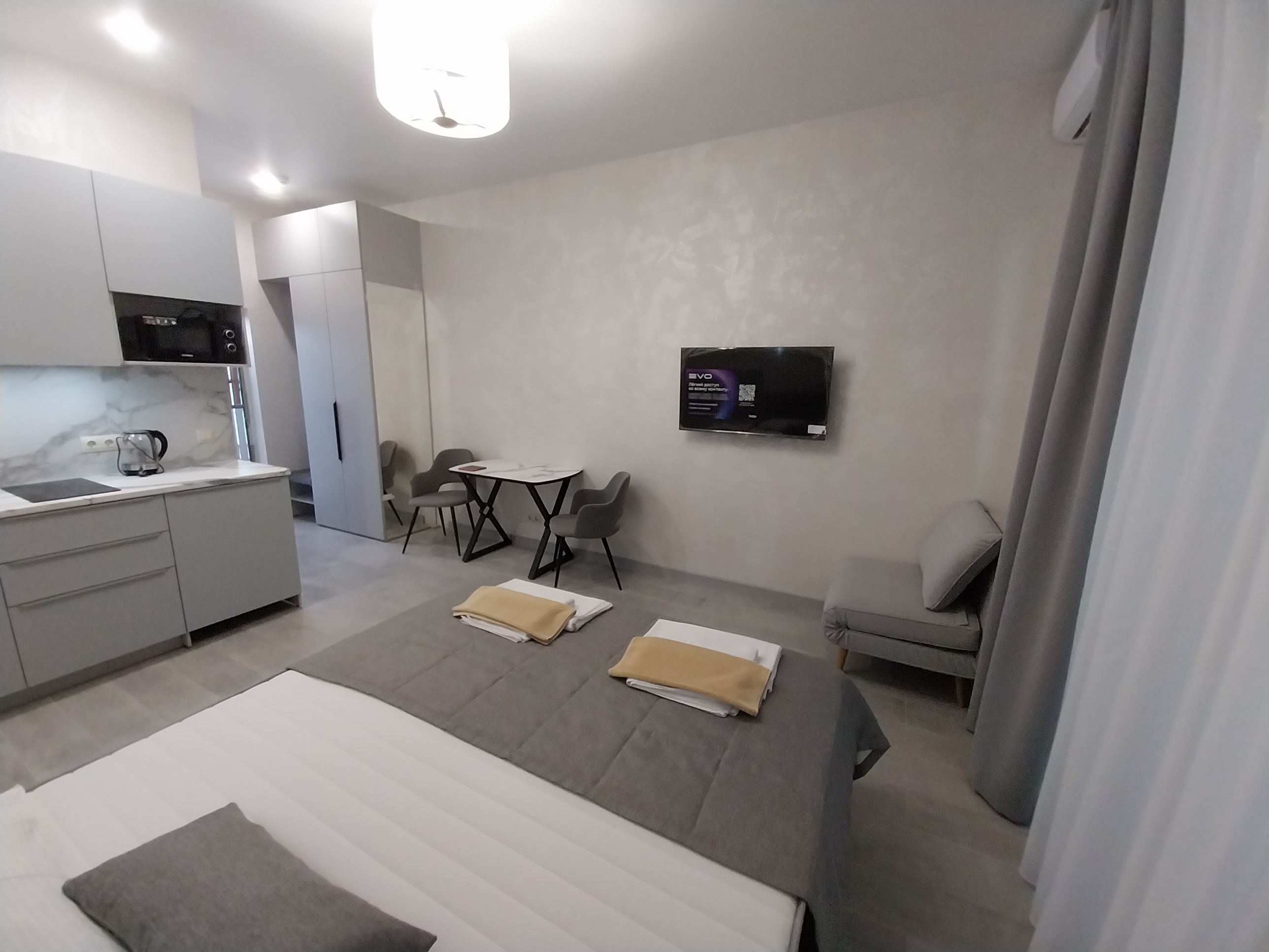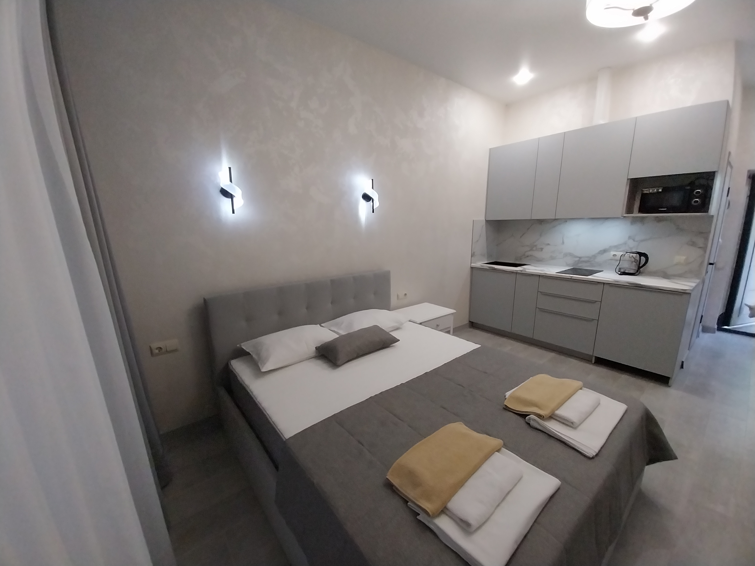 В номере: вешалка, зеркало, кресло-кровать, кровать двуспальная, кухонная мебель, прикроватные тумбочки, стол, стулья, шкаф, набор посуды, плита электрическая, сплит-система, сушилка для белья, телевизор ЖК, холодильник, электрочайник