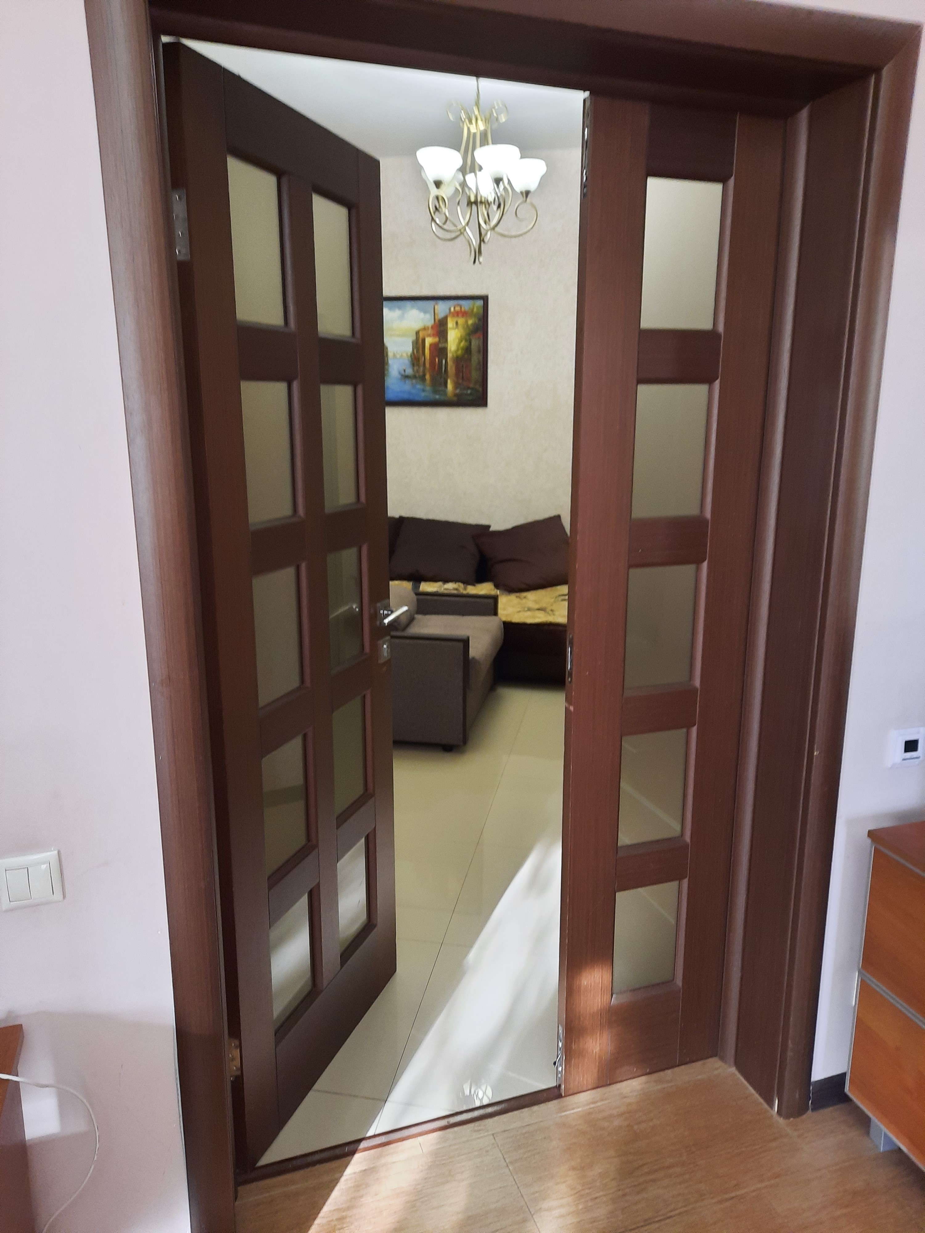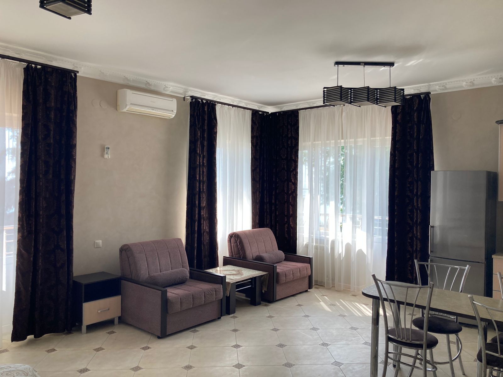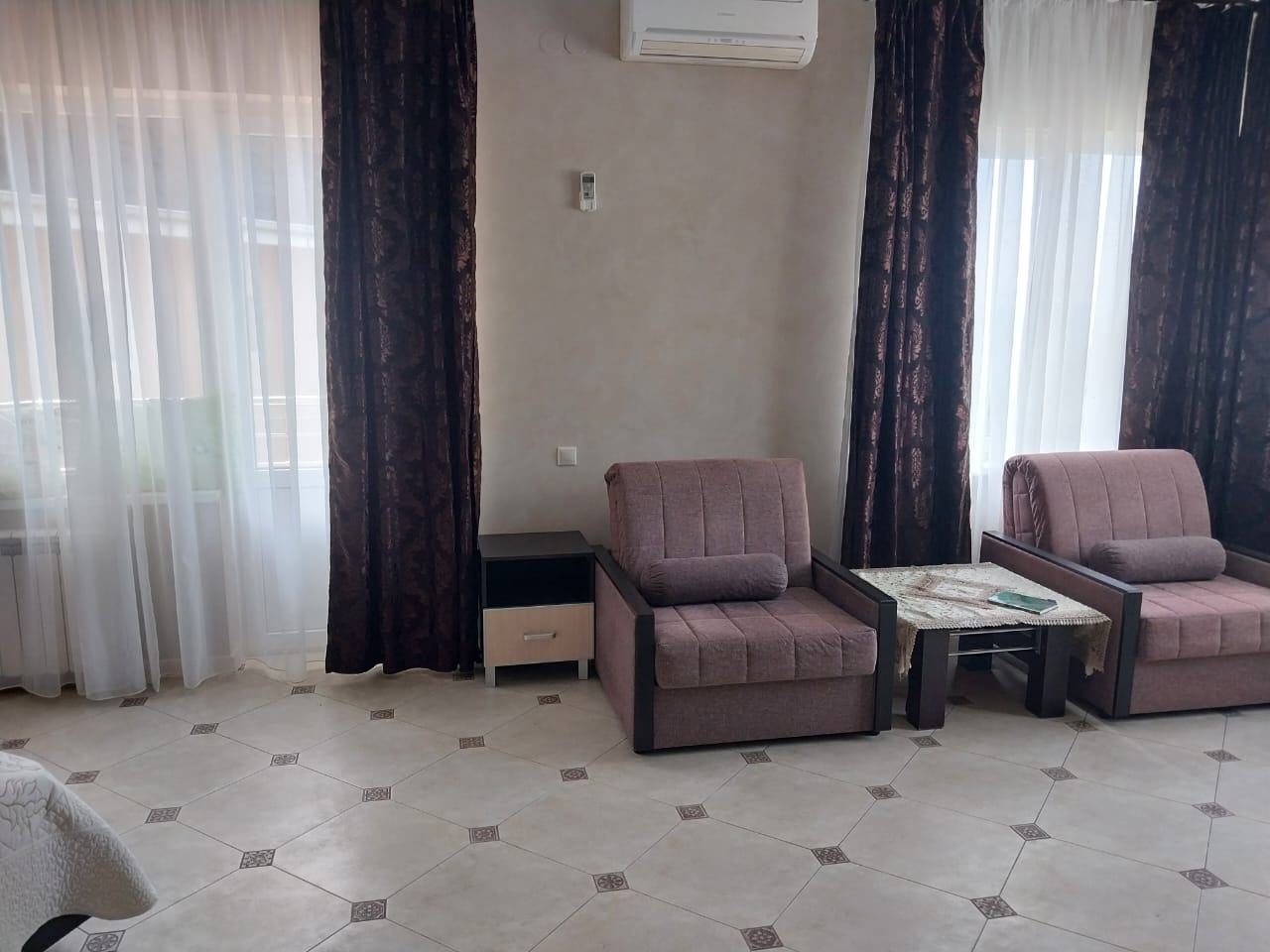 В номере: вешалка, зеркало, кресло-кровать, кровать двуспальная, кухонная мебель, прикроватные тумбочки, стол, стулья, шкаф, набор посуды, плита электрическая, сплит-система, сушилка для белья, телевизор ЖК, холодильник, электрочайник