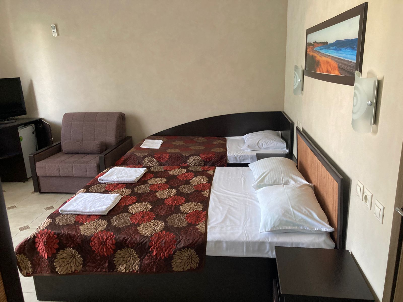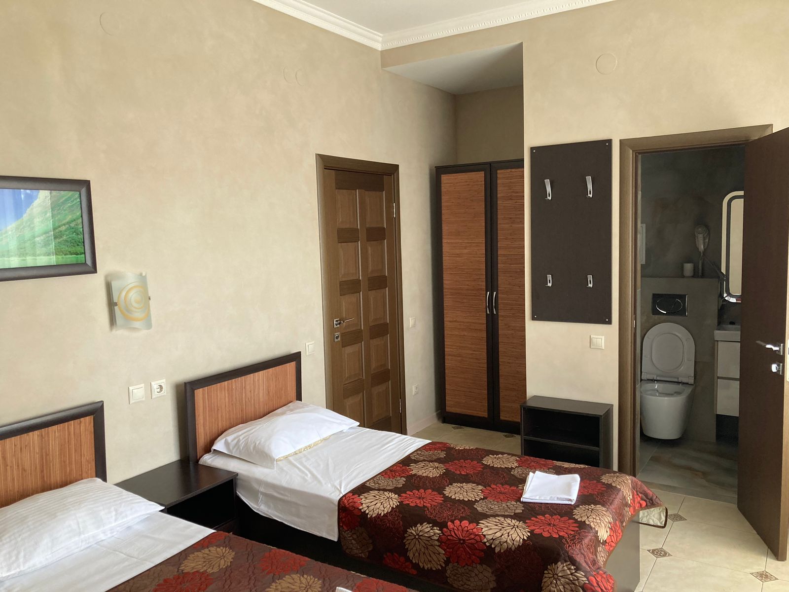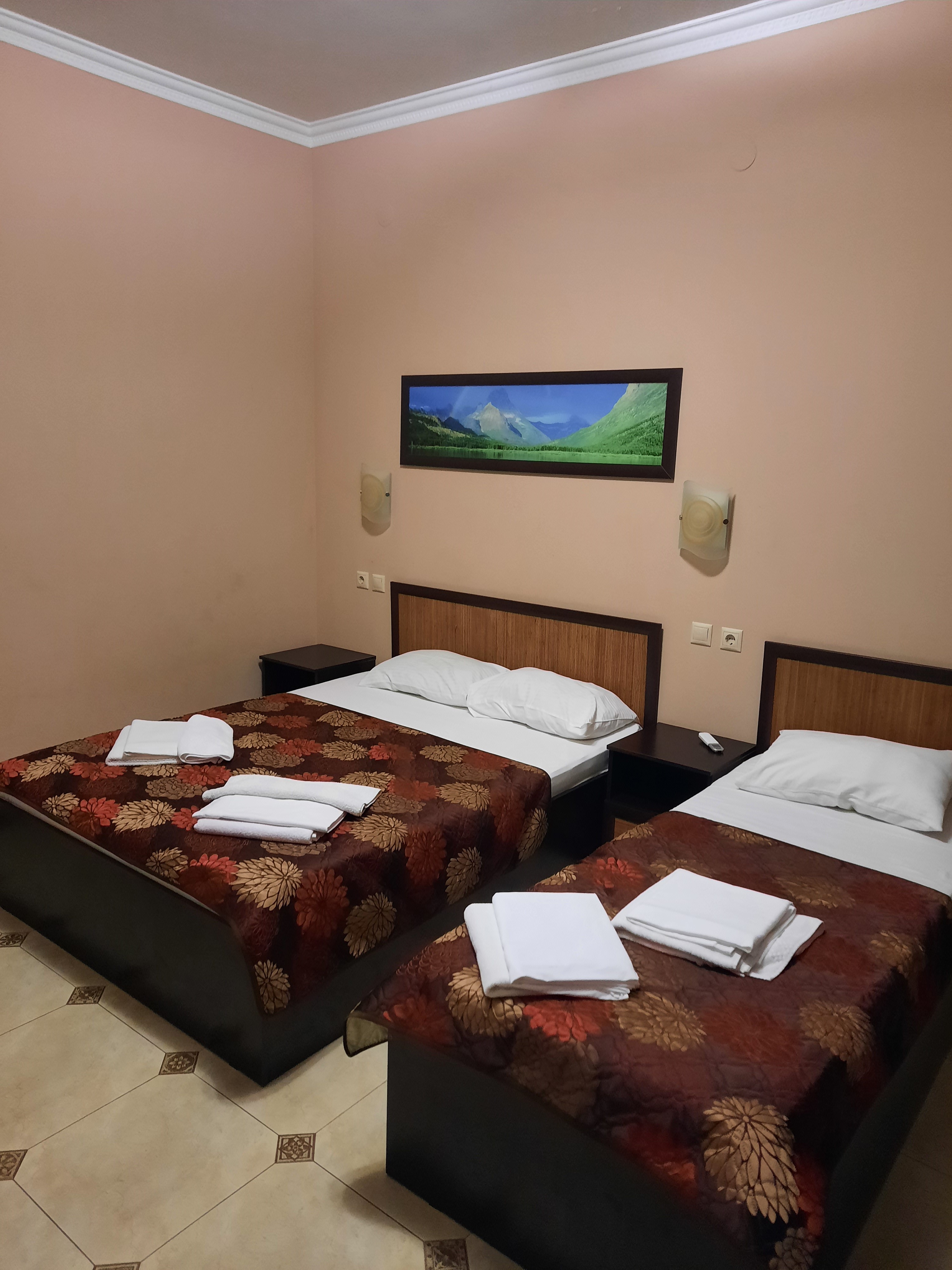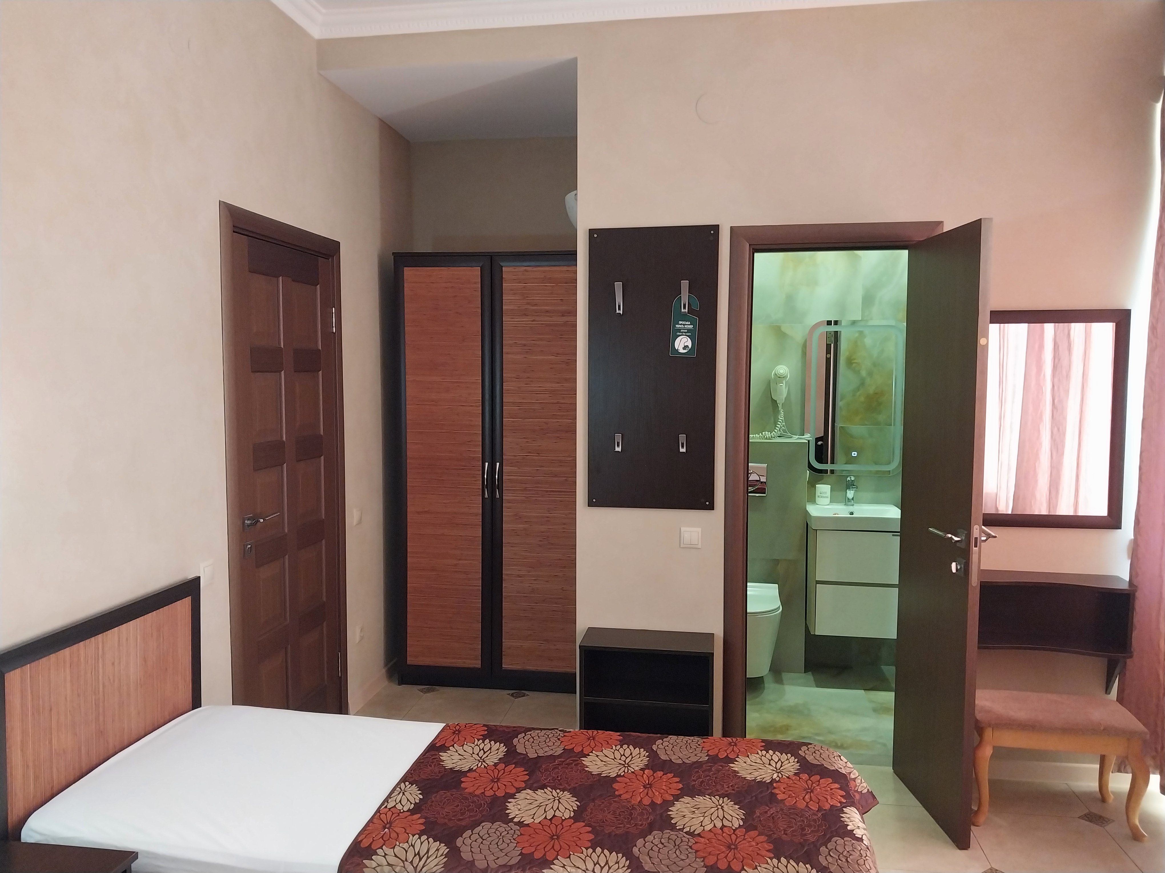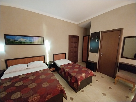 В номере: вешалка, зеркало, кресло, кровать двуспальная, кровать односпальная, обувная полка, прикроватные тумбочки, стол, столик туалетный, стулья, тумба под телевизор, шкаф, кондиционер, телевизор, холодильник, электрочайник