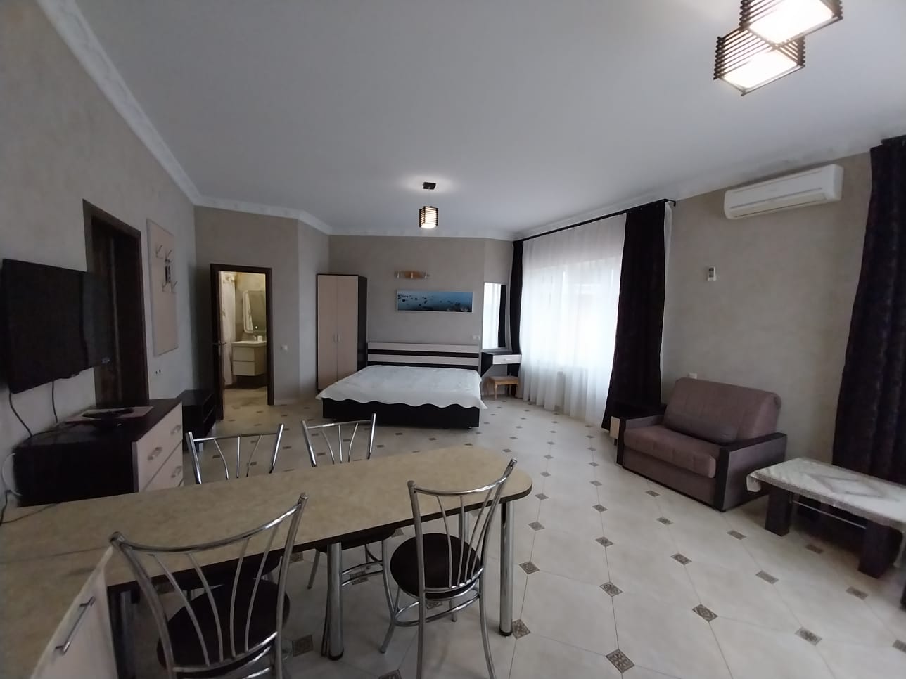 В номере: зеркало, кровать двуспальная, прикроватные тумбочки, стол, столик туалетный, стулья, тумба под телевизор, шкаф, кондиционер, телевизор, холодильник, электрочайник