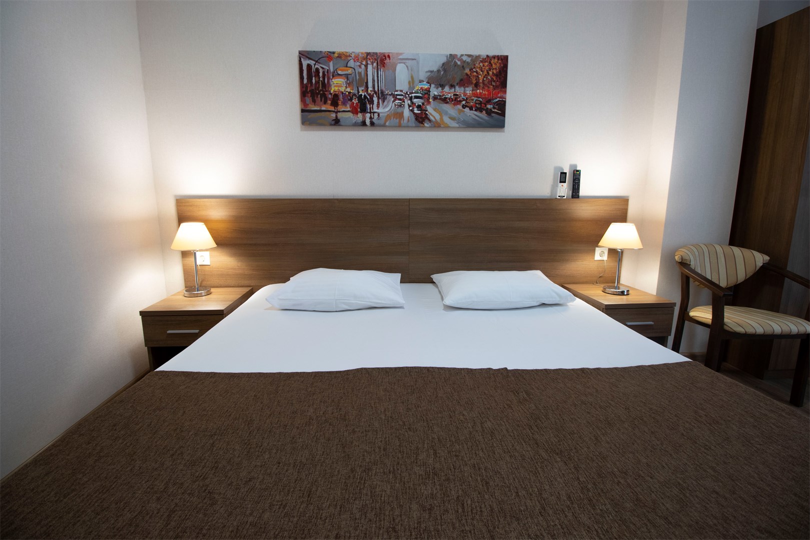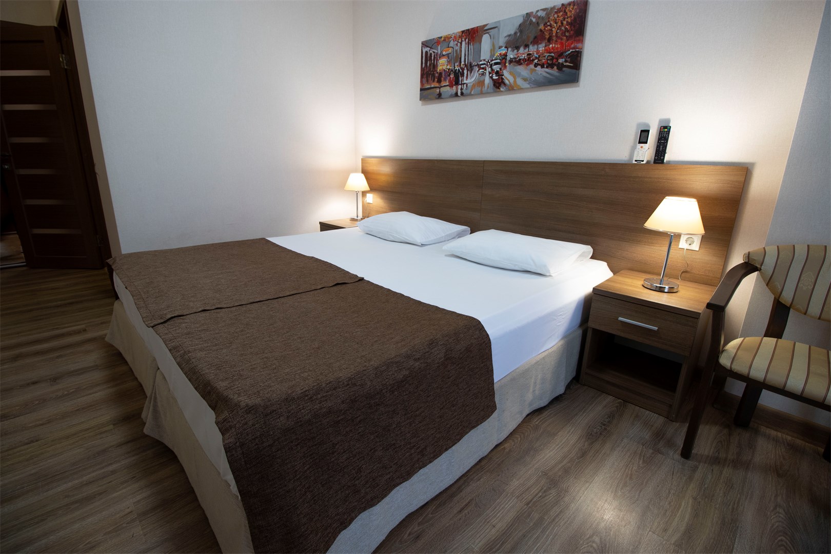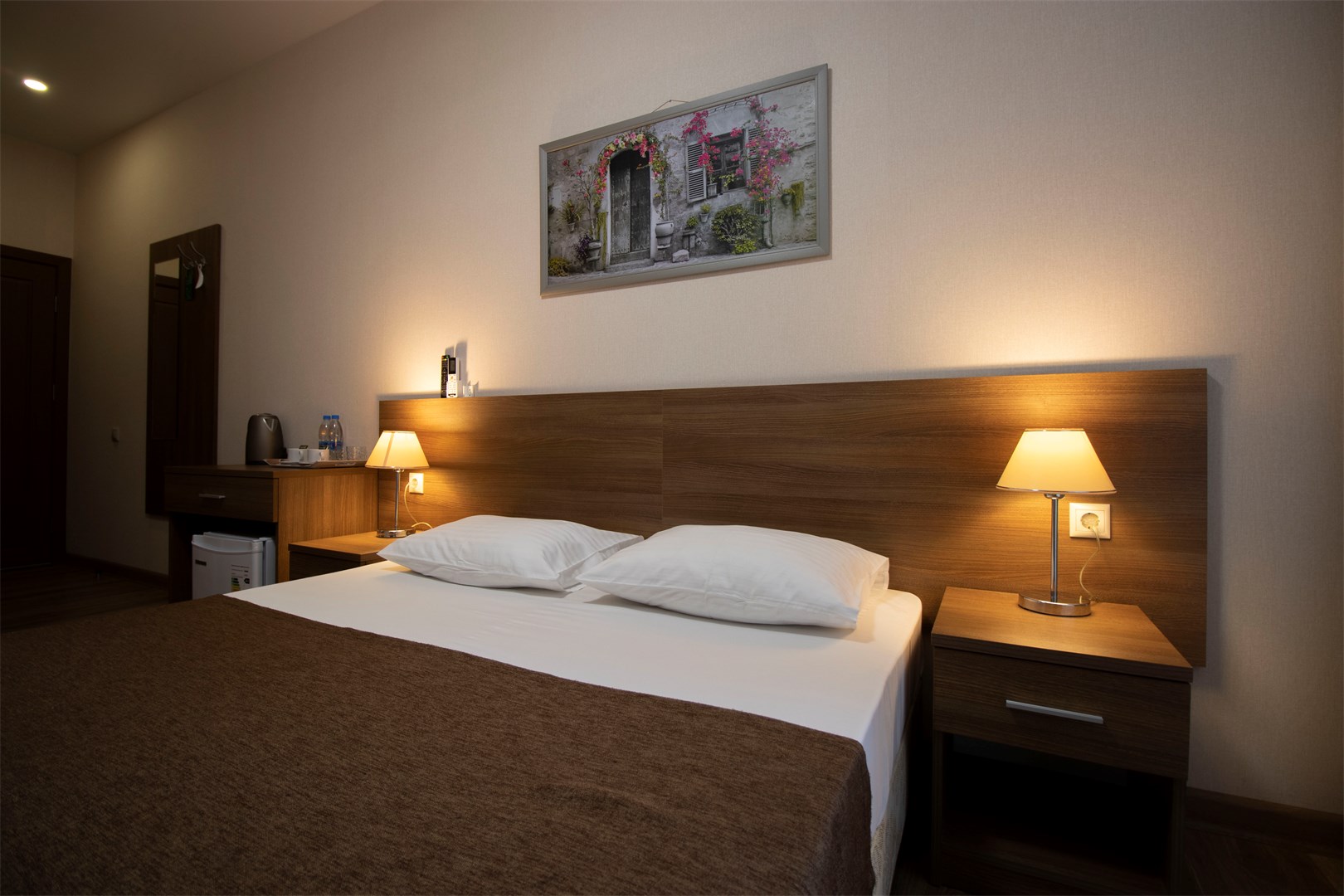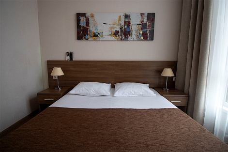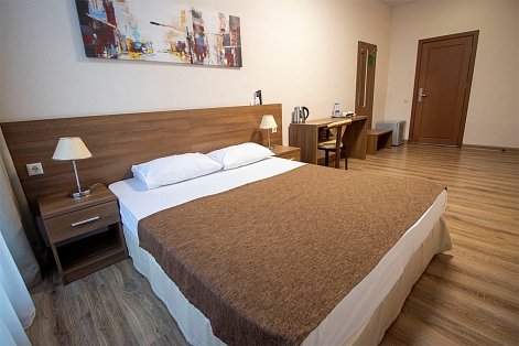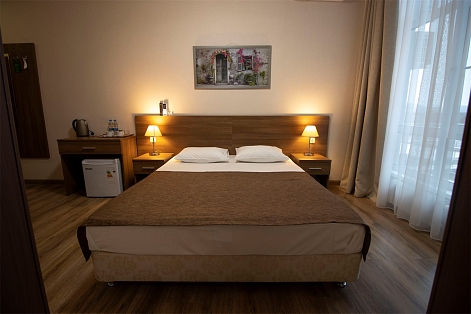 В номере: вешалка, зеркало, кресло, кровать двуспальная, прикроватные тумбочки, стол, тумба, кондиционер, телефон, холодильник, чайный набор посуды, электрочайник