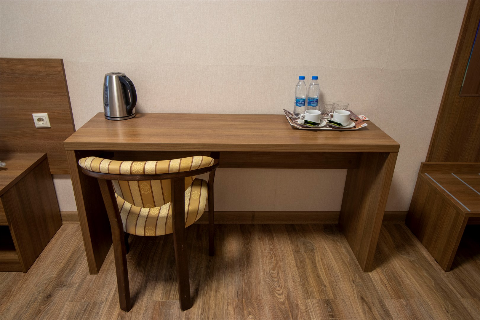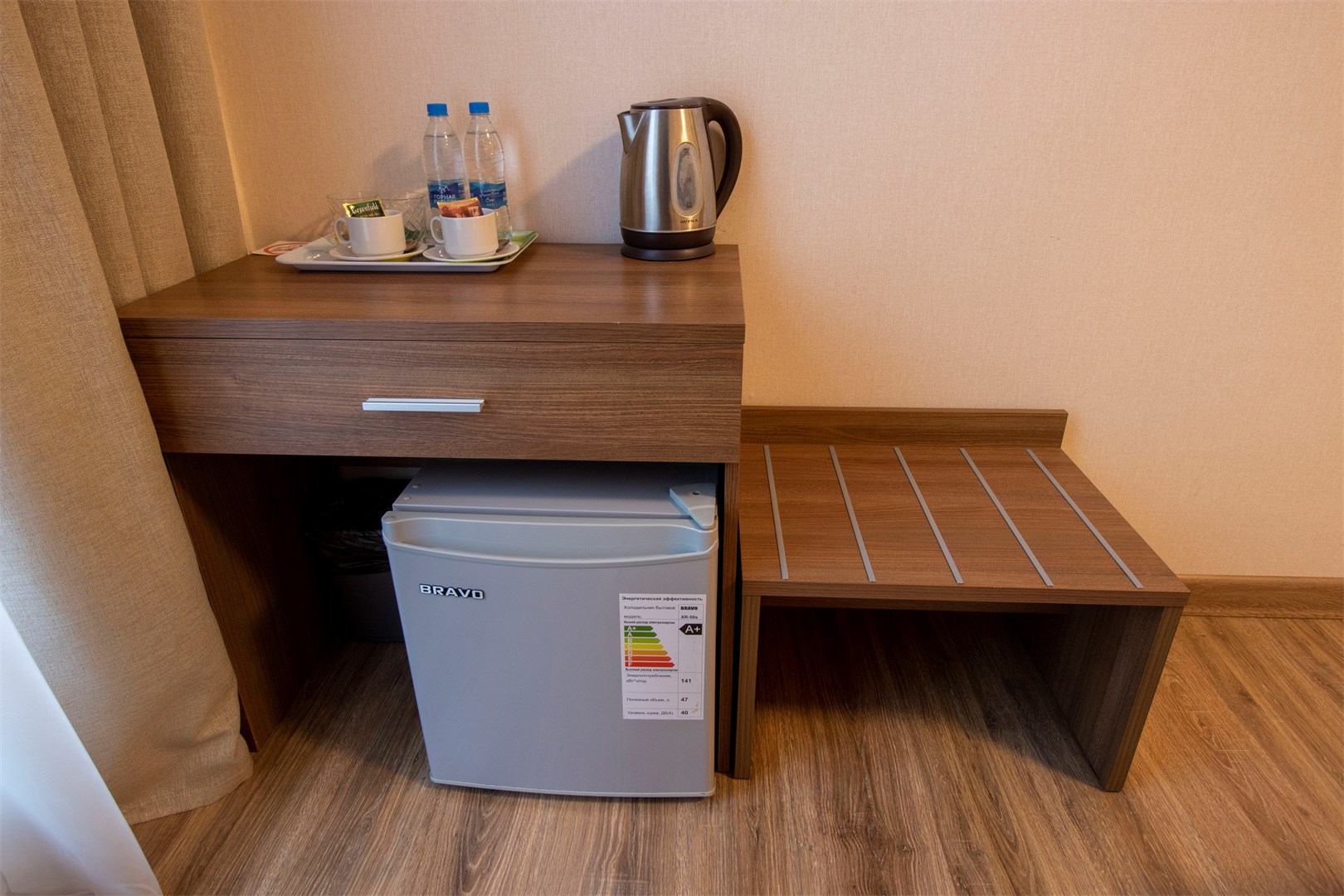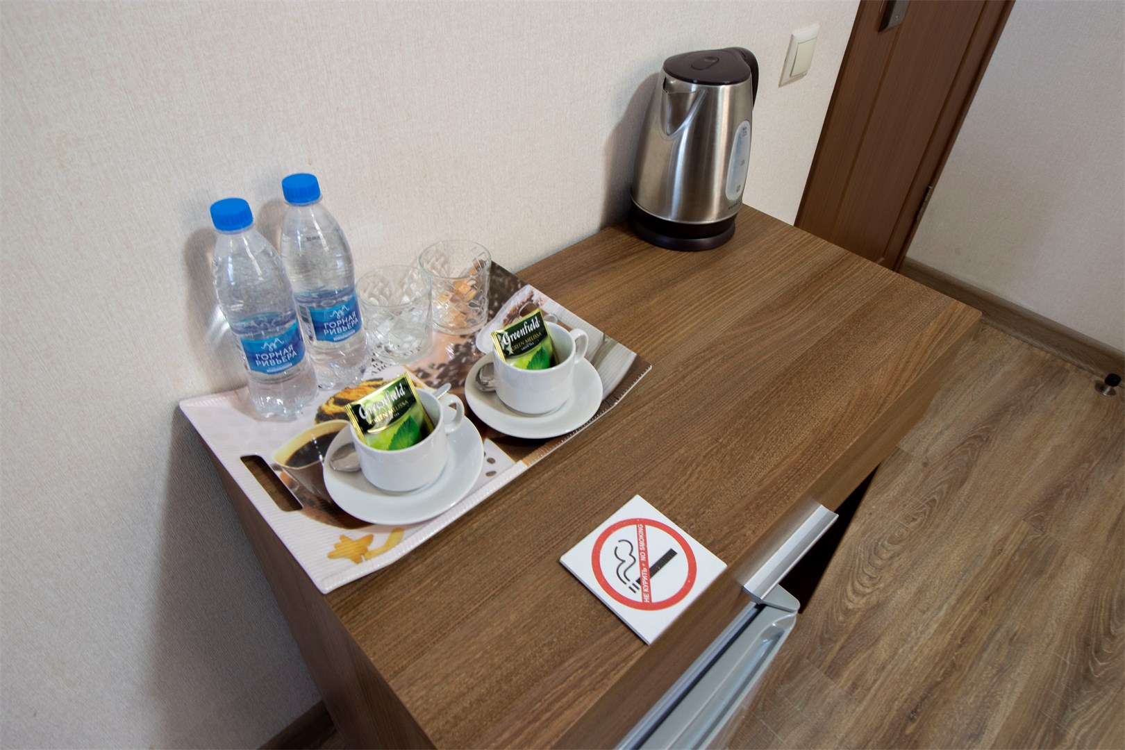 В номере: вешалка, зеркало, кресло, кровать двуспальная, прикроватные тумбочки, стол, тумба, кондиционер, телефон, холодильник, чайный набор посуды, электрочайник