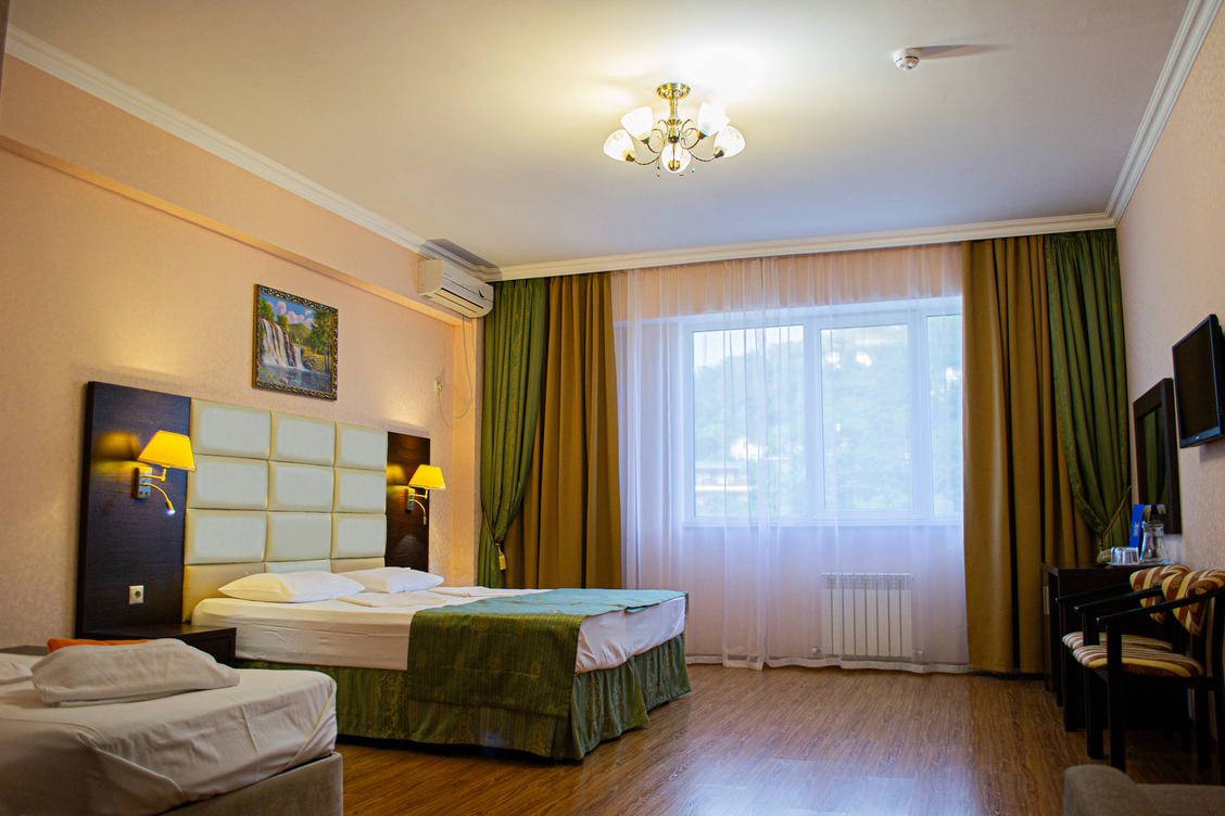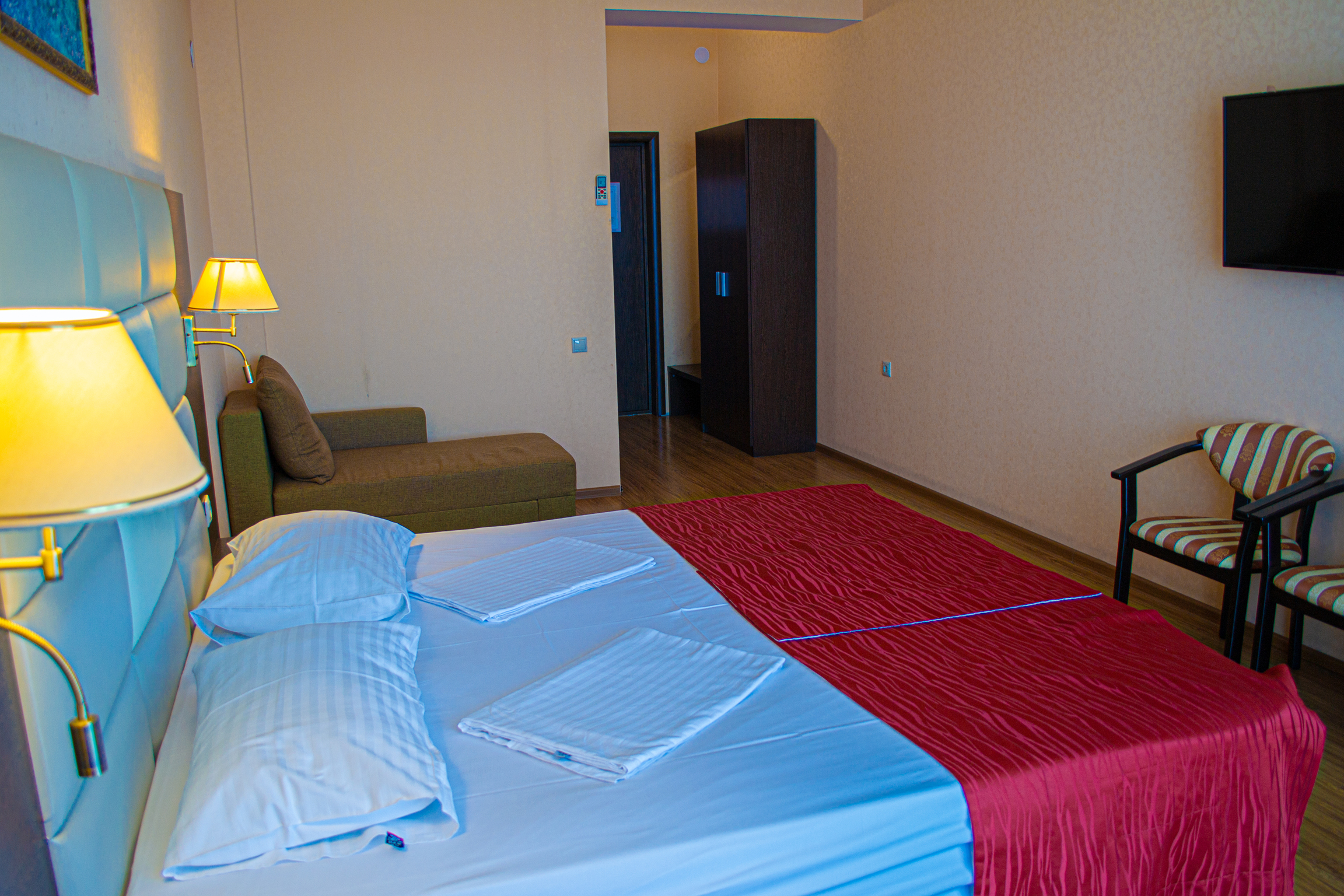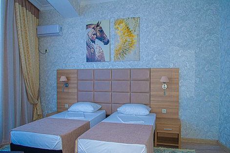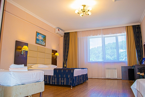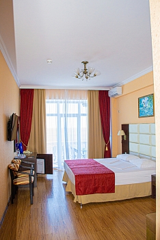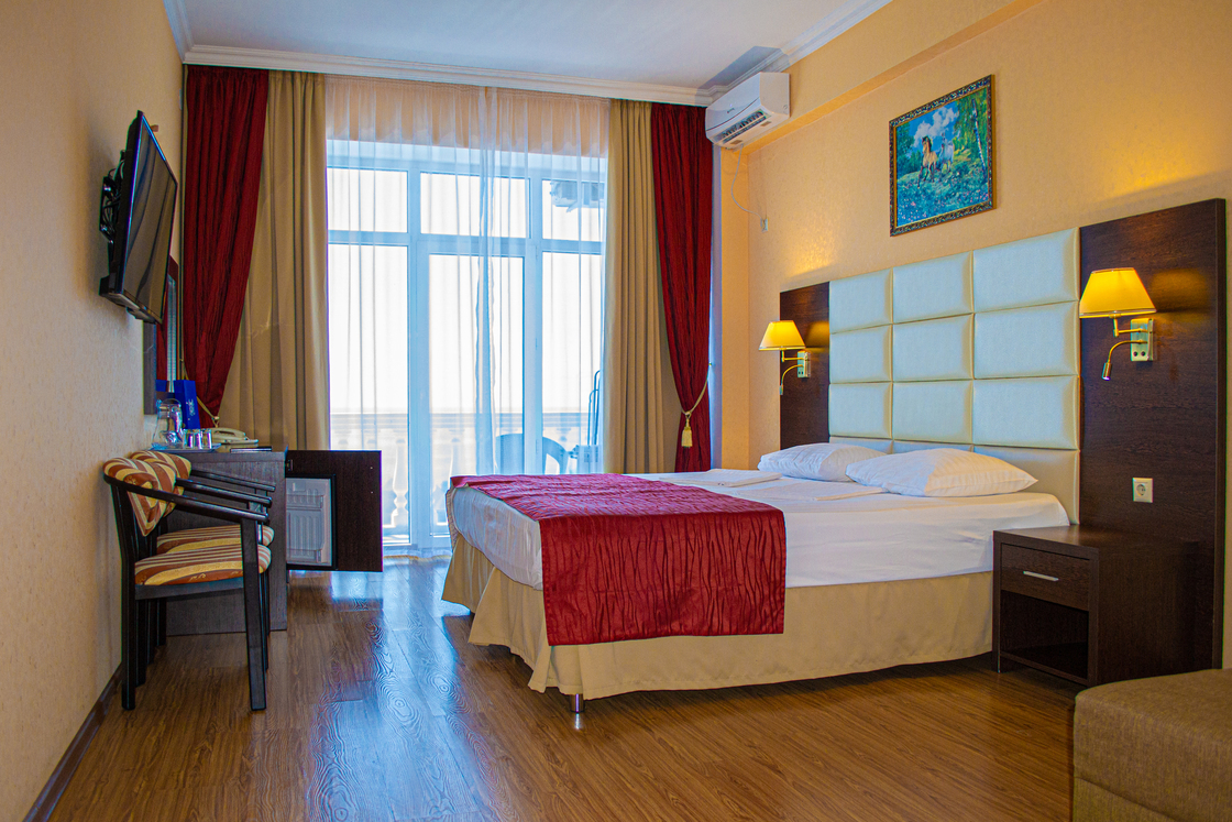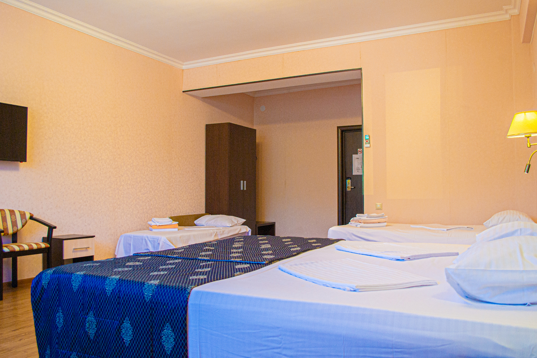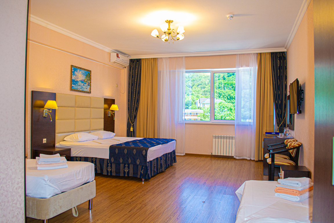 В номере: кровати односпальные /одна двуспальная кровать, прикроватные тумбочки, стол, стулья, шкаф, кондиционер, набор посуды, пляжные полотенца, телевизор ЖК, холодильник