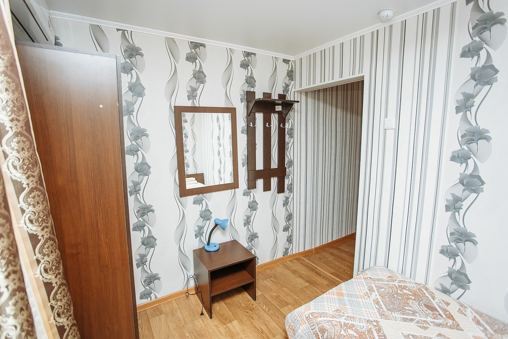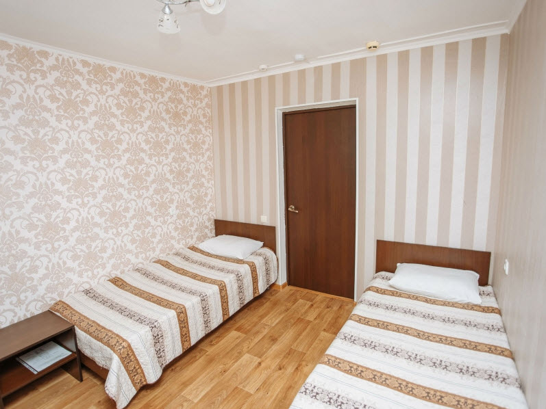 В номере: зеркало, кровати односпальные, прикроватная тумбочка, стул, шкаф, гладильная доска, кондиционер, телевизор, утюг, холодильник
