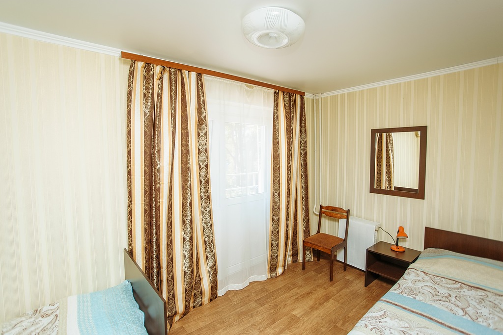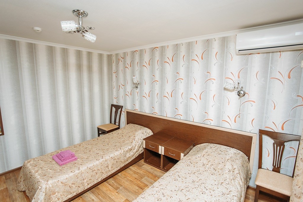 В номере: зеркало, кровати односпальные, прикроватная тумбочка, стул, шкаф, мини-холодильник, сплит-система, телевизор