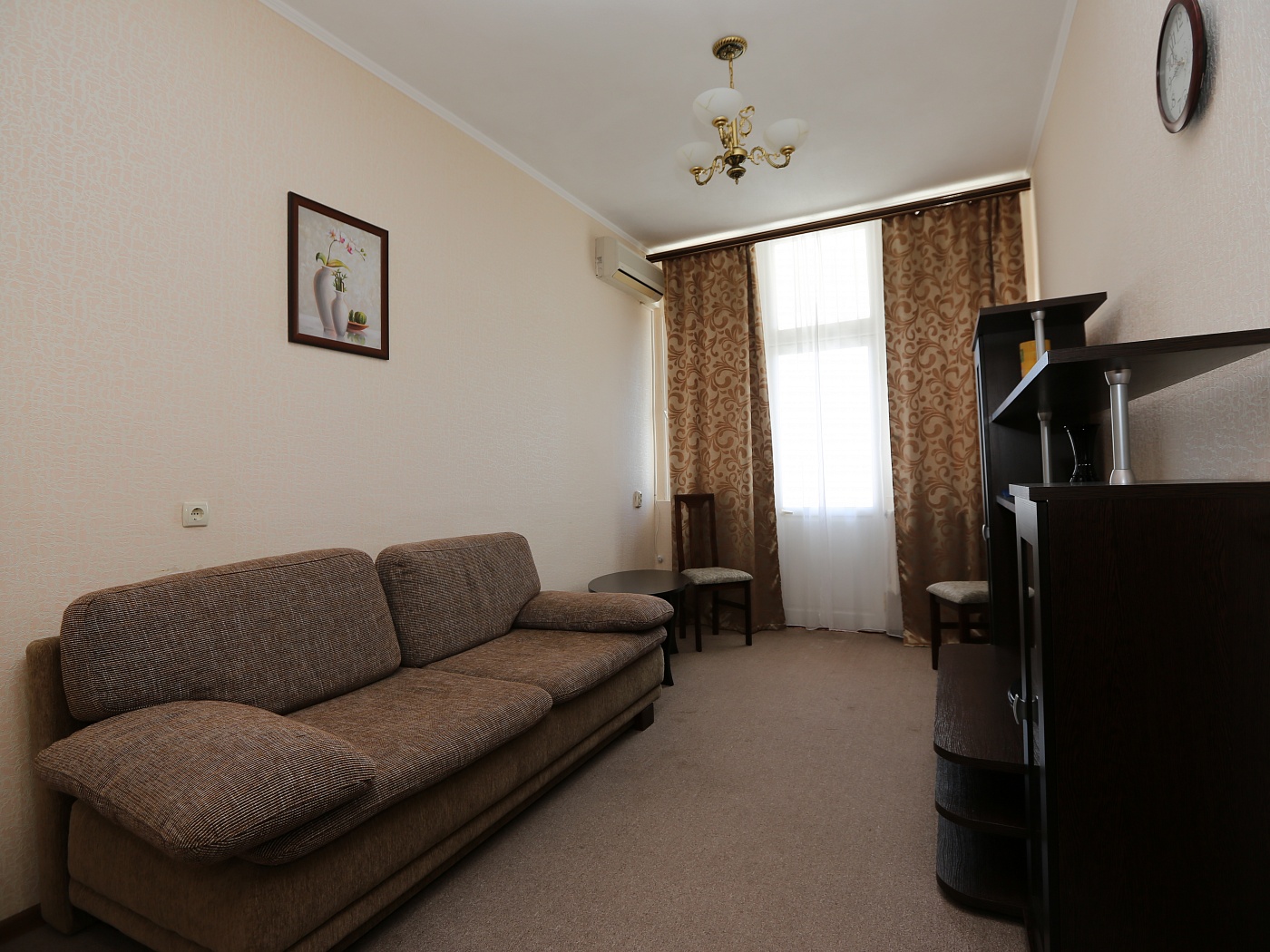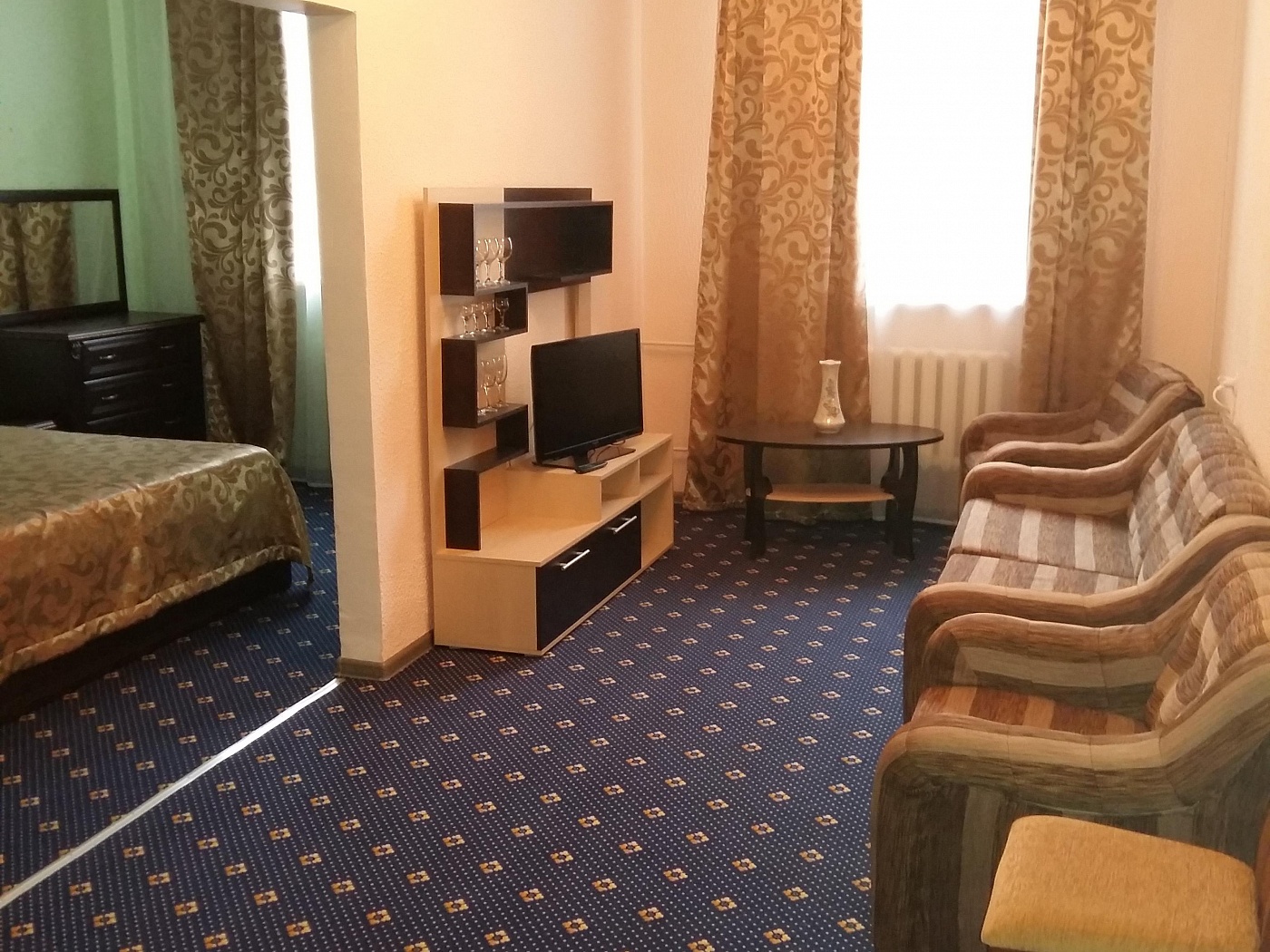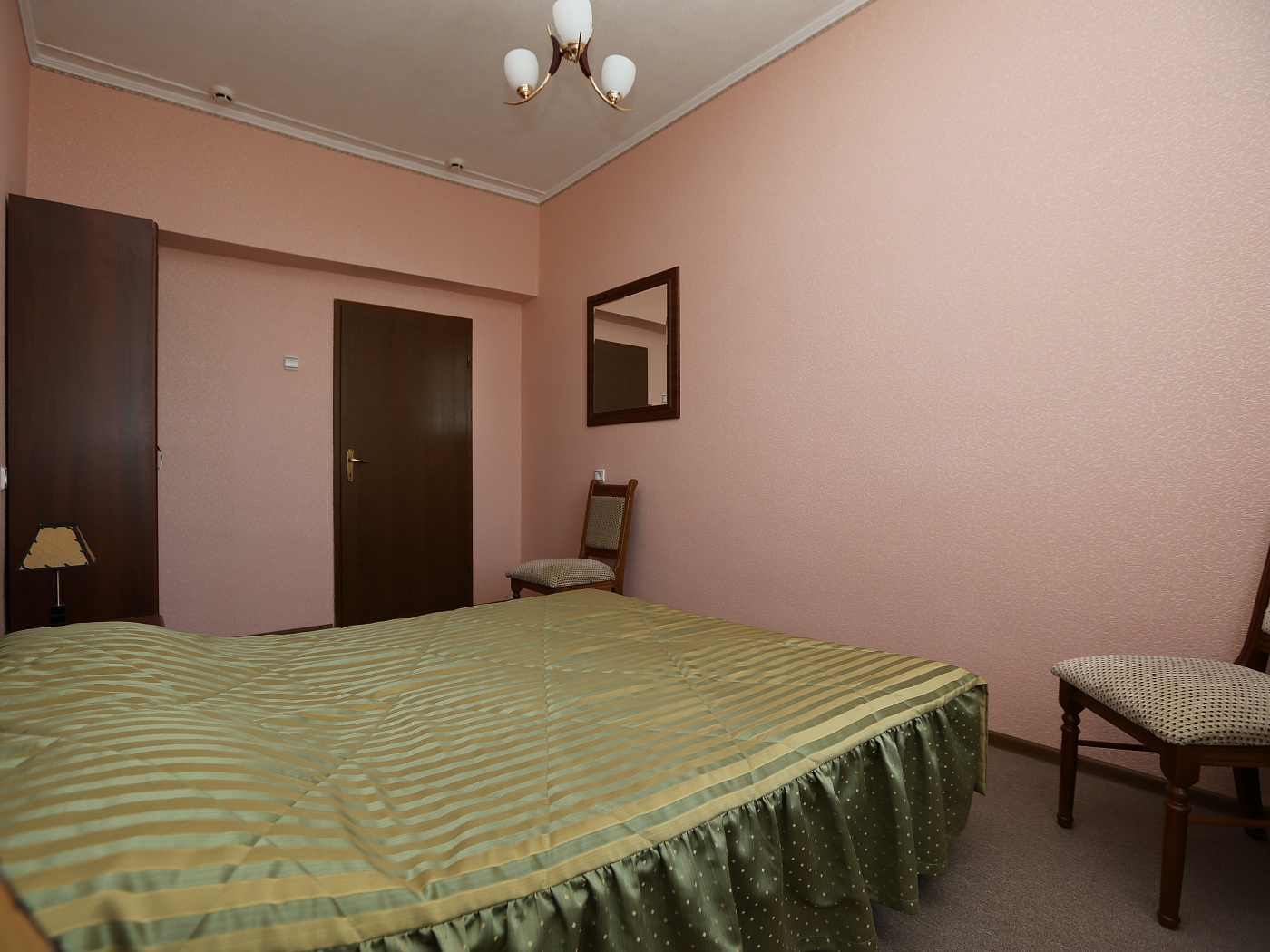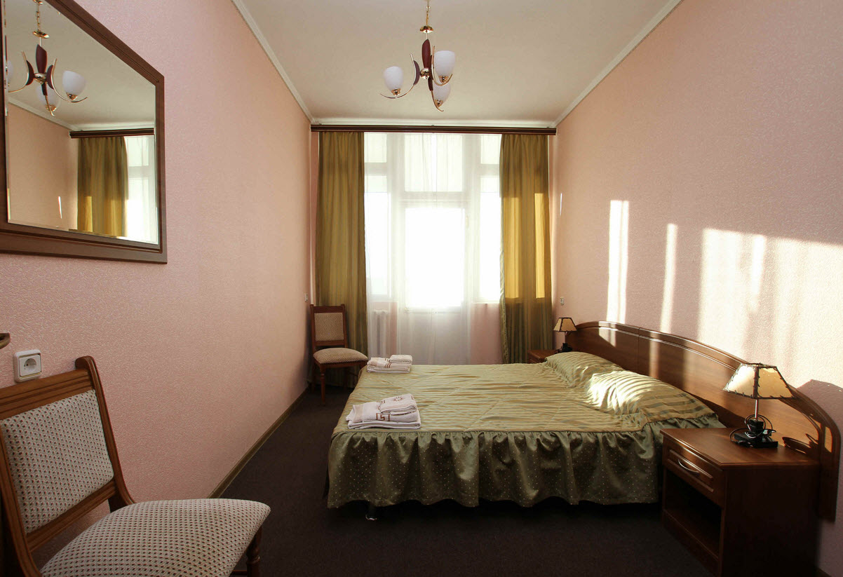 В номере: диван, зеркало, кровать двуспальная, прикроватные тумбочки, стол, стул, шкаф, гладильная доска, кондиционер, телевизор, утюг, холодильник