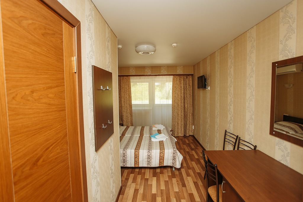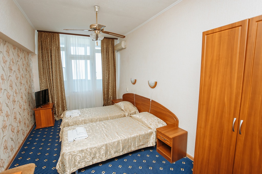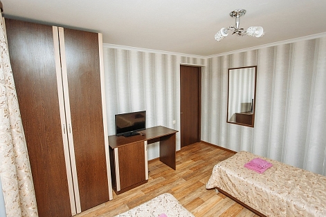 В номере: зеркало, кровати односпальные, прикроватные тумбочки, стол, шкаф, мини-холодильник, сплит-система, телевизор