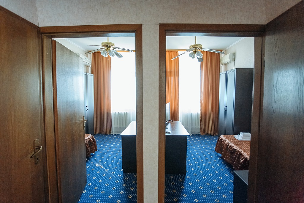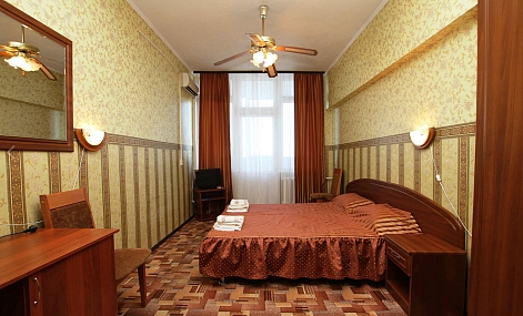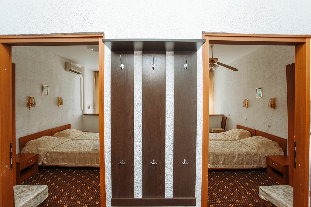В номере: зеркало, кровати односпальные /одна двуспальная кровать, прикроватные тумбочки, стол, стул, шкаф, гладильная доска, кондиционер, телевизор, утюг, холодильник