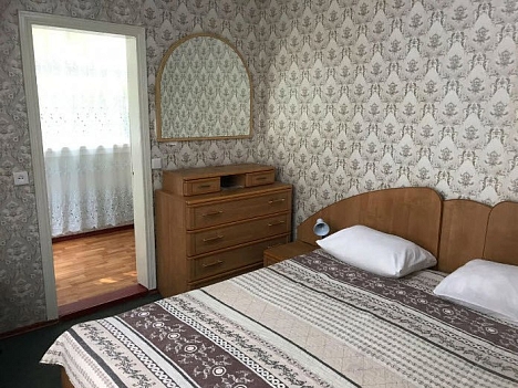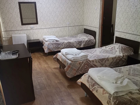 В номере: зеркало, кровати односпальные, кровать двуспальная, прикроватные тумбочки, стол, стул, шкаф, гладильная доска, кондиционер, телевизор, утюг, холодильник