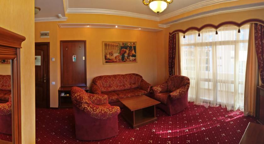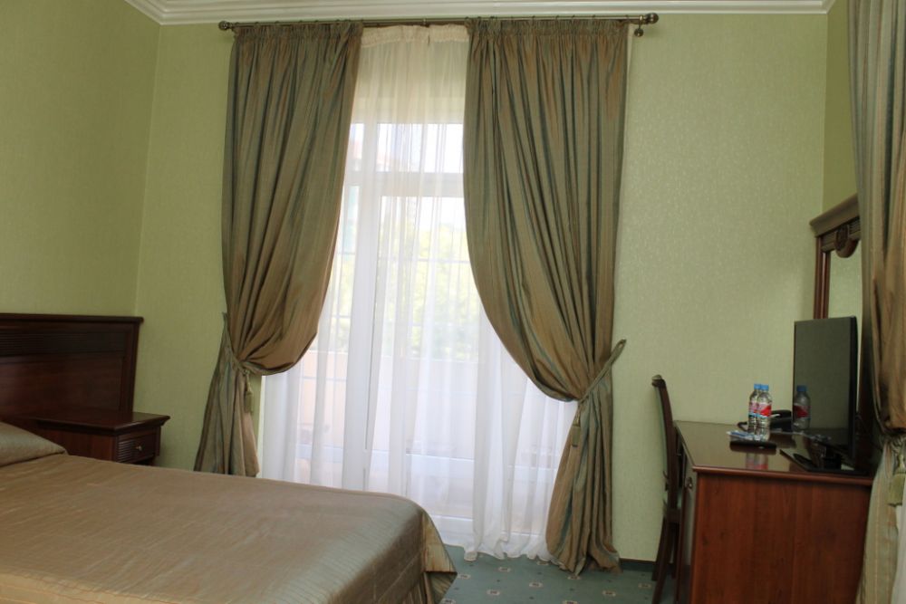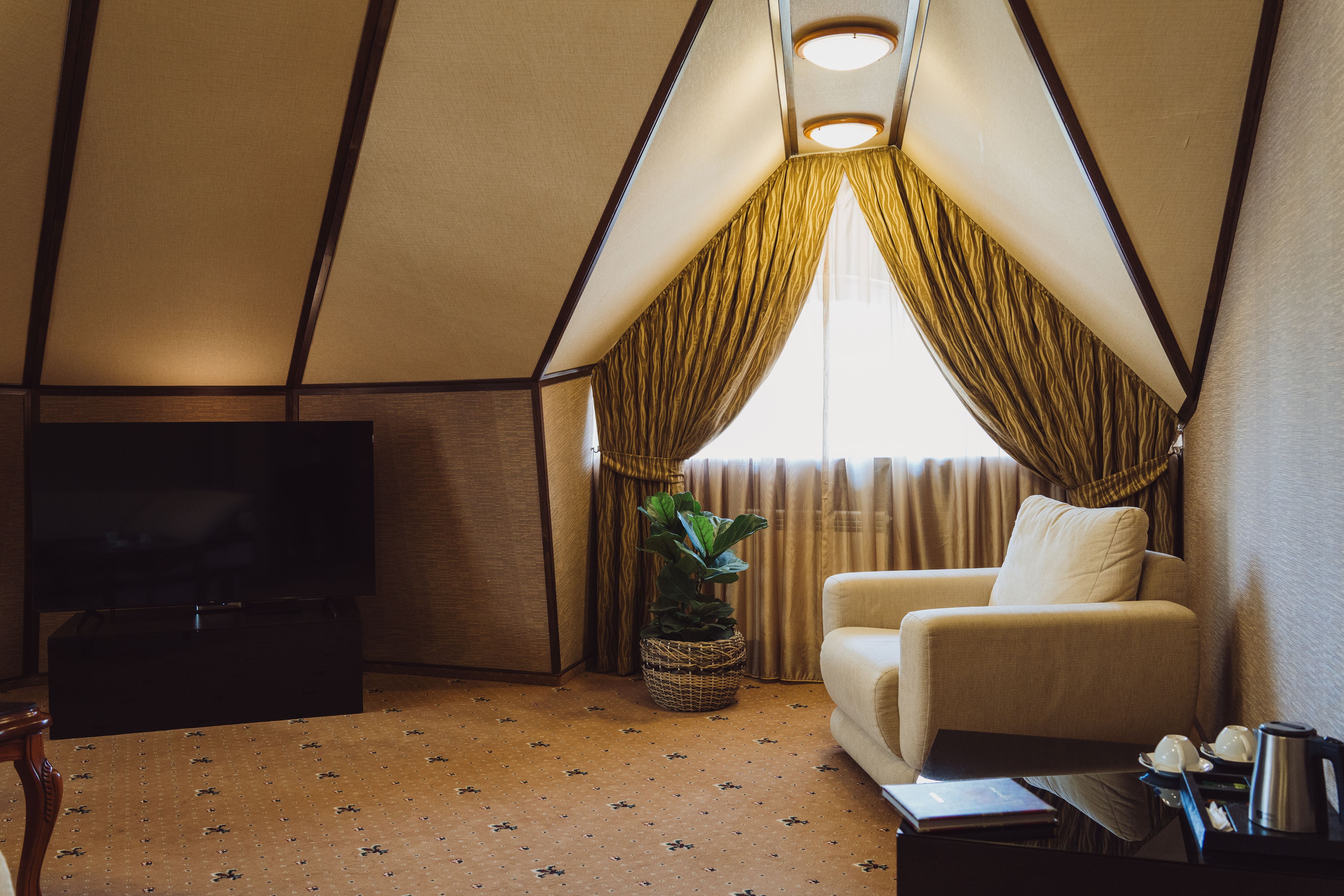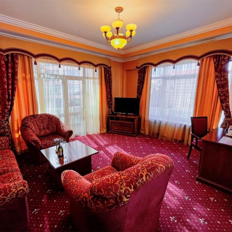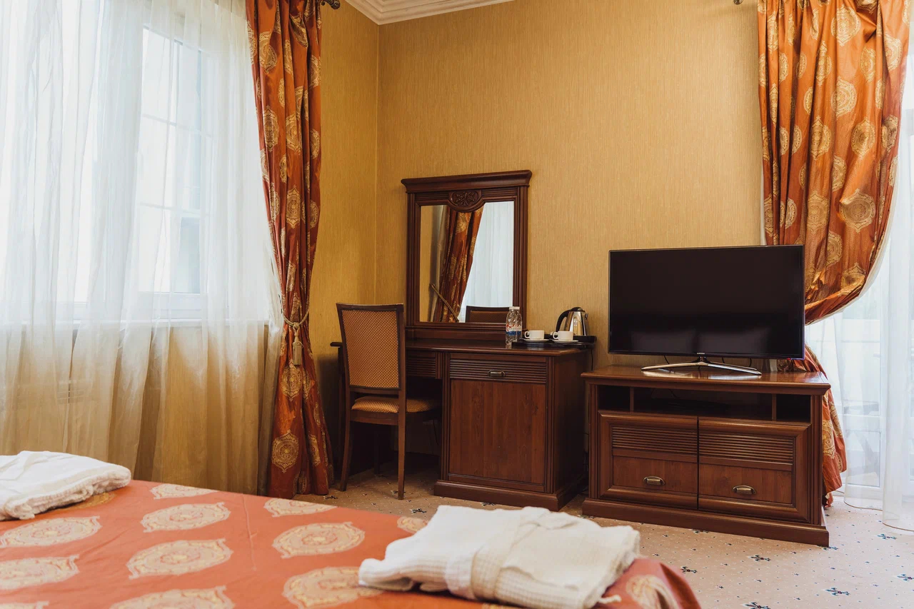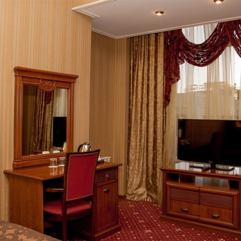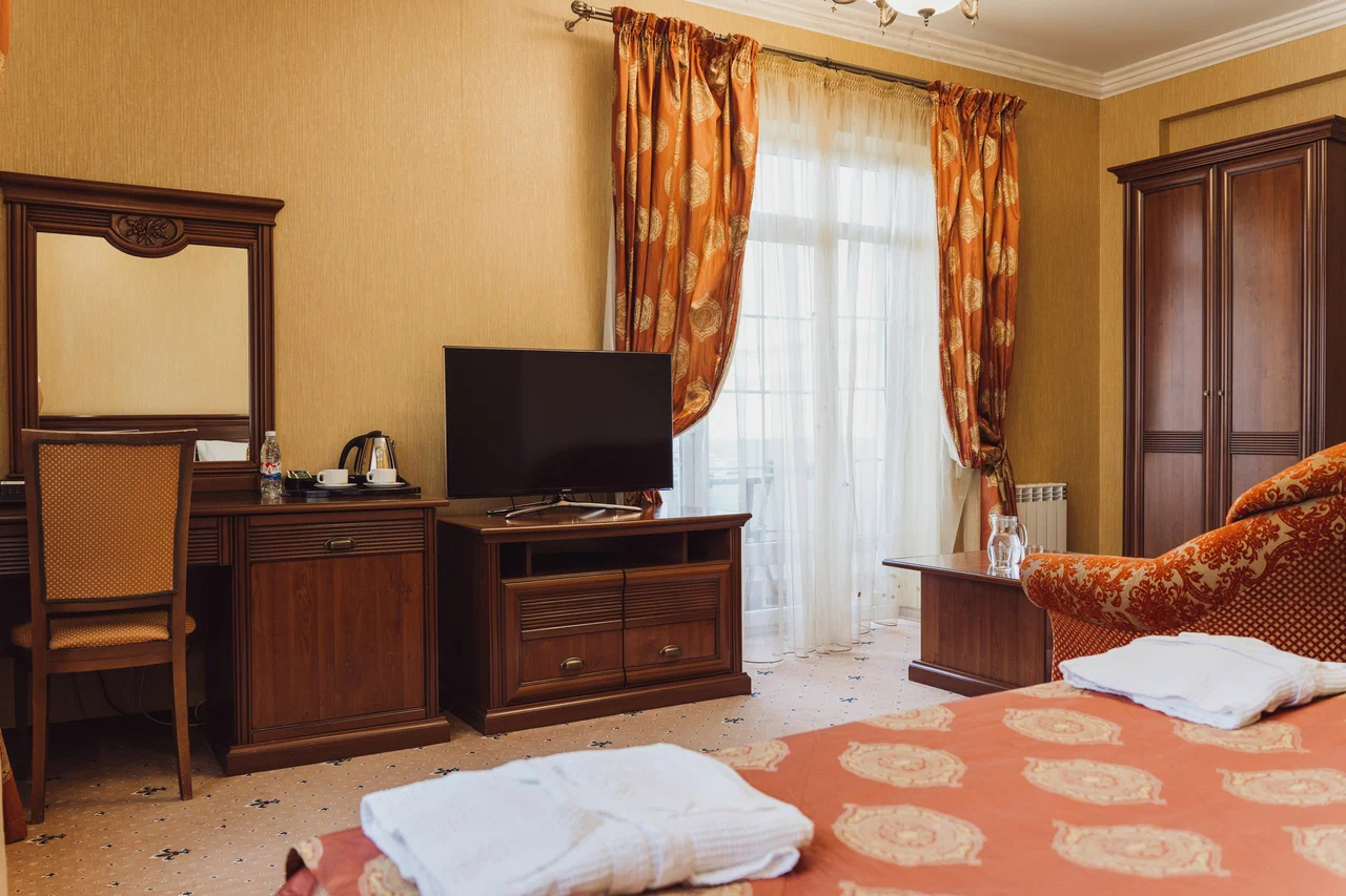 В номере: вешалка, диван, зеркало, кресла, кровать двуспальная, пуфик, столик журнальный, столик туалетный, стулья, шкаф, гладильная доска, кондиционер, мини-холодильник, сейф, сушилка для белья, телевизор, телефон, утюг, чайник