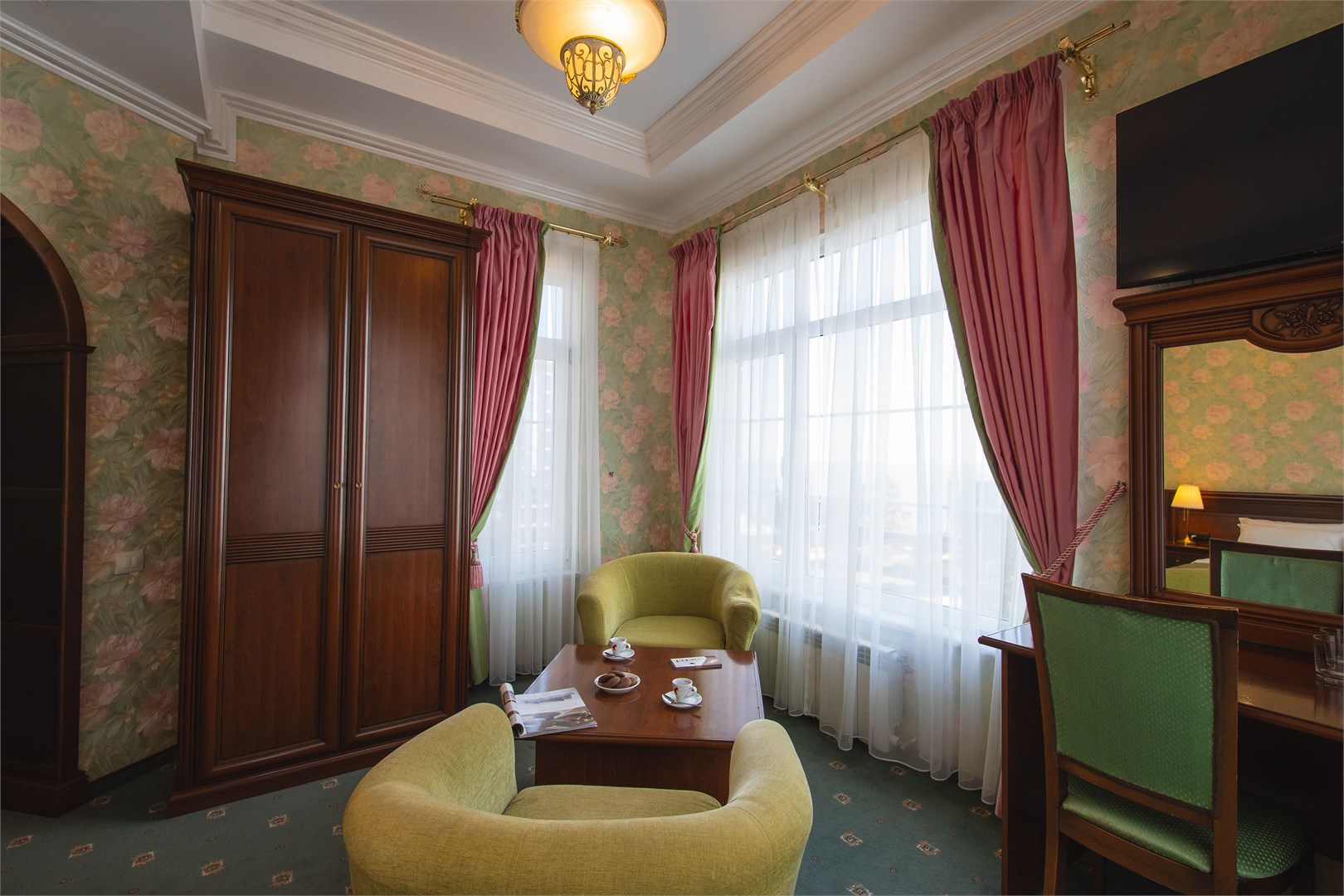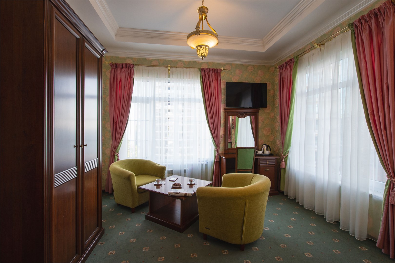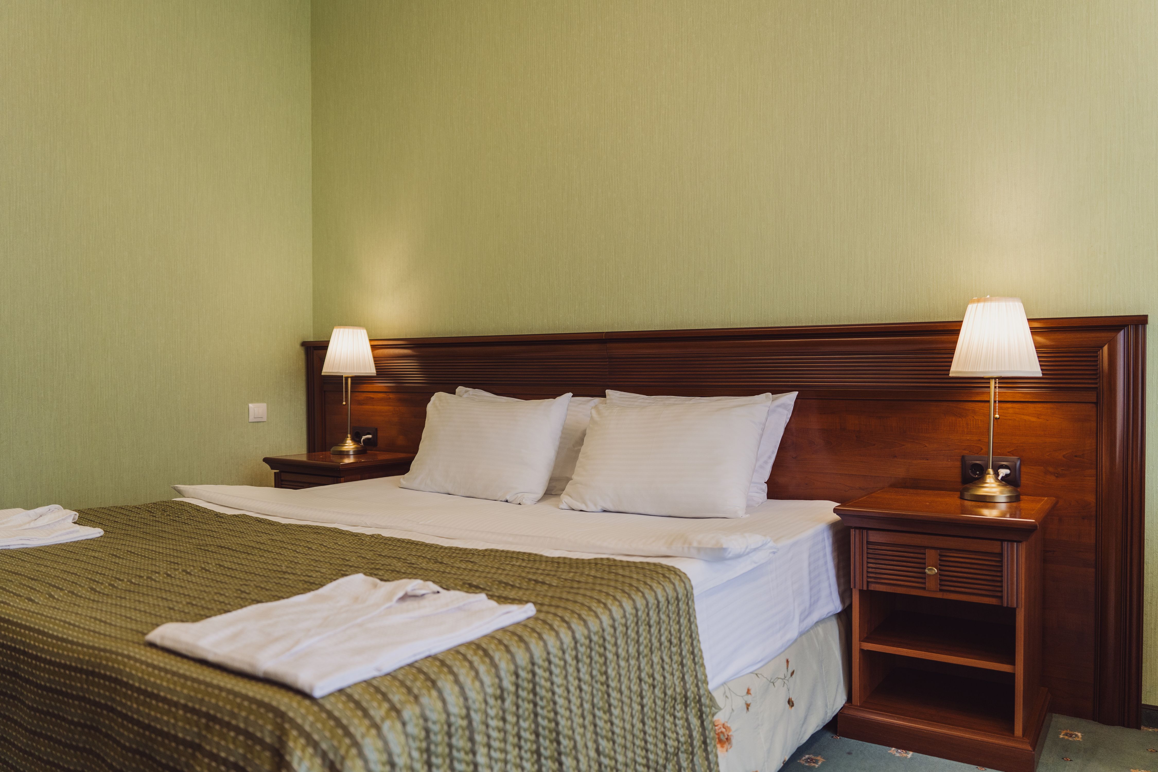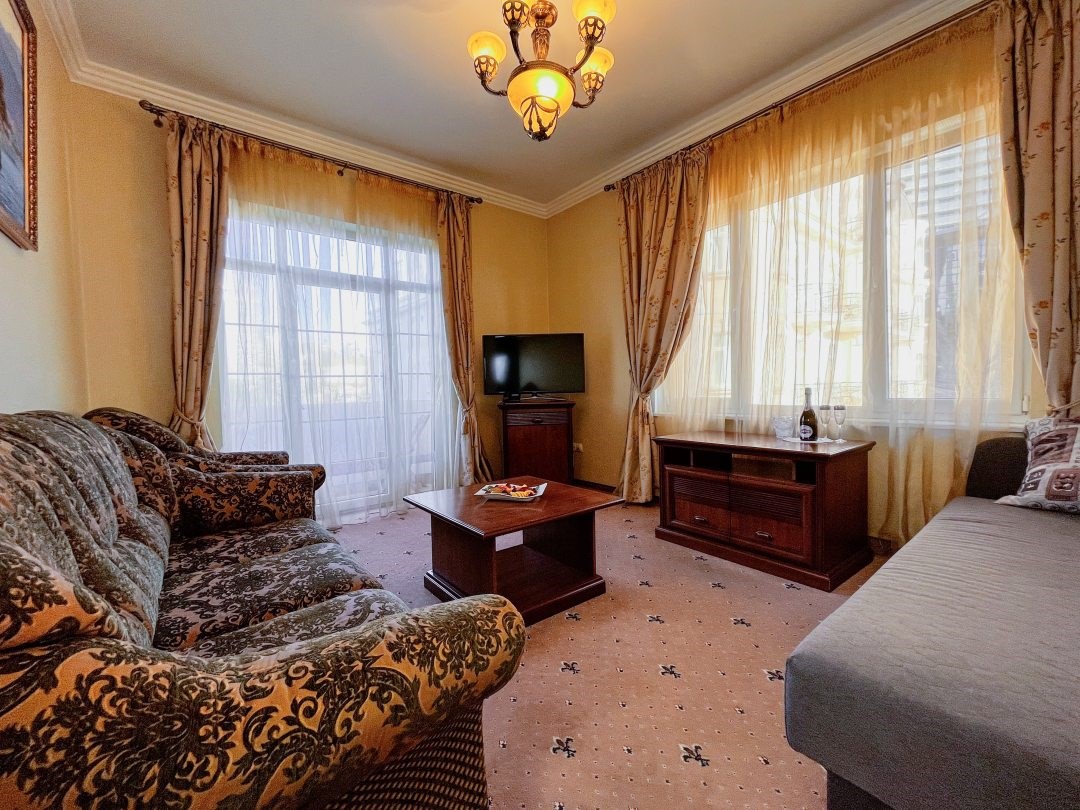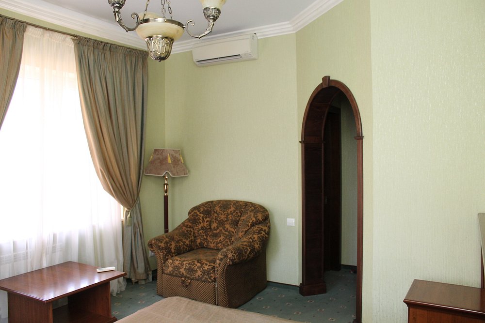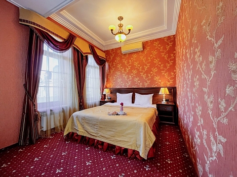 В номере: вешалка, диван, зеркало, кресла, кровать двуспальная, пуфик, столик журнальный, столик туалетный, стулья, шкаф, гладильная доска, кондиционер, мини-холодильник, сейф, сушилка для белья, телевизор, телефон, утюг, чайник