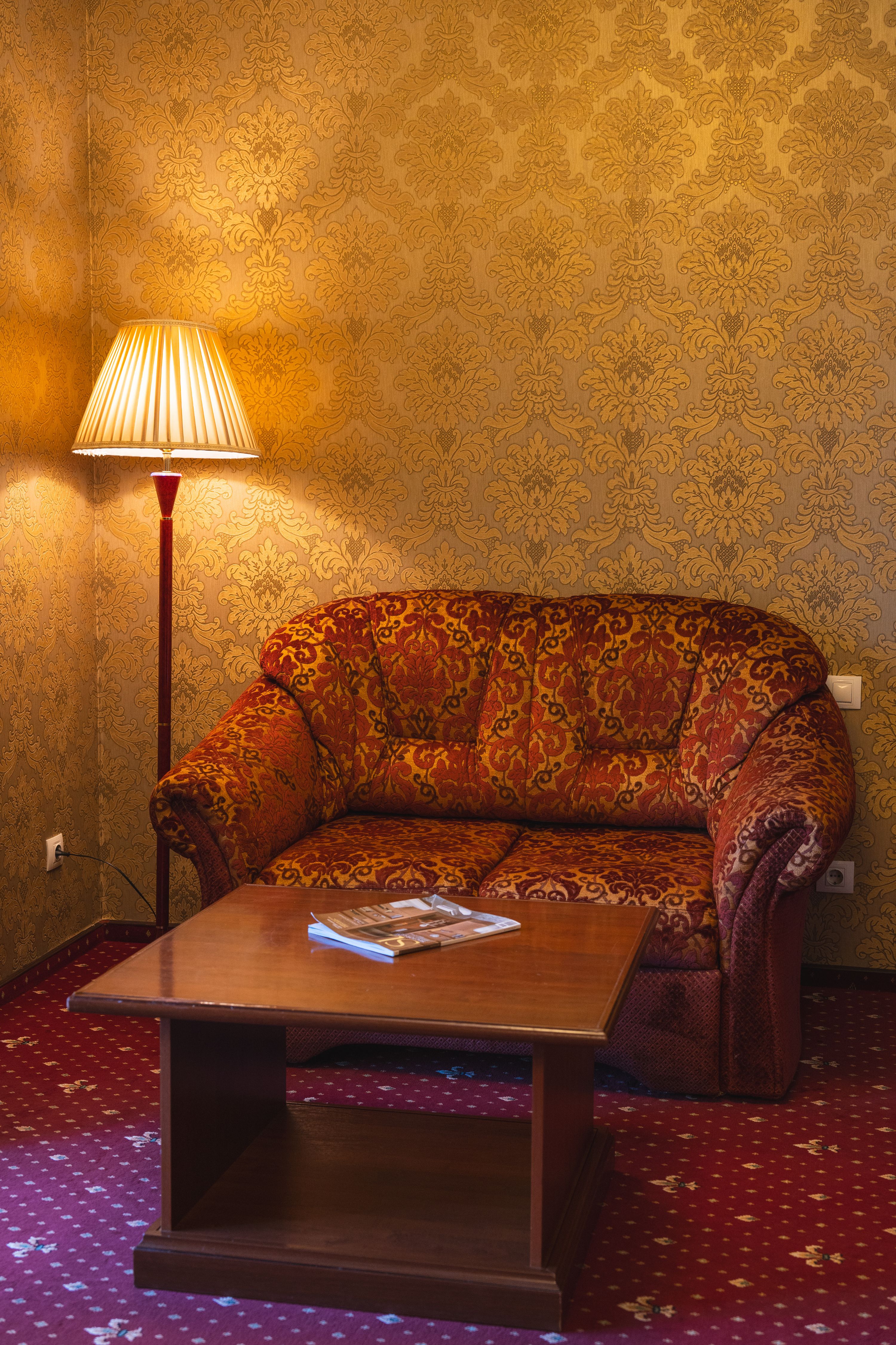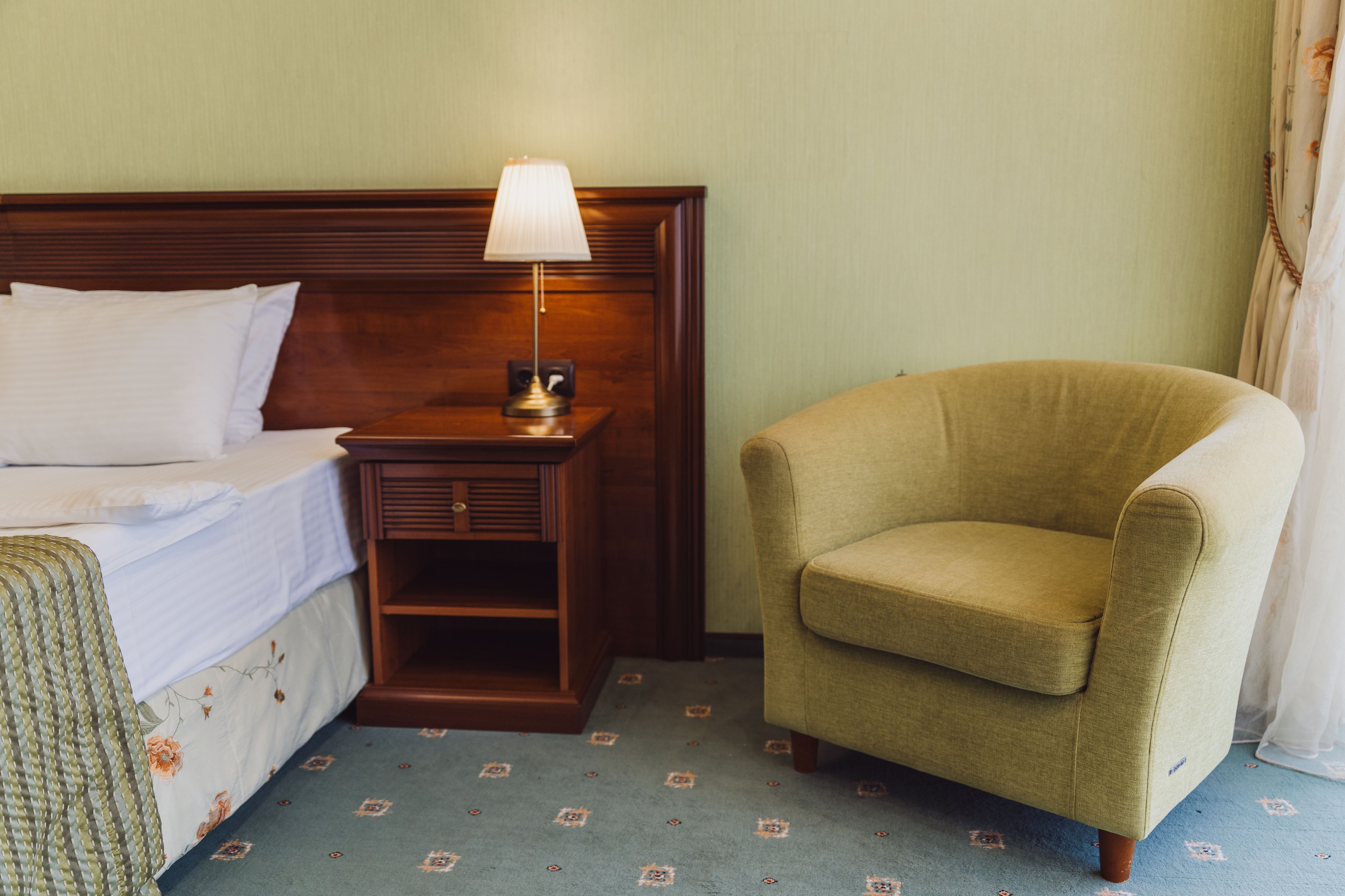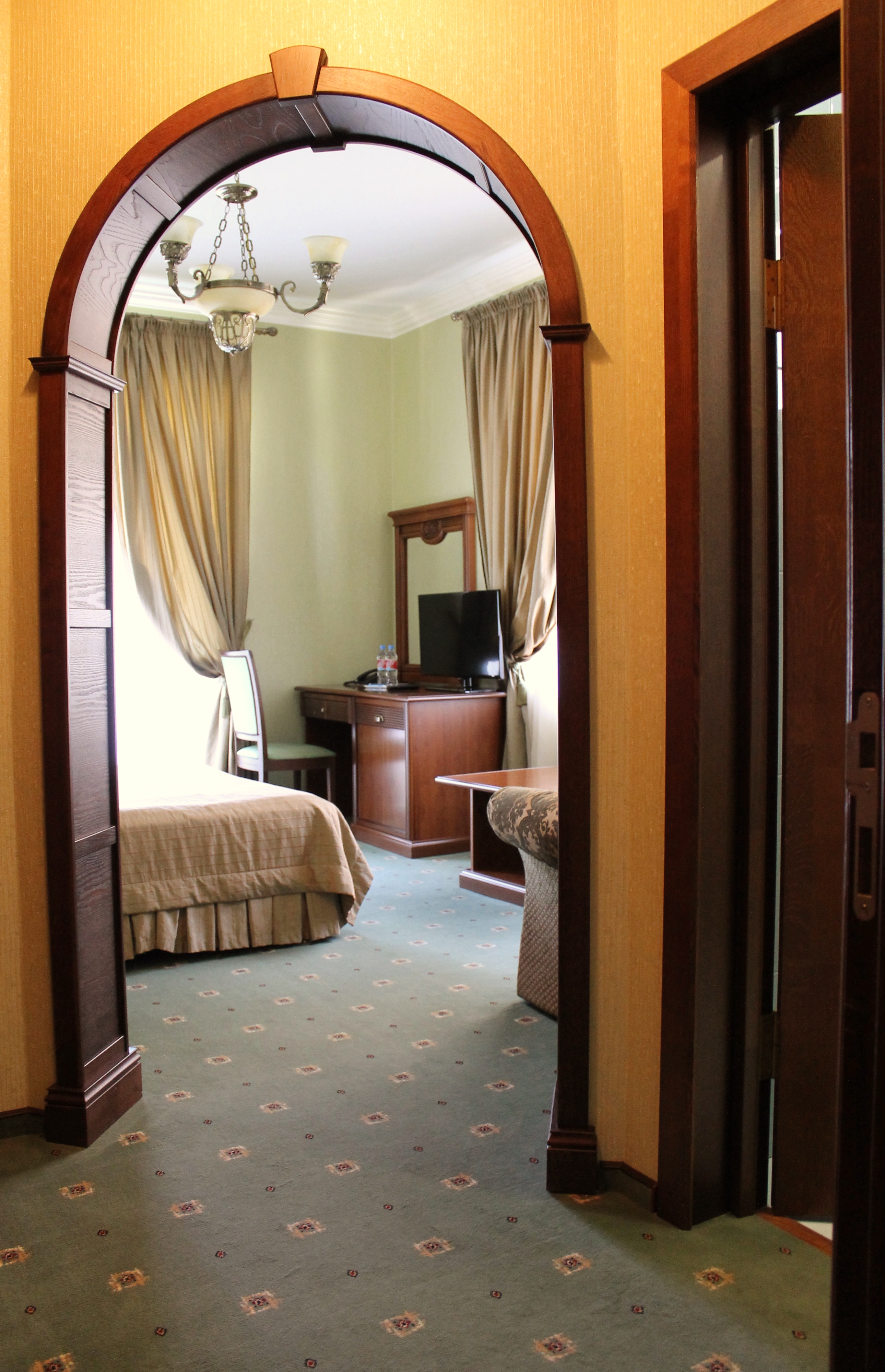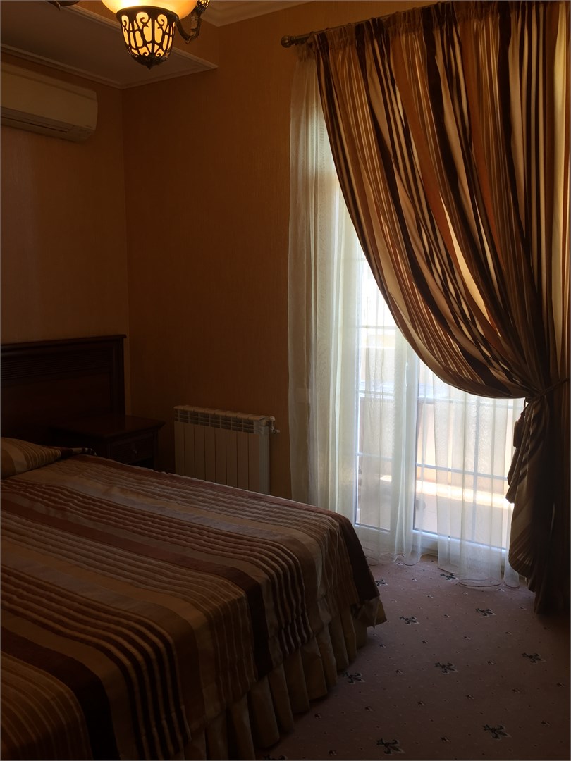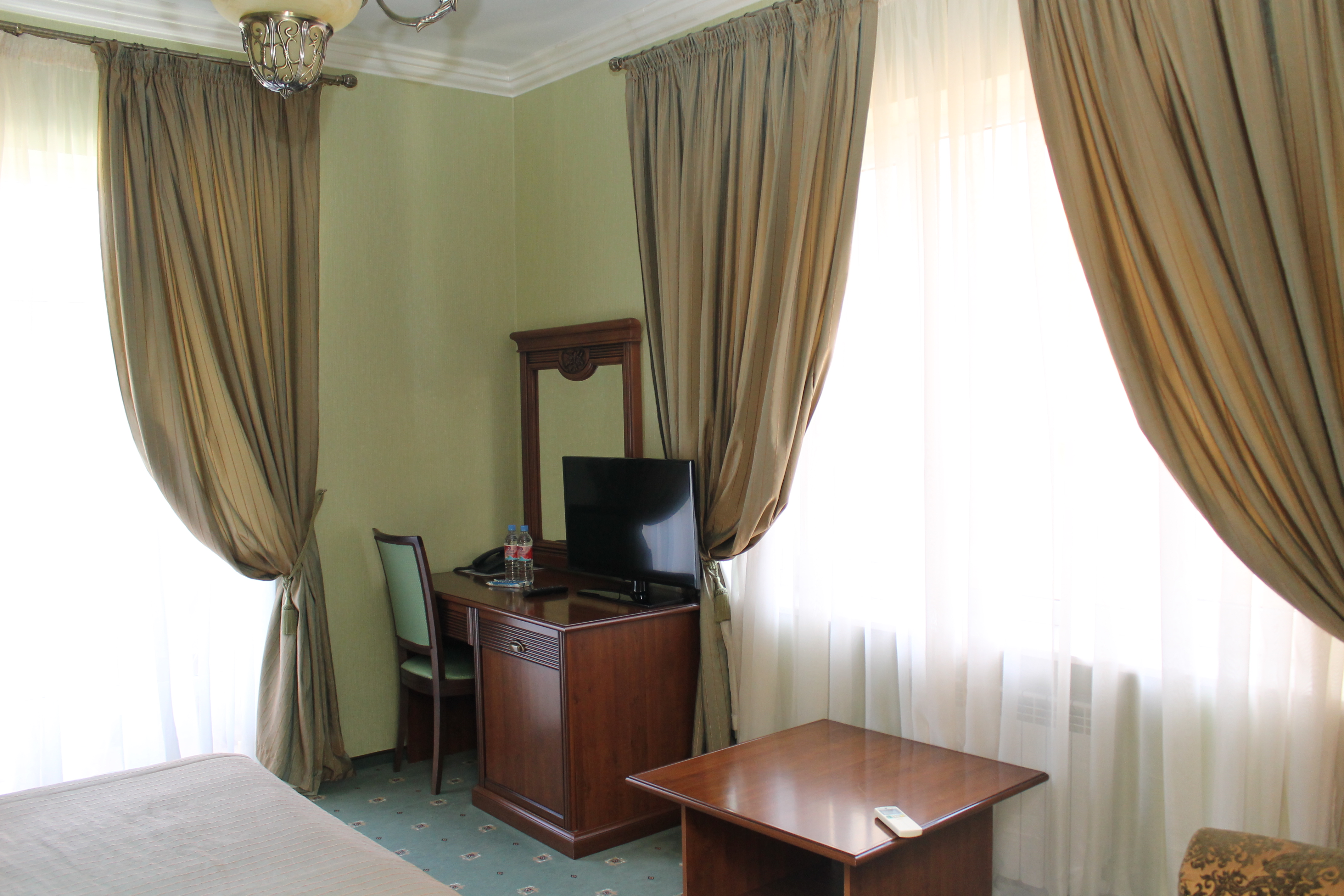В номере: вешалка, диван, зеркало, кресла, кровать двуспальная, пуфик, столик журнальный, столик туалетный, стулья, шкаф, гладильная доска, кондиционер, мини-холодильник, сейф, сушилка для белья, телевизор, телефон, утюг, чайник