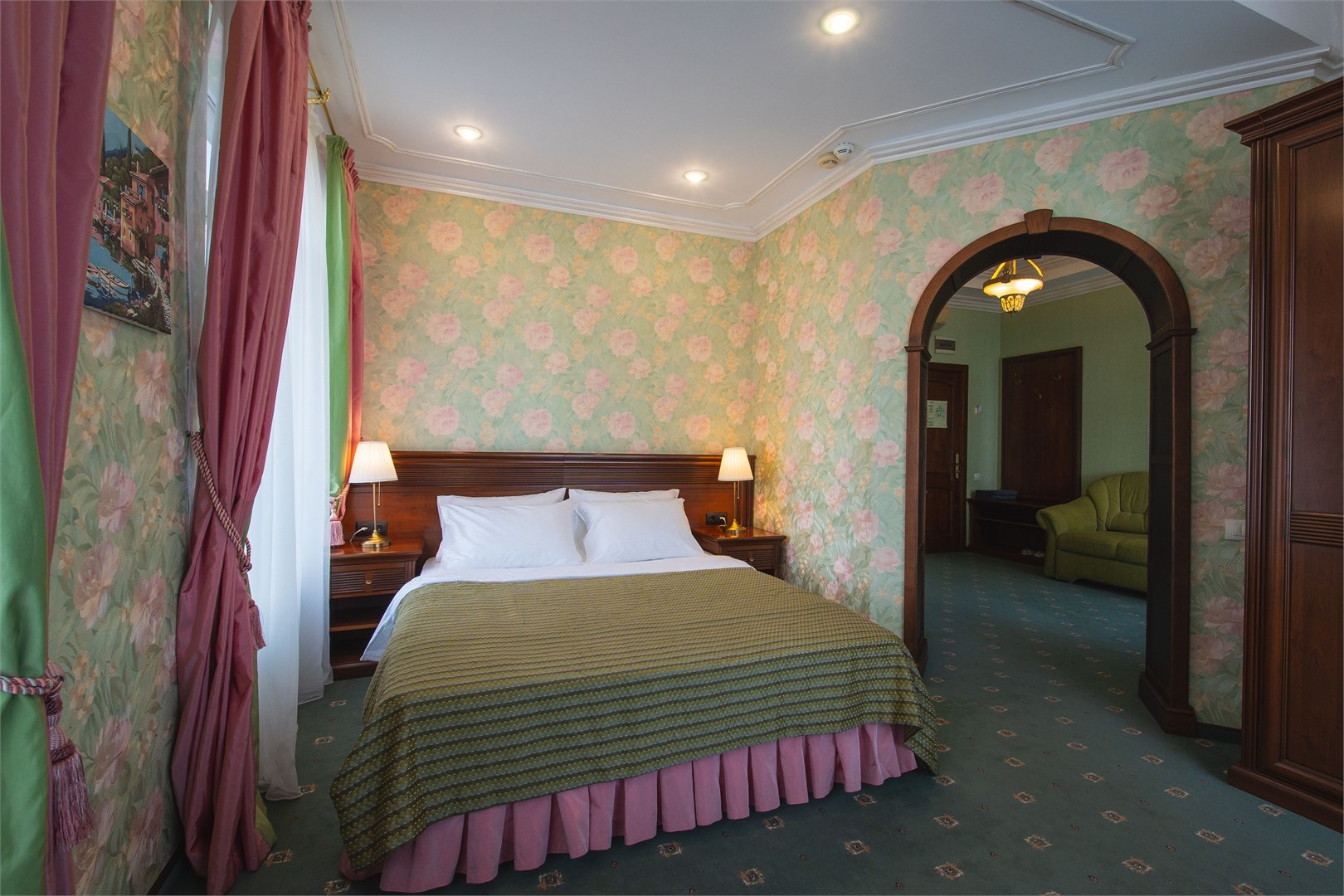 В номере: диван раскладной, зеркало, кровать двуспальная, прикроватные тумбочки, пуфик, стол, столик журнальный, стул, шкаф, гладильная доска, кондиционер, мини-холодильник, сейф, телевизор ЖК, телефон, утюг, чайный набор посуды, электрочайник