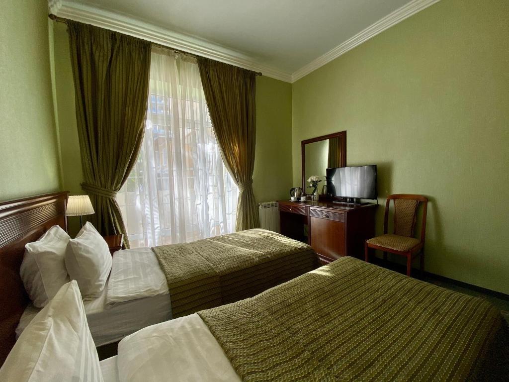 Жилой фонд включает в себя номера разных категорий: есть небольшие стандартные варианты, а есть просторные двухкомнатные номера. В комнатах классический интерьер, есть индивидуальный санузел, ванна или душ, сплит-система, ЖК-телевизор. В ряде номеров предусмотрены балконы с видами на город или море.В отеле работает бар, а по утрам открыт обеденный зал, где гости могут насладиться вкусными завтраками по системе «шведский стол». Среди услуг — спа-комплекс с крытым бассейном, сауной и джакузи, доступны различные спа-процедуры и массажи. Возле корпуса оборудована парковка: отдыхающие могут оставить там свой автомобиль при наличии свободных мест. Для детей предусмотрена уличная площадка с горками, где за малышами присматривает няня.В 300 метрах от корпуса расположен городской галечный пляж. Пляж комфортно оборудован, на побережье есть все необходимое: от раздевалок до шезлонгов и зонтиков.