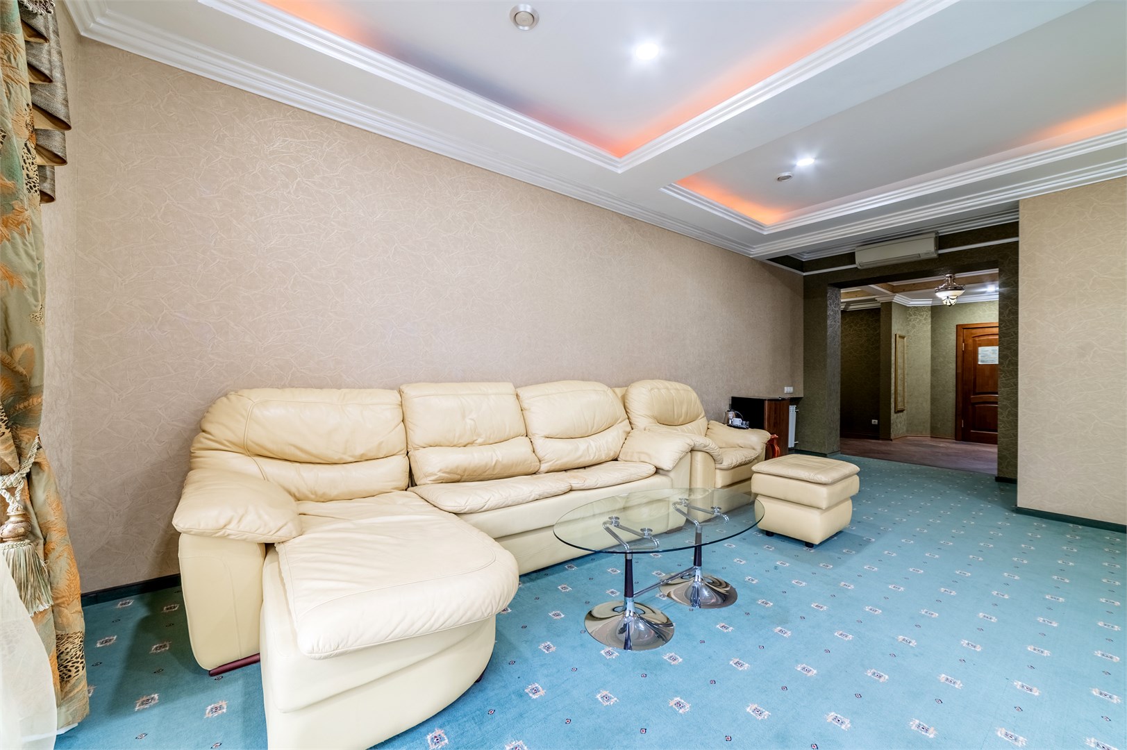 В номере: диван раскладной, зеркало, кресло, кровать двуспальная, прикроватные тумбочки, пуфик, стол, столик журнальный, стулья, шкаф, гладильная доска, кондиционер, сейф, телевизор ЖК, телефон, утюг, чайный набор посуды, электрочайник