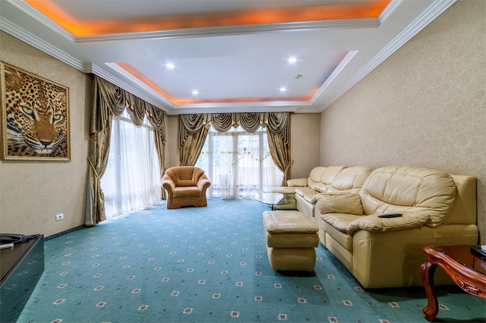 В номере: диван раскладной, зеркало, кровать двуспальная, прикроватные тумбочки, стол, столик журнальный, стул, шкаф, гладильная доска, кондиционер, мини-холодильник, сейф, телевизор ЖК, телефон, утюг, чайный набор посуды, электрочайник