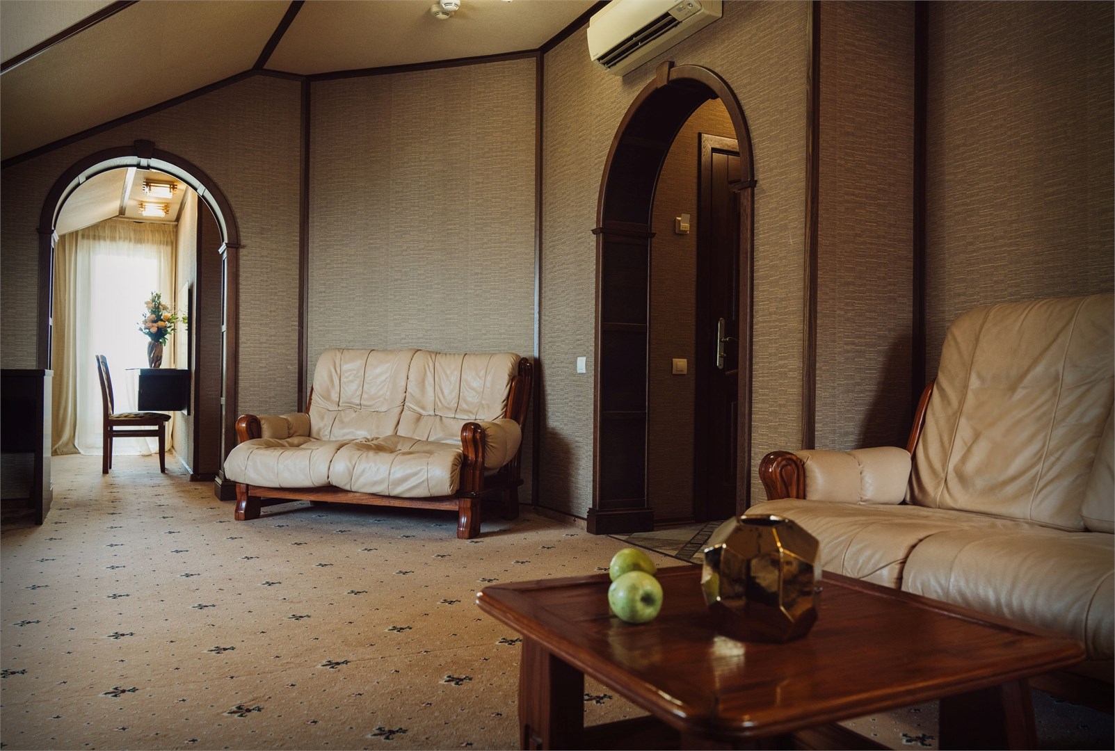 В номере: вешалка, диван, зеркало, кресла, кровать двуспальная, пуфик, стол, столик журнальный, столик туалетный, стулья, шкаф, кондиционер, мини-холодильник, сейф, сушилка для белья, телевизор, телефон, утюг, чайник