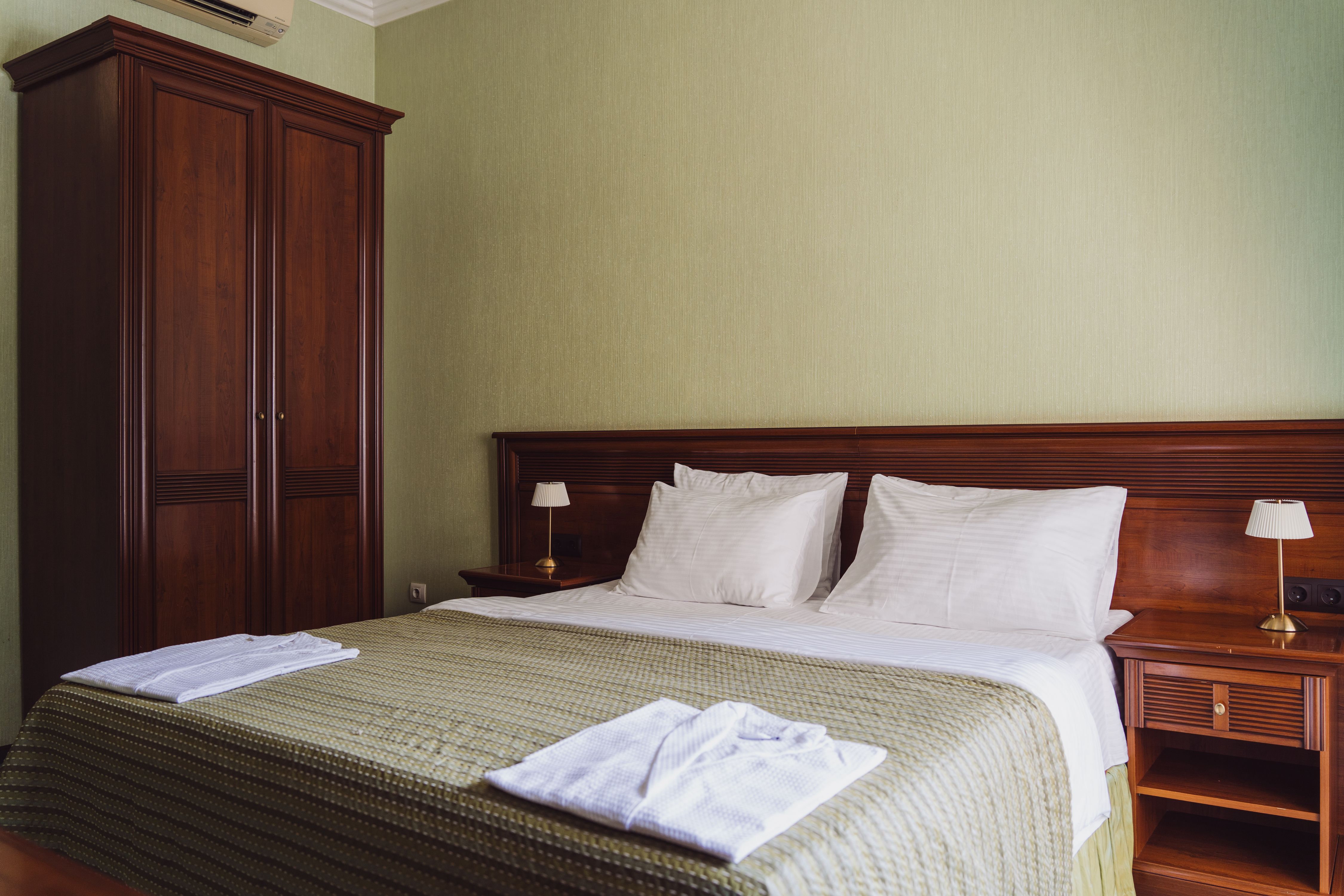 В номере: вешалка, диван раскладной, зеркало, кровать двуспальная, стол, столик журнальный, стул, шкаф, гладильная доска, кондиционер, мини-холодильник, сейф, сушилка для белья, телевизор, телефон, чайник