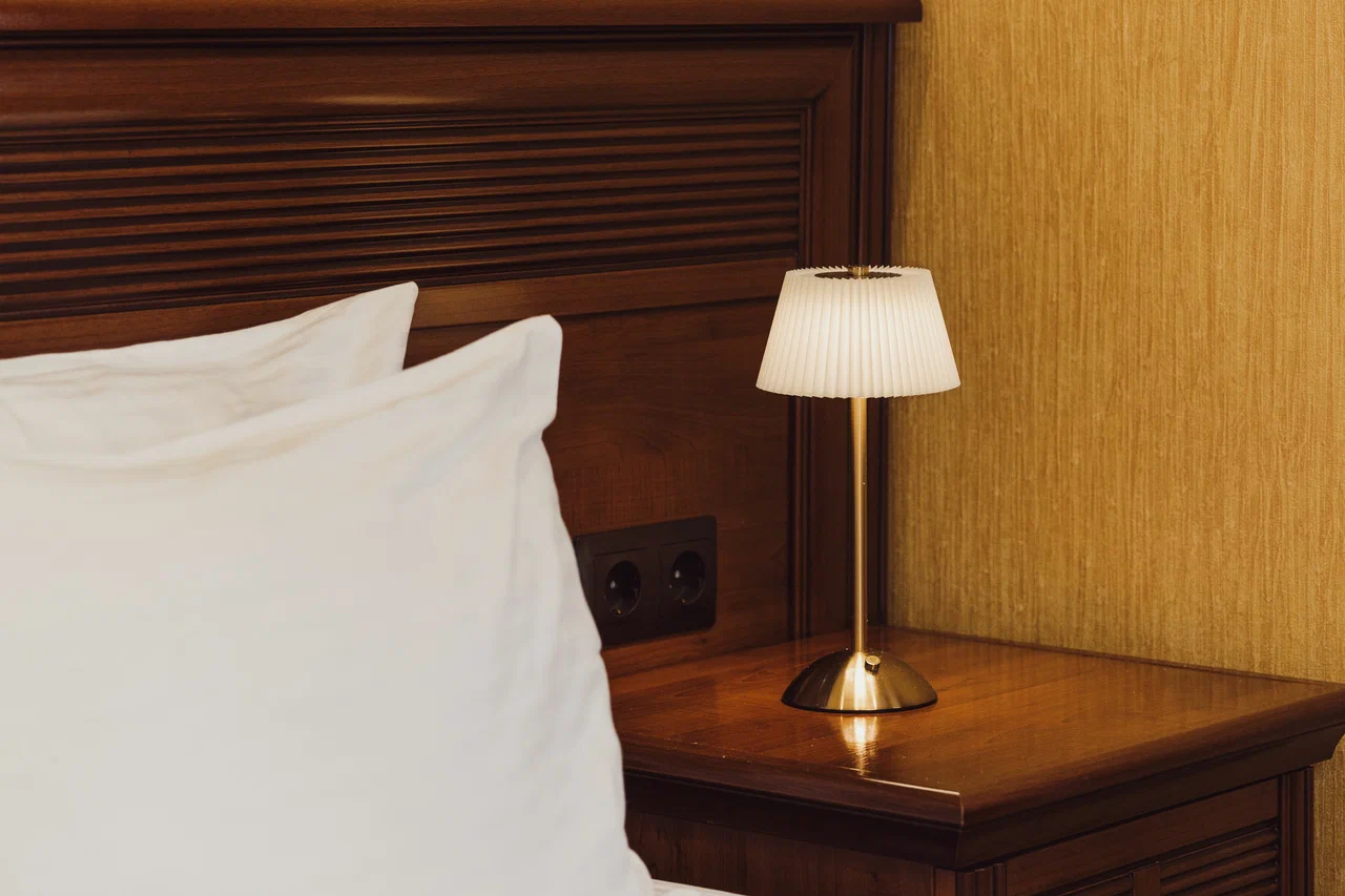 В номере: зеркало, кресло, кровать двуспальная, прикроватные тумбочки, стол, столик журнальный, стул, шкаф, гладильная доска, кондиционер, мини-холодильник, сейф, телевизор ЖК, телефон, утюг, чайный набор посуды, электрочайник