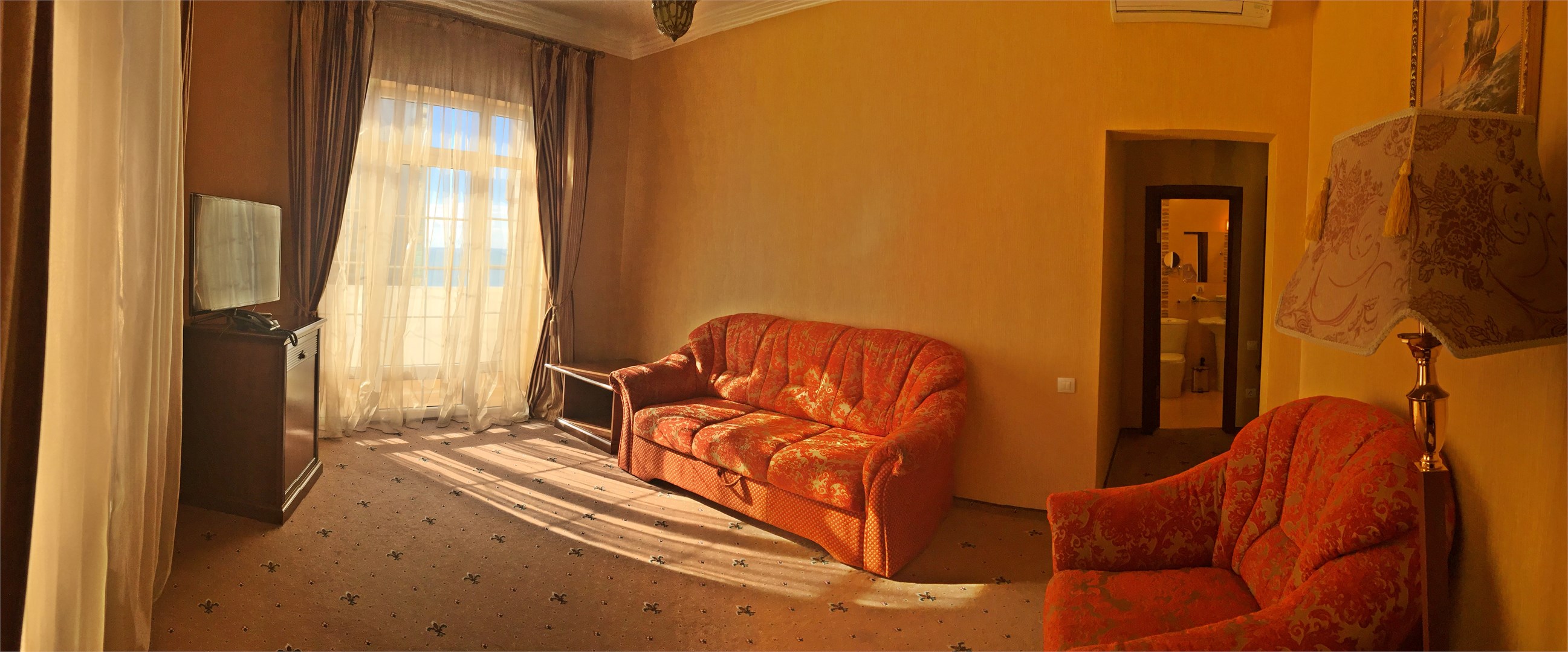 В номере: вешалка, диван раскладной, зеркало, кресло, кровать двуспальная, прикроватные тумбочки, пуфик, стол, столик журнальный, столик туалетный, стул, шкаф, гладильная доска, кондиционер, мини-холодильник, сейф, телевизор ЖК, телефон, утюг, чайный набор посуды, электрочайник