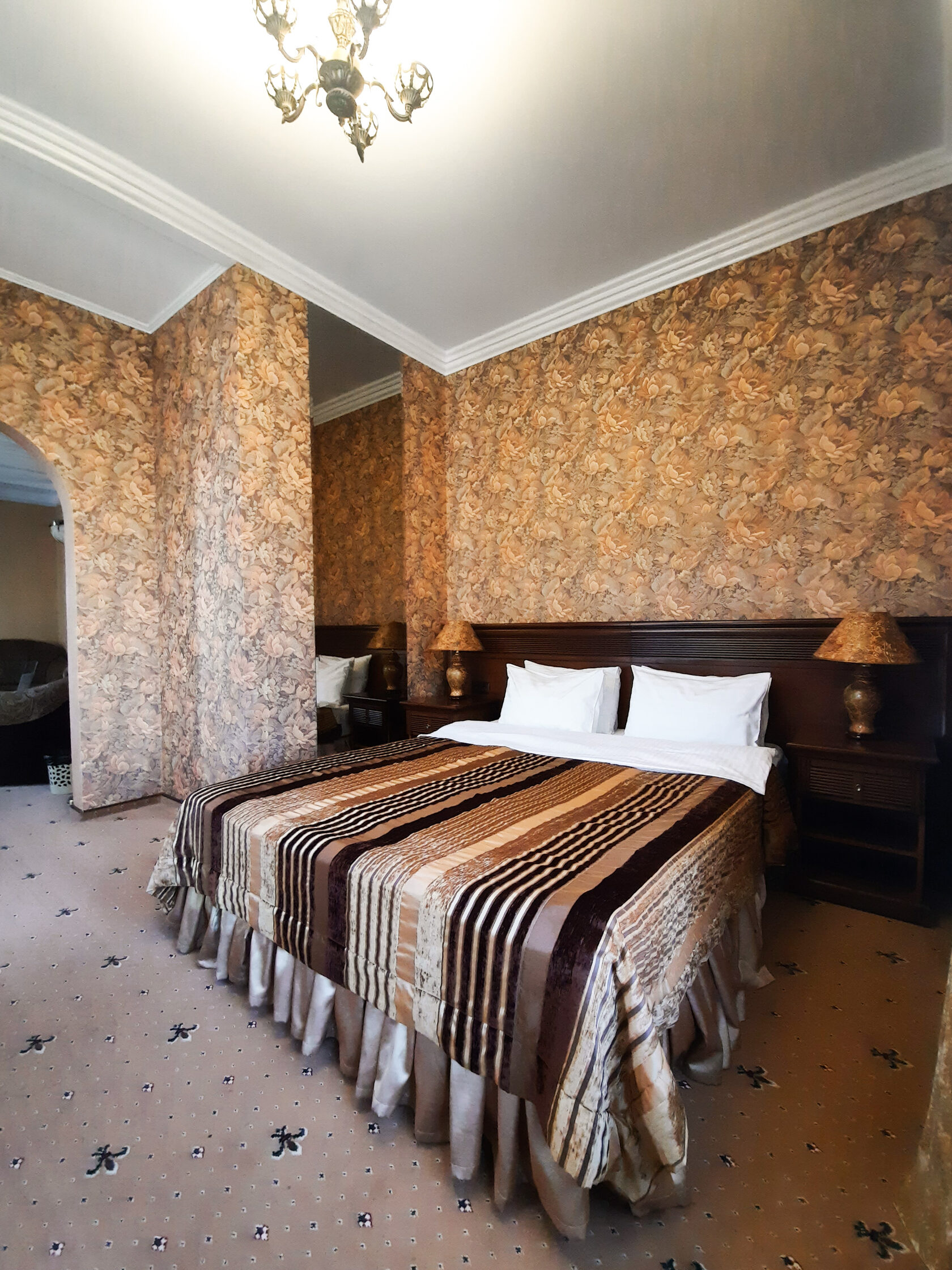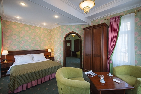 В номере: диван, кресла, кровать двуспальная, прикроватные тумбочки, пуфик, стол, столик журнальный, столик туалетный, стул, шкаф, гладильная доска, кондиционер, мини-холодильник, сейф, сушилка для белья, телевизор, телефон, утюг, чайный набор посуды, электрочайник