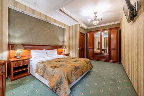 В номере: диван раскладной, зеркало, кресла, кровать двуспальная, прикроватные тумбочки, стол, столик журнальный, столик туалетный, стулья, шкаф, гладильная доска, кондиционер, мини-холодильник, сейф, телевизор ЖК, телефон, утюг, чайный набор посуды, электрочайник