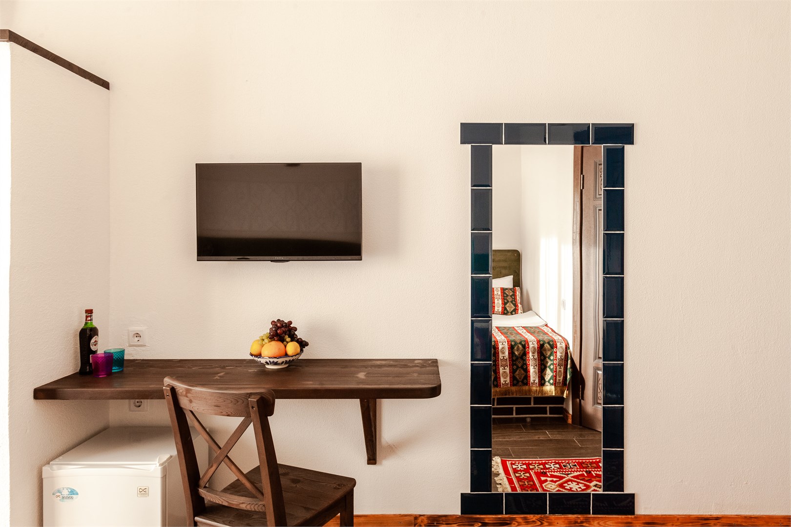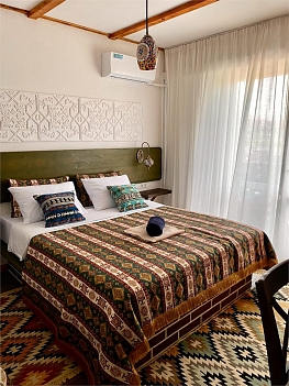 В номере: кровать двуспальная, прикроватные тумбочки, стол, стулья, шкаф, кондиционер, мини-холодильник, сейф, телевизор