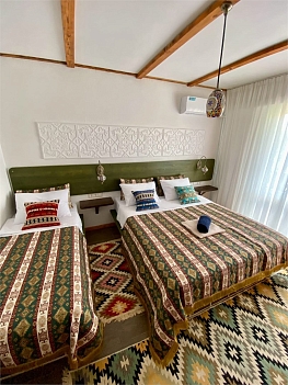 В номере: кровать двуспальная, кровать полутороспальная, прикроватные тумбочки, стол, стулья, шкаф, кондиционер, мини-холодильник, сейф, телевизор