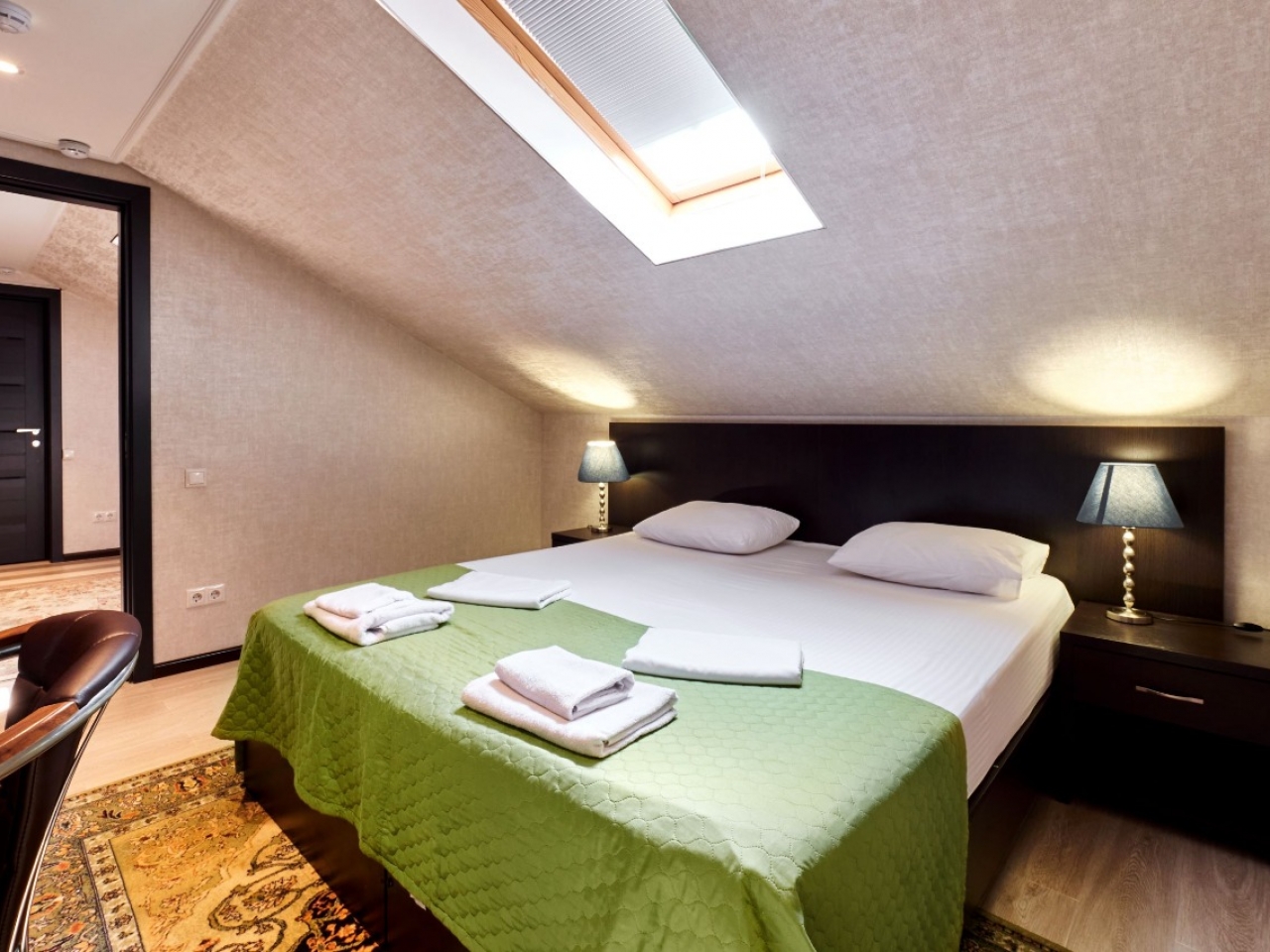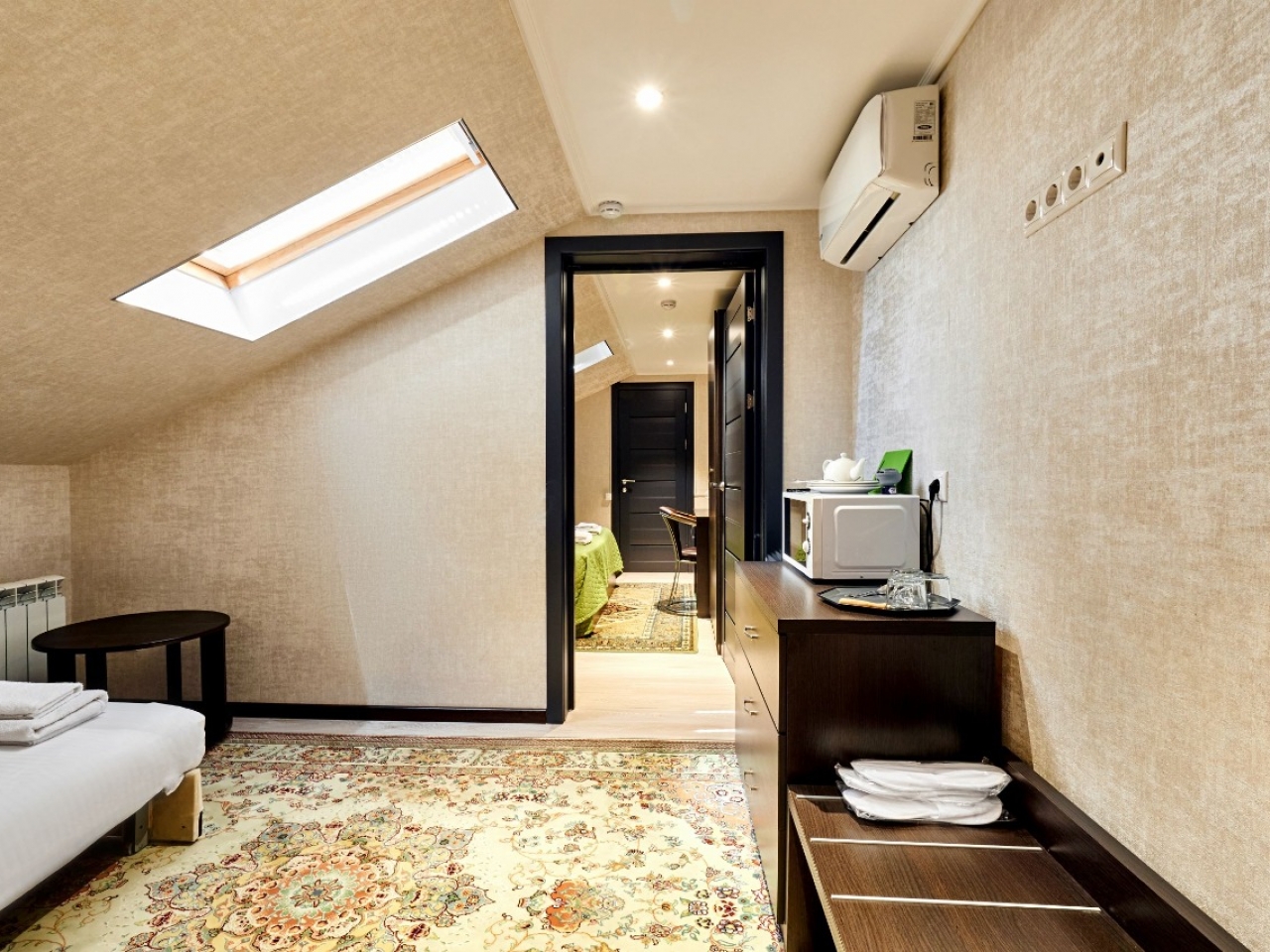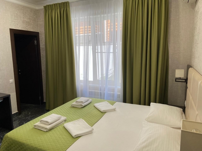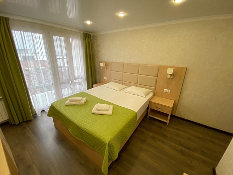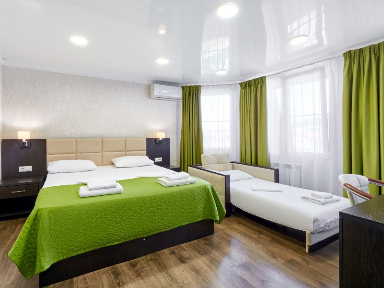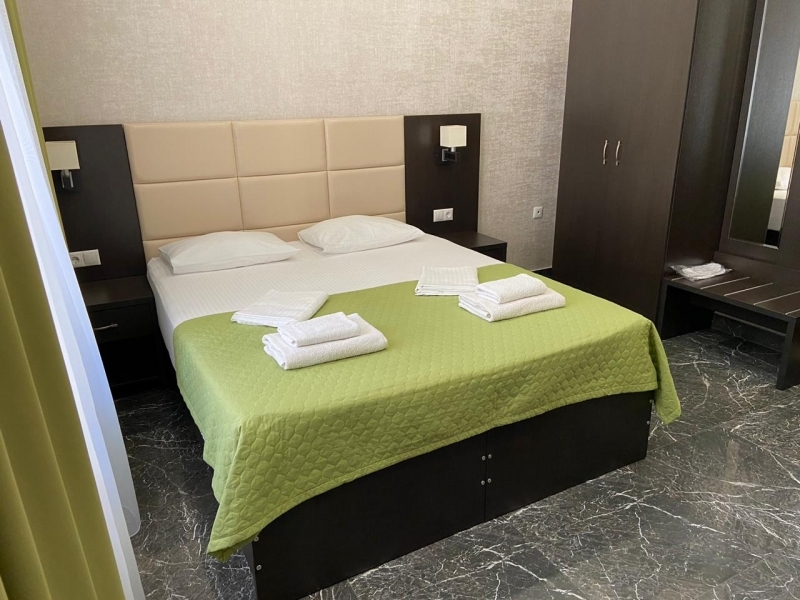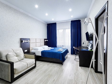 В номере: вешалка, зеркало, комод, кресло-кровать, кровать двуспальная, кровать односпальная, прикроватные тумбочки, стол, столик журнальный, стул, шкаф, кондиционер, мини-холодильник, сейф, телевизор ЖК, чайный набор посуды