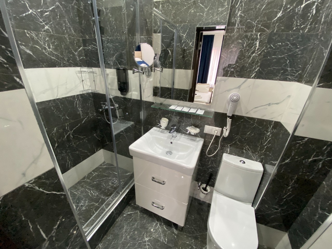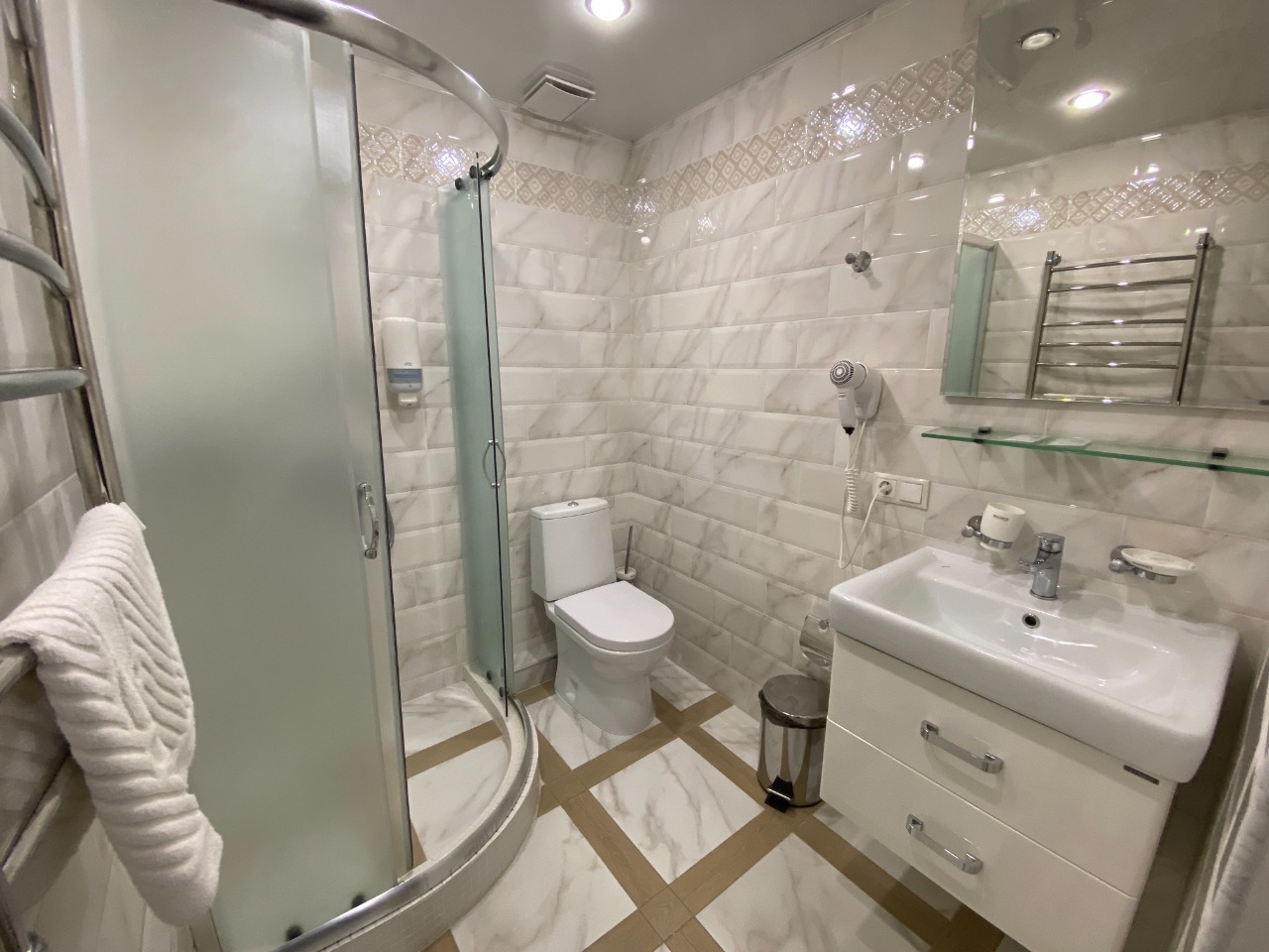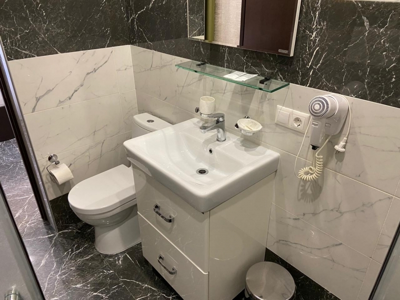 Санузел: с душевой кабиной, тапочки, туалетные принадлежности, фен