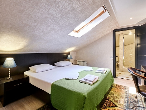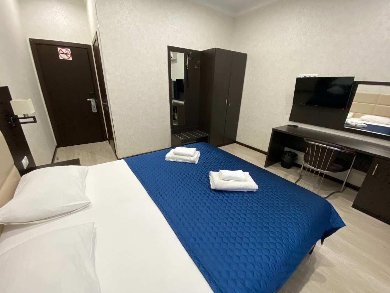 В номере: вешалка, зеркало, кресло-кровать, кровать двуспальная, прикроватные тумбочки, стол, стул, шкаф, кондиционер, мини-холодильник, сейф, телевизор ЖК, чайный набор посуды