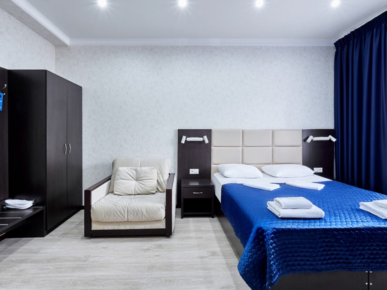 Отель «Блю Марин» – это хороший выбор для тех, кто хочет насладиться отдыхом в центре федеральной территории "Сириус", в шаговой доступности от Олимпийского парка и главных достопримечательностей региона. Выгодное расположение вблизи основных транспортных узлов, таких как аэропорт и ж/д вокзал Адлера, можно легко добраться до самых интересных и популярных мест Большого Сочи.В отеле представлены комфортные номера, оборудованные современной мебелью, санузлом с душем и феном, включая отопление, кондиционер, сейф, телевизор и мини-холодильник. Дополнительно для гостей доступны гладильные принадлежности и кулеры с водой, установленные на каждом этаже, что обеспечивает комфорт во время проживания.