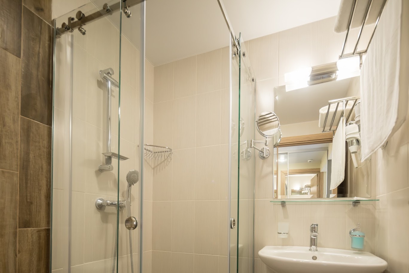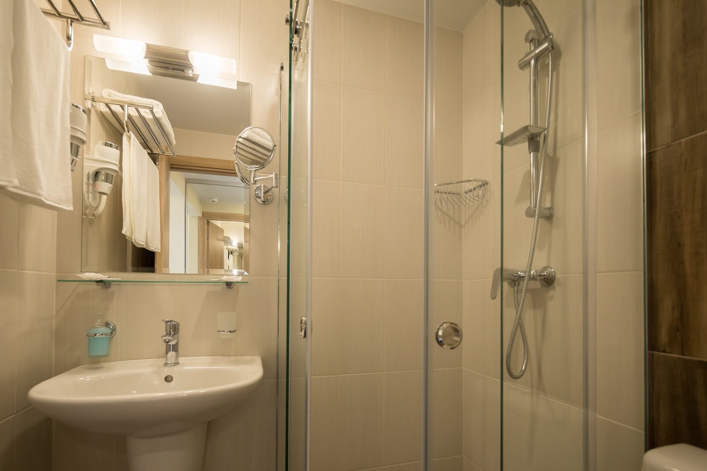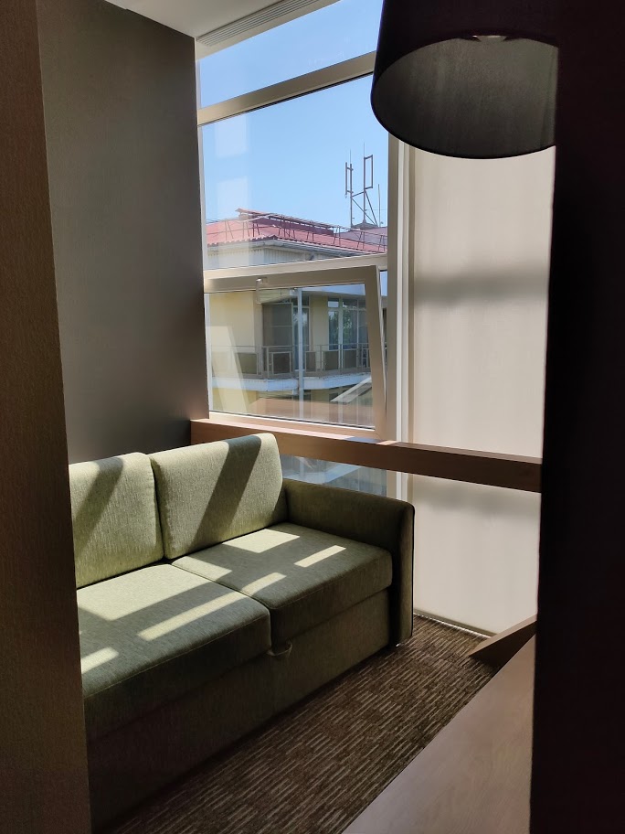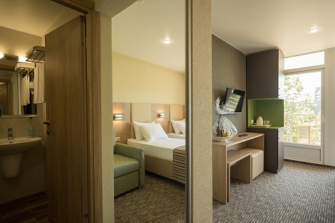 В номере: вешалка, зеркало, кресло-кровать, кровати односпальные, прикроватные тумбочки, стол, столик кофейный, стул, шкаф, кондиционер, сейф, телевизор, телефон, холодильник, электрочайник