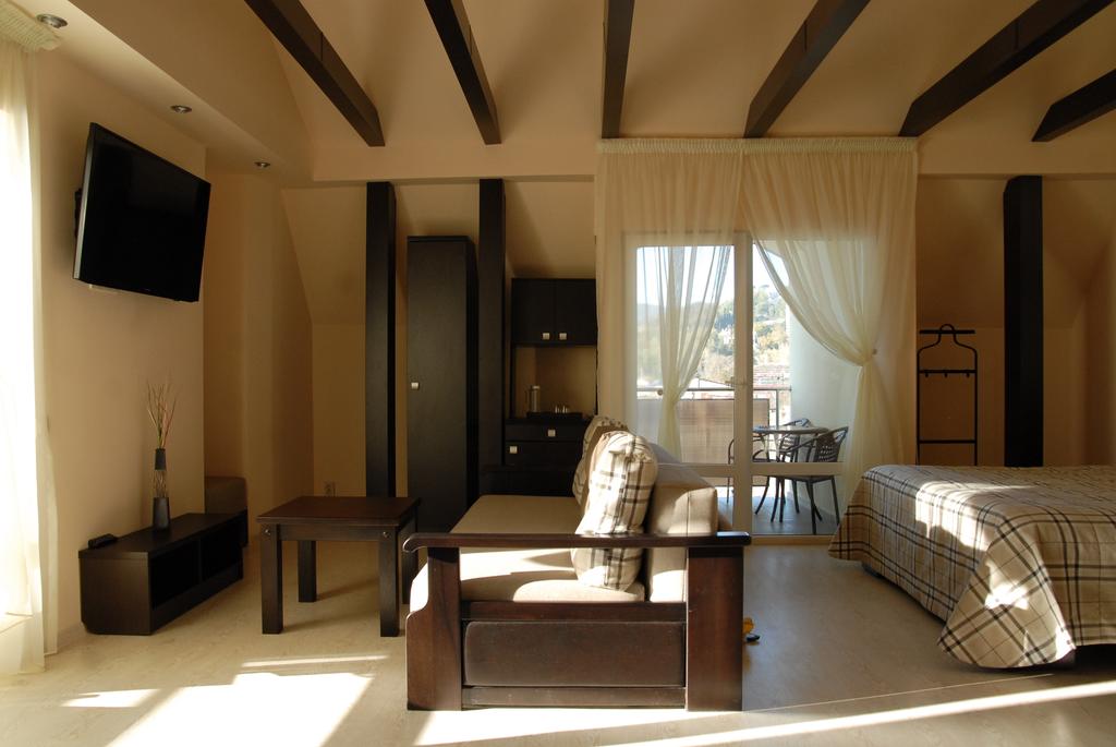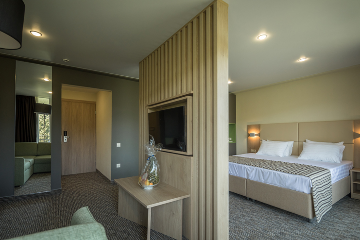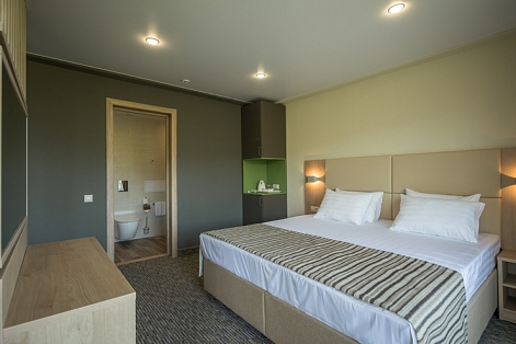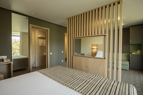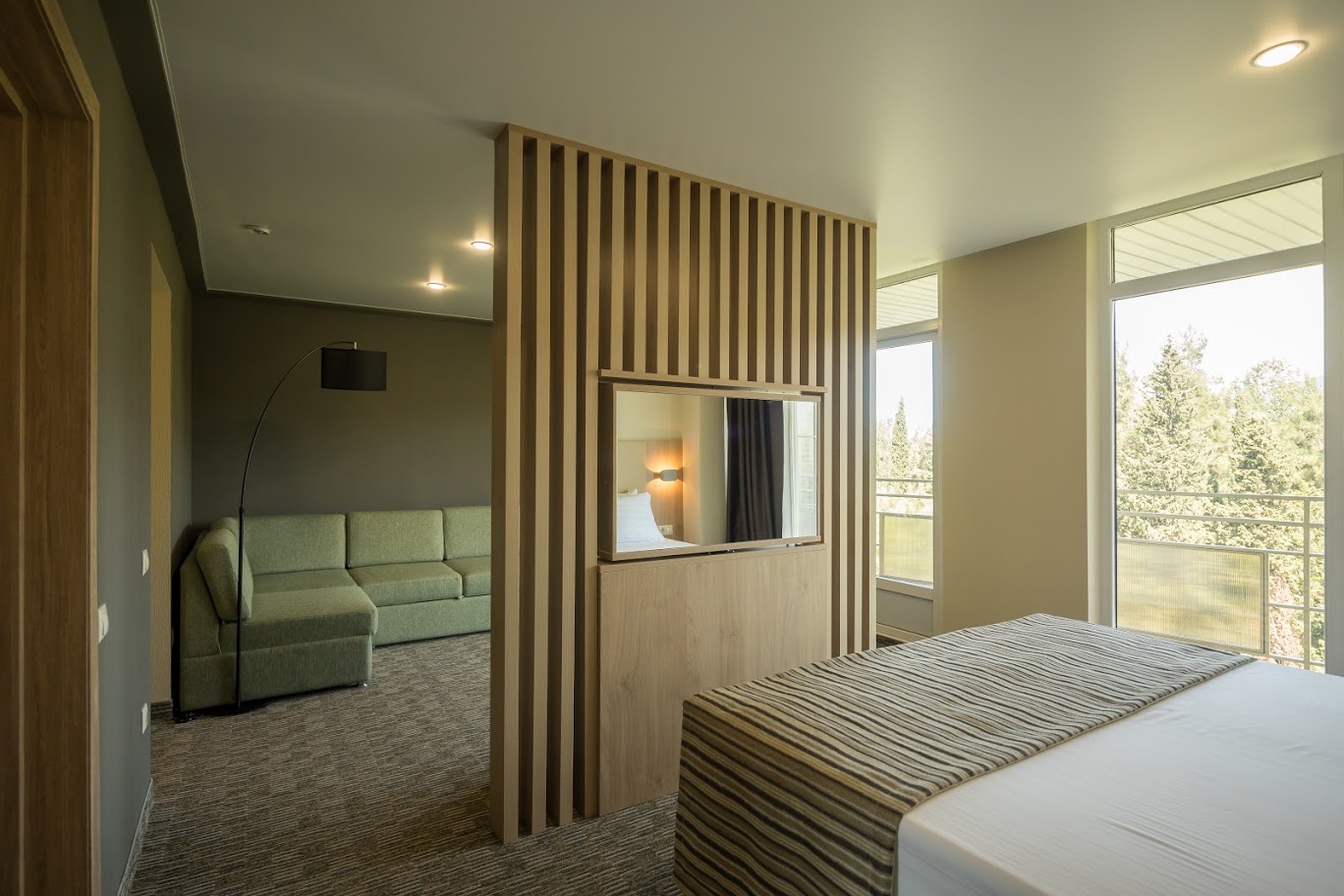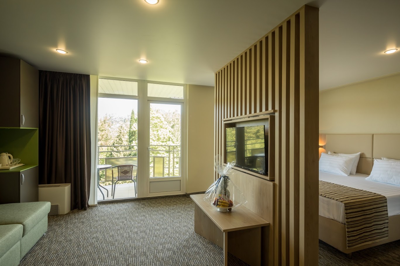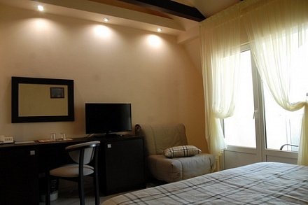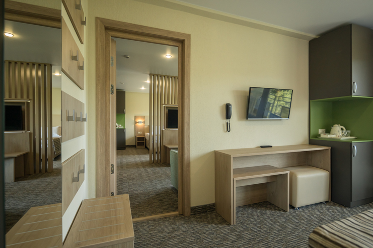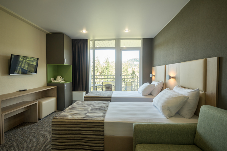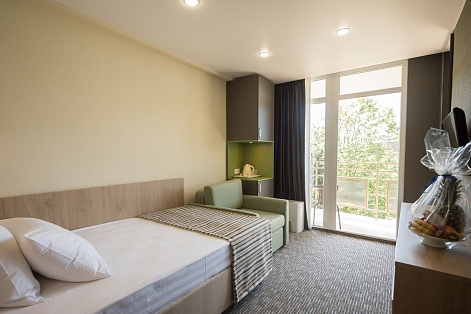 В номере: диван раскладной, зеркало, кресло-кровать, кровать двуспальная, кровать полутороспальная, прикроватные тумбочки, стол, стул, шкаф, кондиционер, сейф, сплит-система, телевизор ЖК, телефон, холодильник, электрочайник