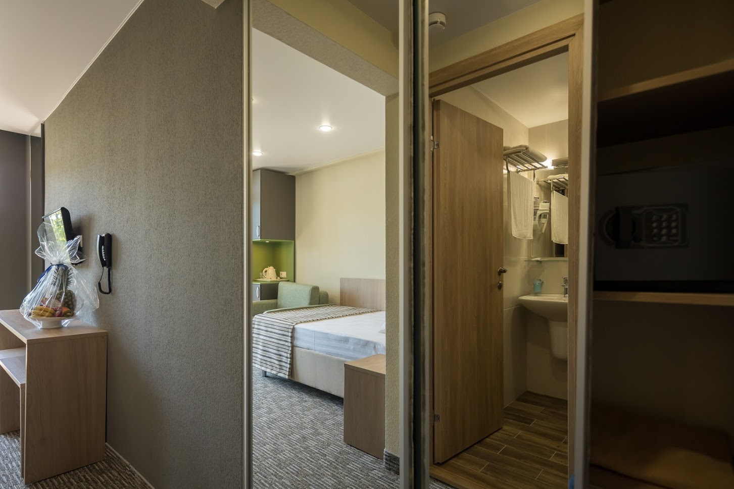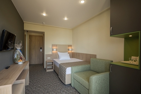 В номере: вешалка, зеркало, кресло-кровать, кровать полутороспальная, прикроватная тумбочка, стол, столик кофейный, стул, шкаф, кондиционер, сейф, телевизор, телефон, холодильник, электрочайник