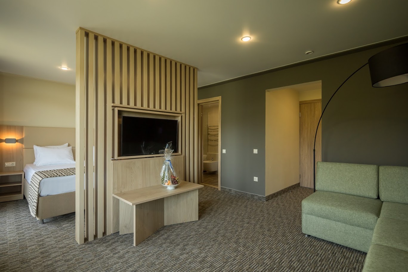 В номере: вешалка, диван раскладной, зеркало, кресла, кровать двуспальная, прикроватные тумбочки, столик журнальный, столик туалетный, стул, шкаф, кондиционер, сейф, сплит-система, телевизор, телефон, холодильник, электрочайник