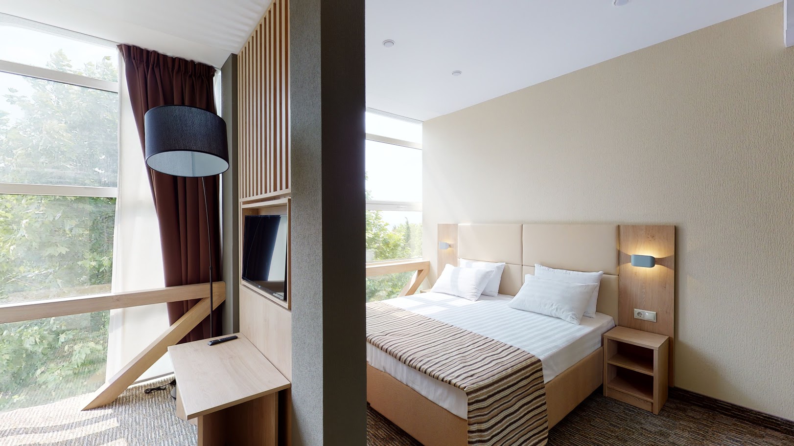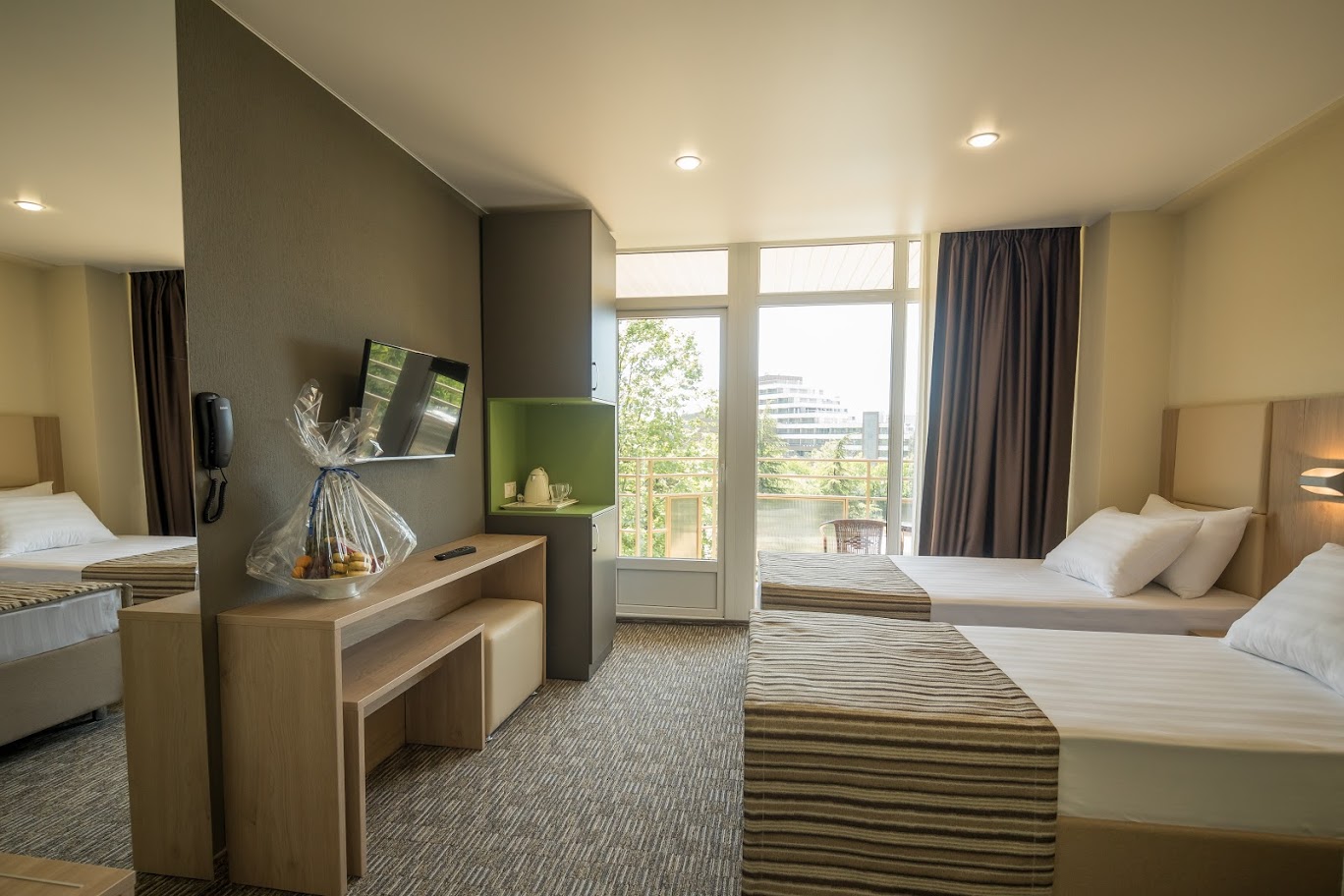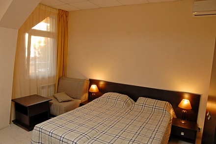 В состав комплекса входят два основных корпуса, а также малоэтажные пляжные корпуса. Здания пансионата прошли реконструкцию и были переоборудованы - и теперь их можно назвать полностью соответствующими всем современным требованиям к комфорту. Номерной фонд включает номера семи категорий - светлые, элегантные, хорошо обставленные, оснащенные сплит-системами, с видом на Черное море, величественные горы или зеленый дендропарк. Номера укомплектованы сейфами, холодильниками, TV, установлены телефоны, есть фены. Они рассчитаны на одно- или двухместное размещение, предусмотрены и доп. места. Обслуживание номеров производится круглосуточно. В летний сезон в пансионате организуется трехразовое питание по системе «Все включено». Также в пансионате работает кафе и два бара. На территории пансионата есть все необходимое для разнообразного, полноценного и запоминающегося отдыха, расслабления и лечения. Работает спортивно-оздоровительный комплекс, есть современный открытый бассейн с подогревом, сауна, массажные кабинеты. Многопрофильный лечебно-диагностический медцентр отеля, принимающий на лечение как взрослых, так и детей, отлично оснащен, на его базе проводится широкий спектр процедур, что позволяет пансионату принимать гостей не только на отдых, но и на санаторно-курортное лечение. Те, кто прибыл в Сочи с деловыми целями, могут использовать «Бургас» и как рабочую площадку - можно арендовать один из трех отлично оснащенных конференц-залов, подходящих для проведения мероприятий разного масштаба. А для маленьких гостей обустроена специальная зона в бассейне, работает детский клуб с воспитателями, есть детская площадка и пункт проката велосипедов, машинок, роликов и т.д. Расстояние от основных корпусов пансионата до пляжа - около 150 метров. Пляж у отеля песчано-галечный, ухоженный, оборудованный всем необходимым для комфортного отдыха.