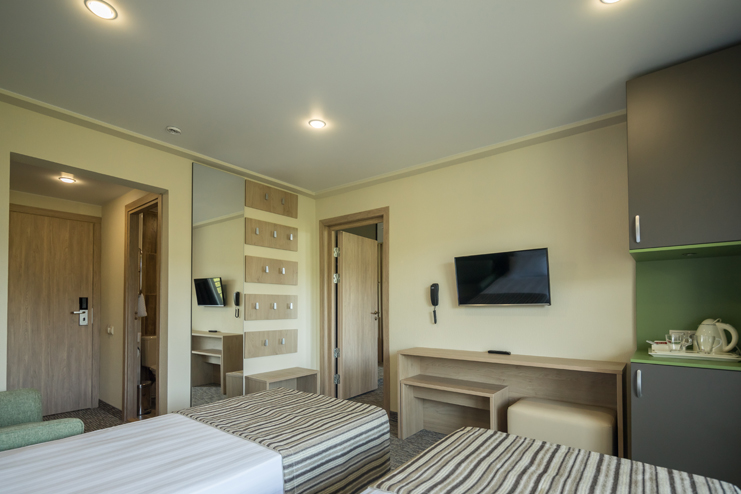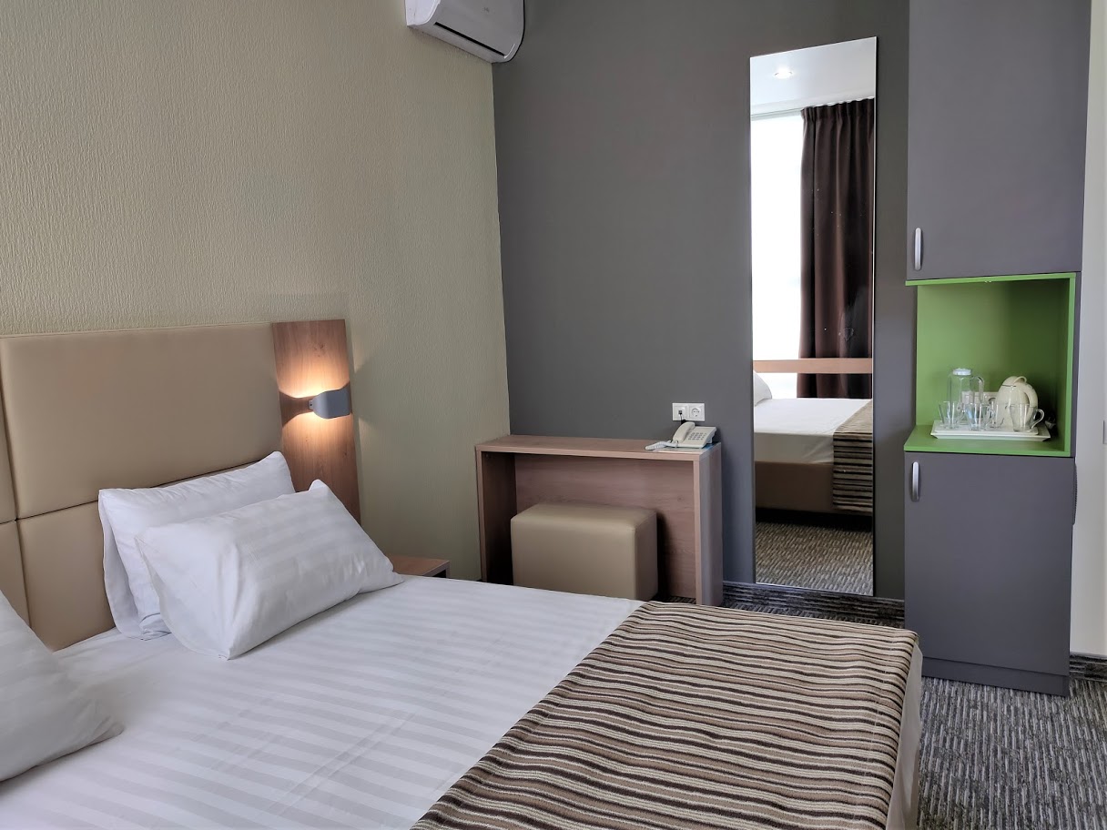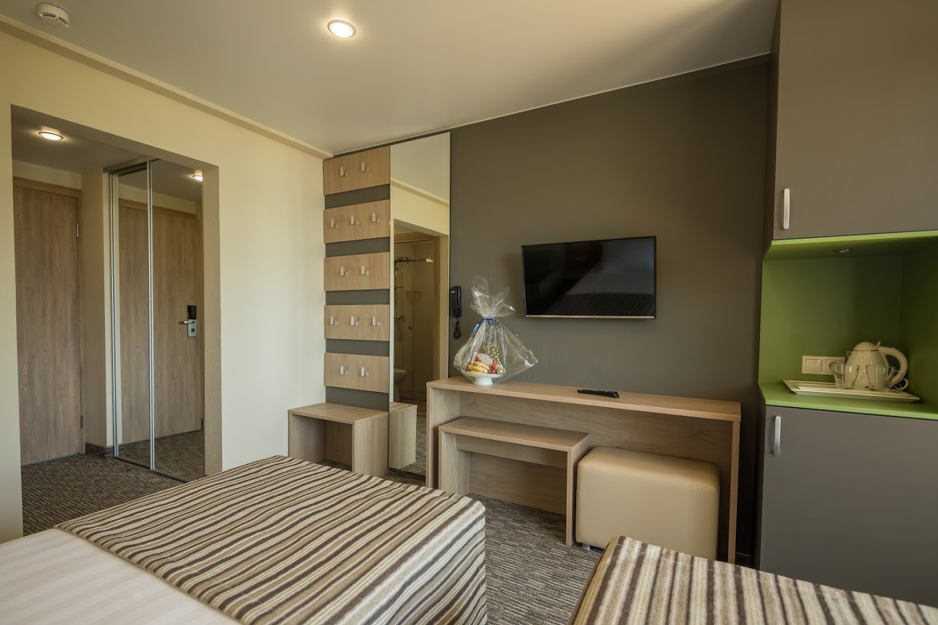 В номере: зеркало, кровати односпальные, прикроватные тумбочки, стол, стулья, шкаф, кондиционер, сейф, телевизор ЖК, телефон, холодильник, электрочайник