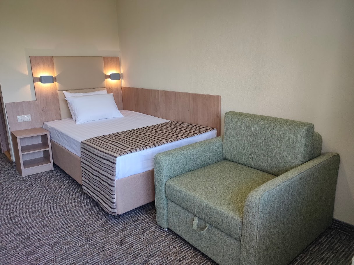 В номере: вешалка, зеркало, кресло-кровать, кровати односпальные, обувная полка, прикроватные тумбочки, столик туалетный, стул, шкаф, кондиционер, сейф, телевизор, холодильник, электрочайник