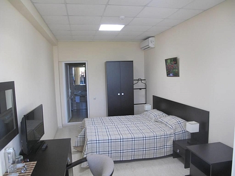 В номере: вешалка, кровать полутороспальная, прикроватная тумбочка, стол, стул, шкаф, кондиционер, мини-холодильник, сейф, телевизор, телефон, электрочайник