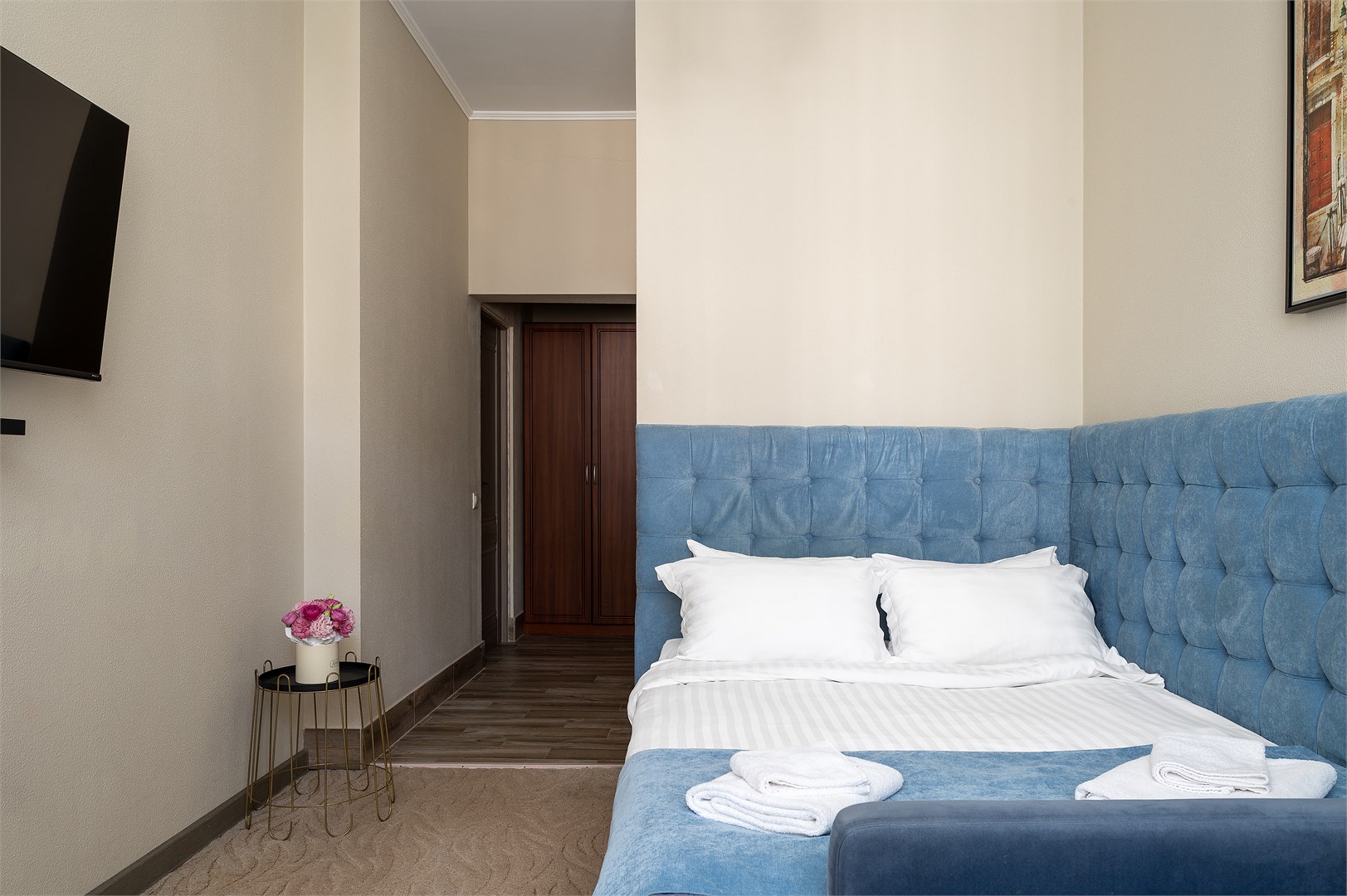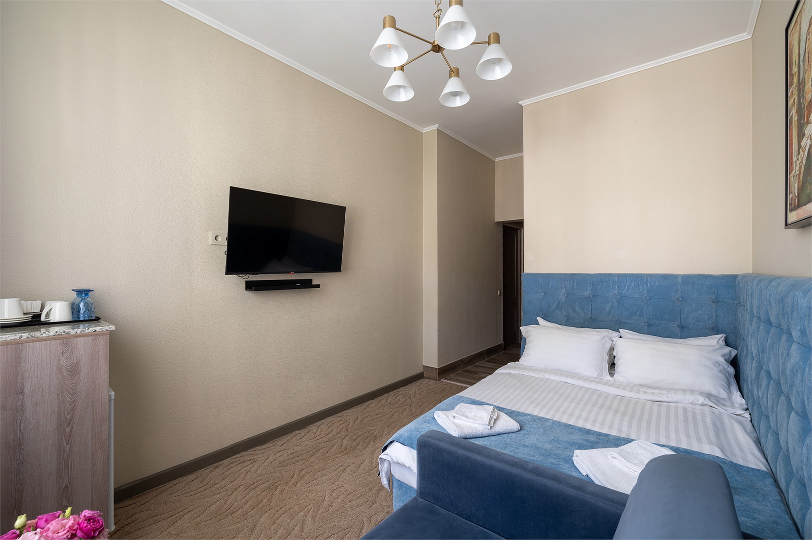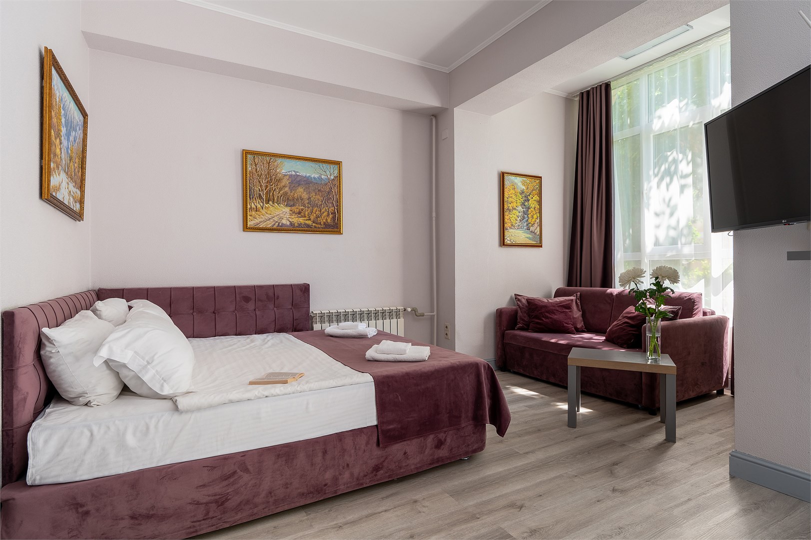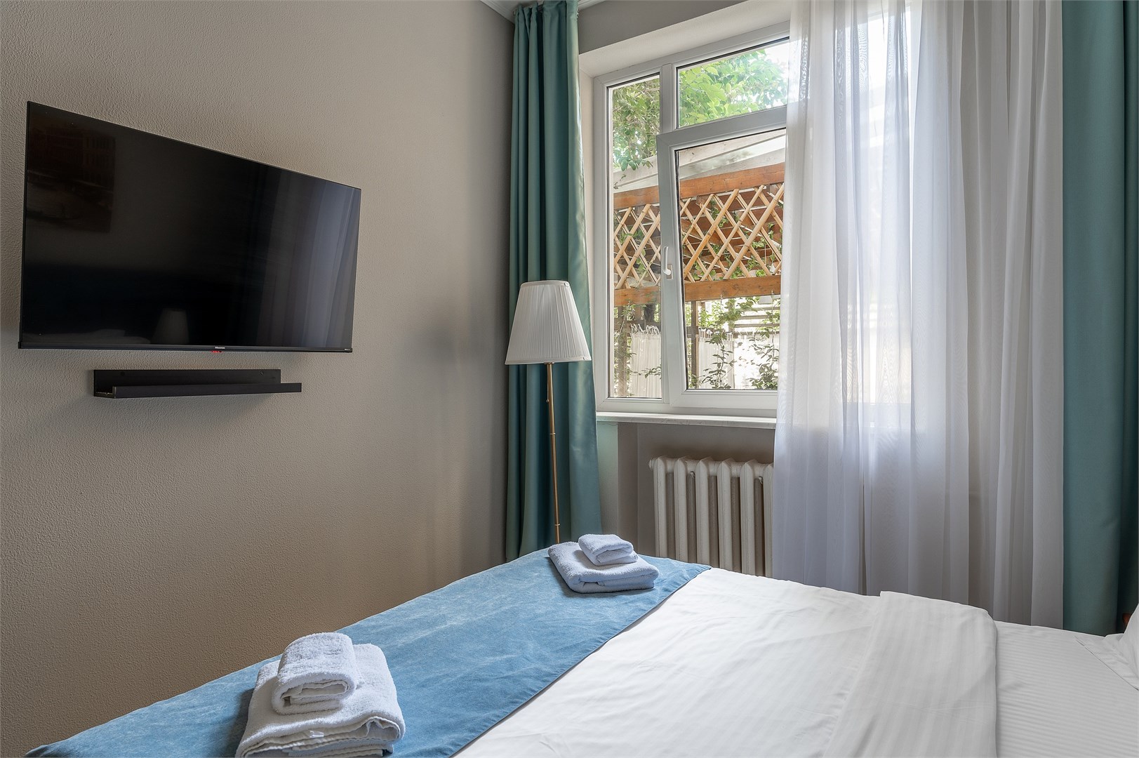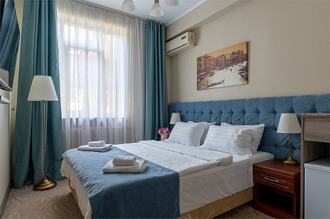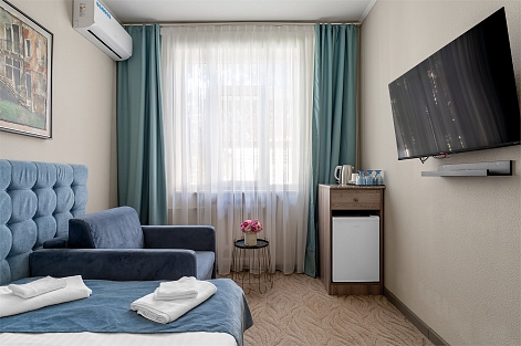 В номере: вешалка, зеркало, кресло-кровать, кровать двуспальная, столик журнальный, шкаф, кондиционер, мини-холодильник, телевизор, чайник, чайный набор посуды