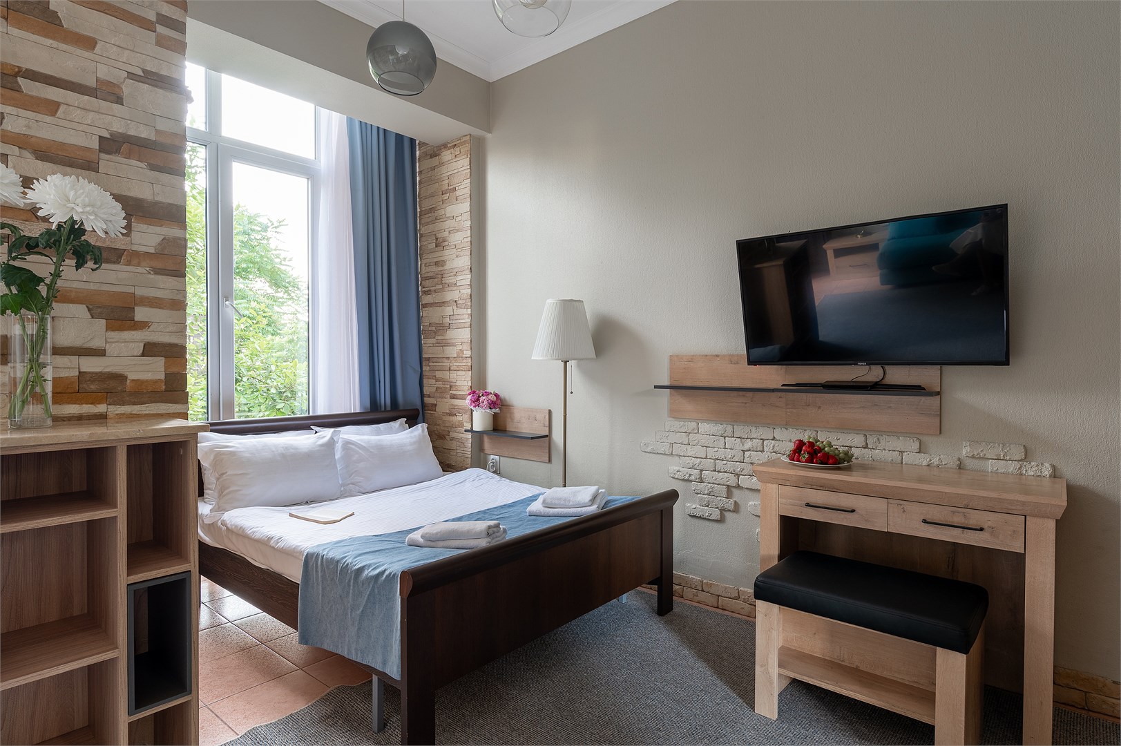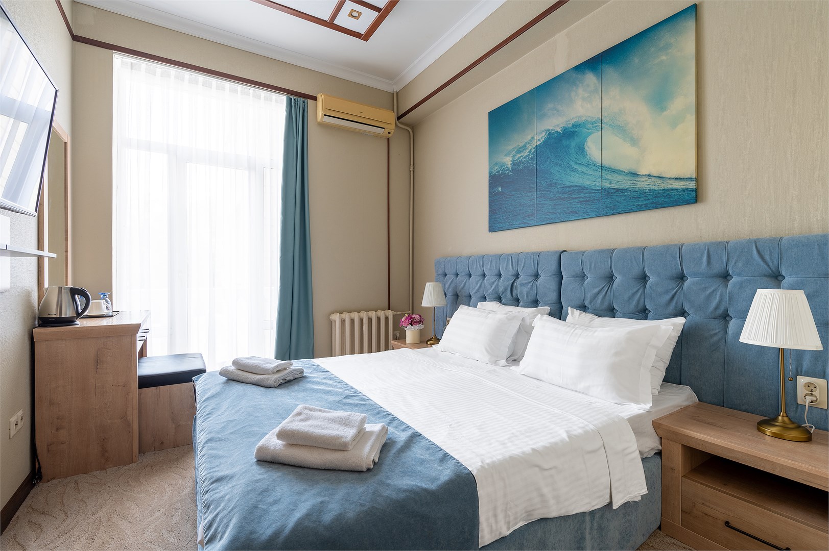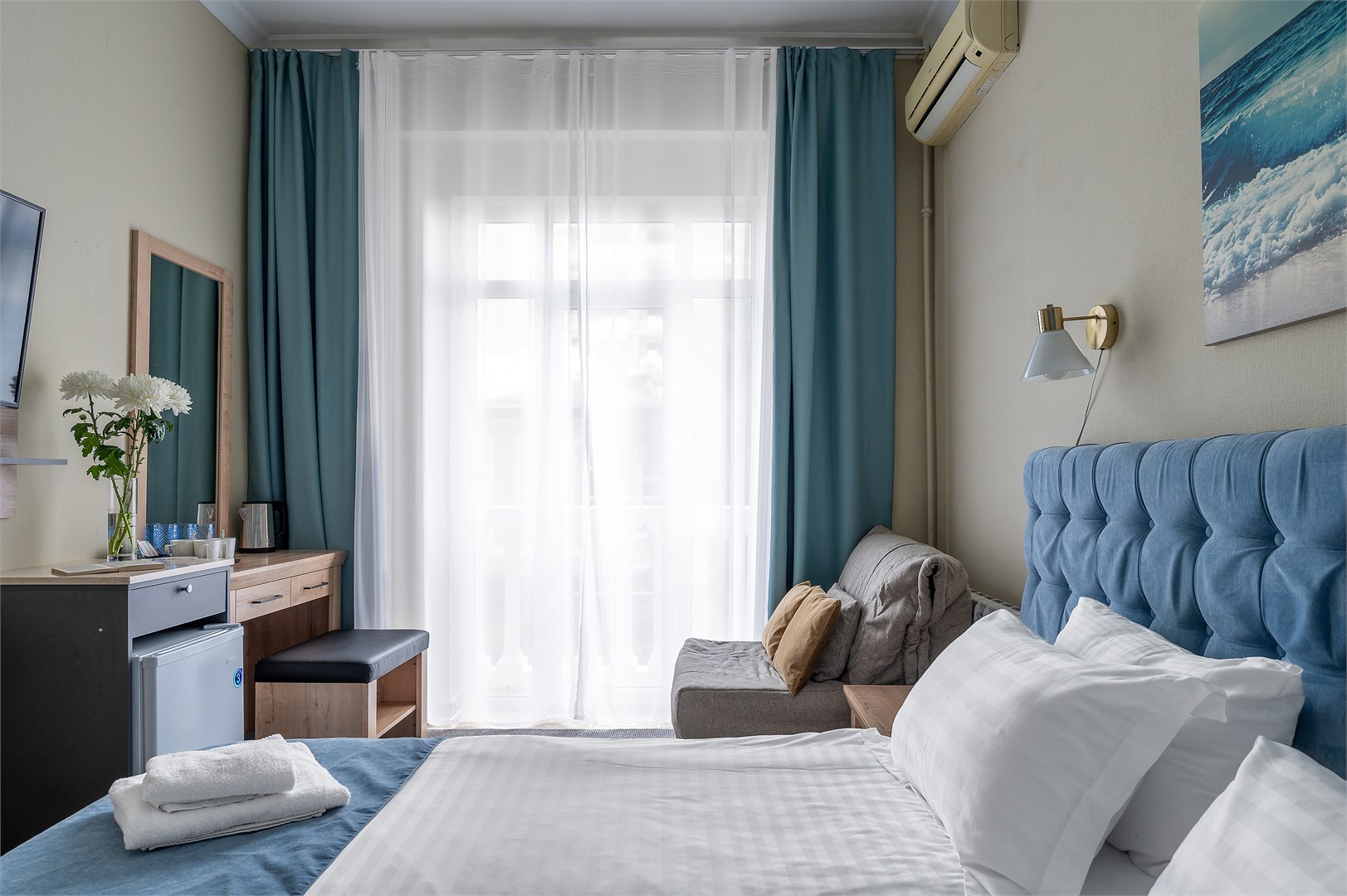 В номере: вешалка, зеркало, кресло-кровать, кровать двуспальная, прикроватные тумбочки, стол, стул, шкаф, кондиционер, мини-холодильник, телевизор, чайник, чайный набор посуды